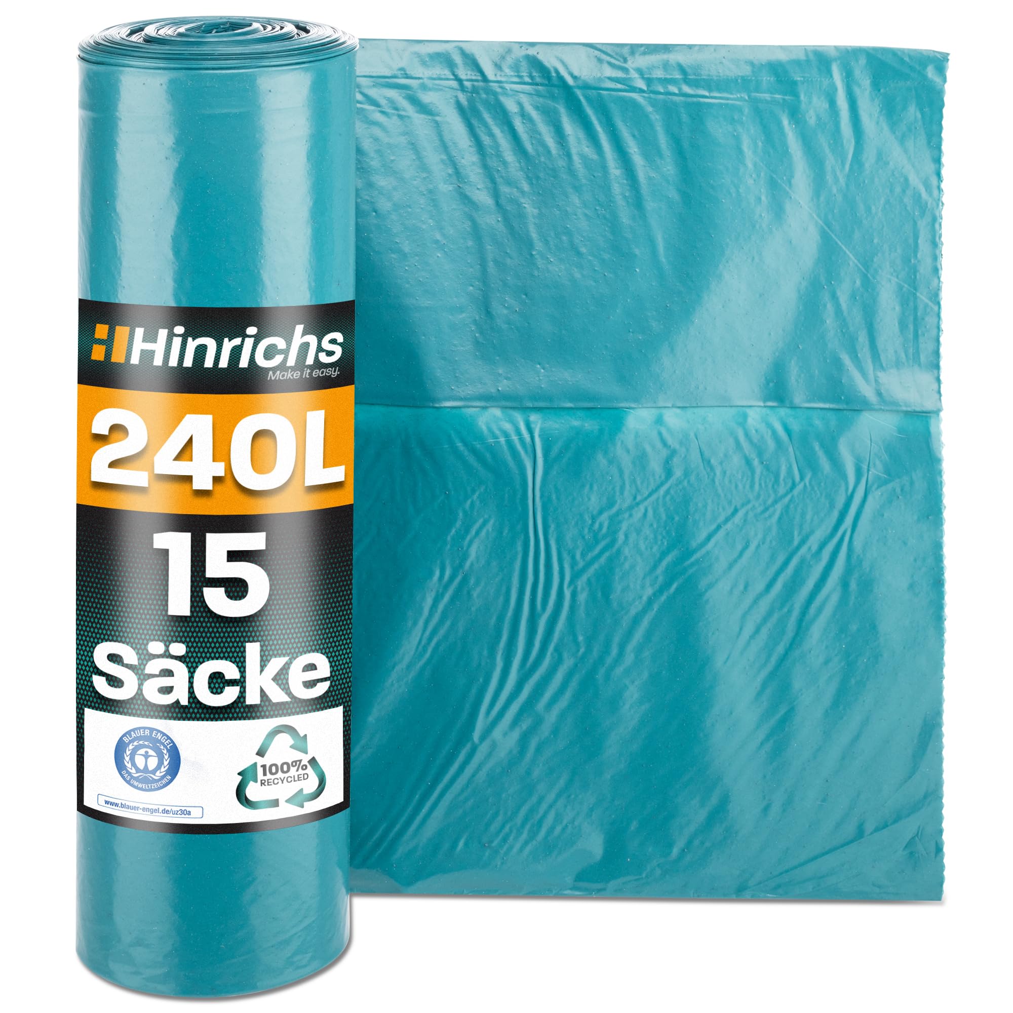 Hinrichs Müllsäcke 240L extra Stark - 15er Rolle - 100x125 cm - Extrem reissfeste Müllbeutel - Mülltüten aus Recycling LDPE - Blaue Säcke - Abfallsäcke für Garten, Haushalt & Baustelle