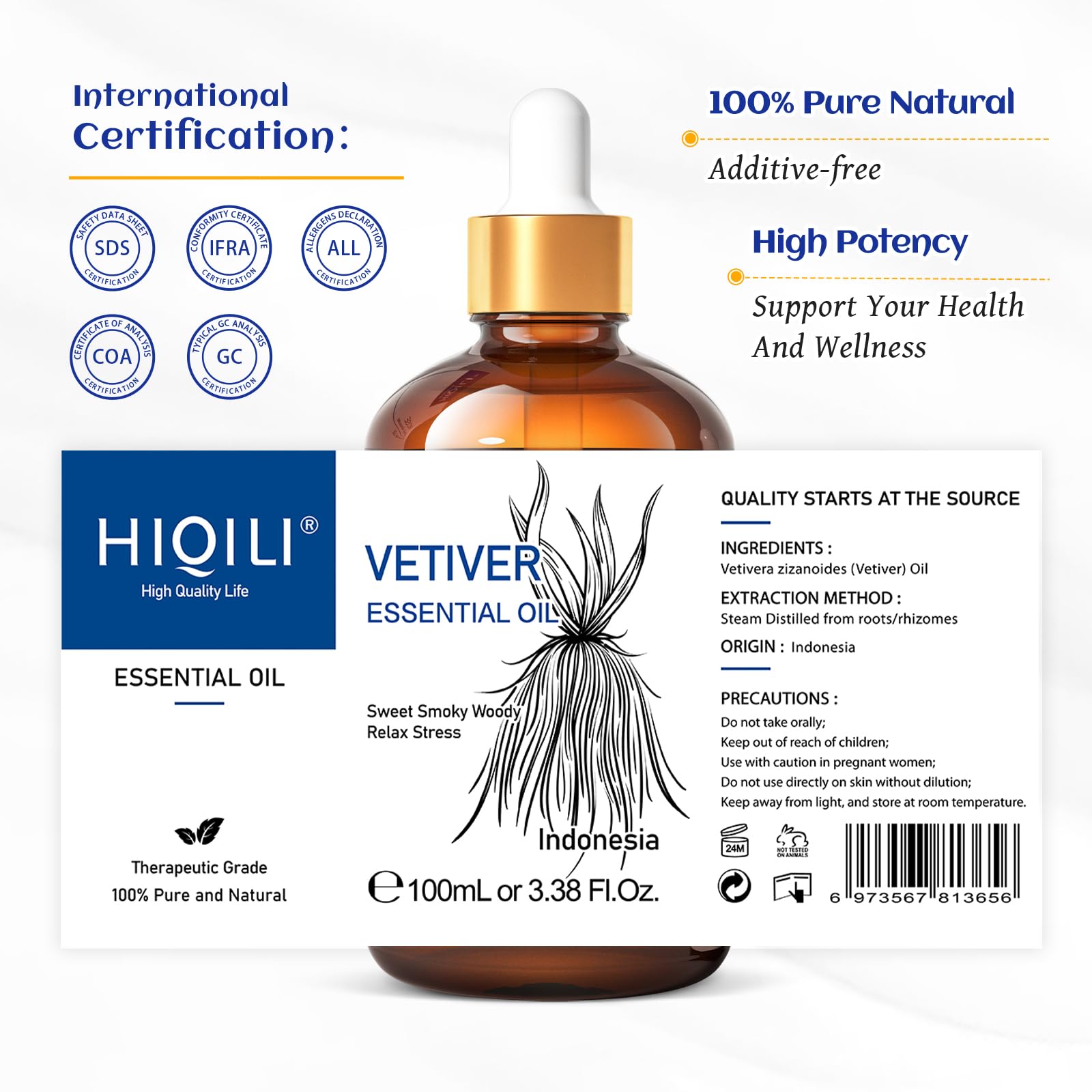 HIQILI 100ml Vetiver Ätherisches Öl, 100% Naturrein Vetiver Öl für Diffuser, Haare, Gesicht, Inklusive Reiseflasche