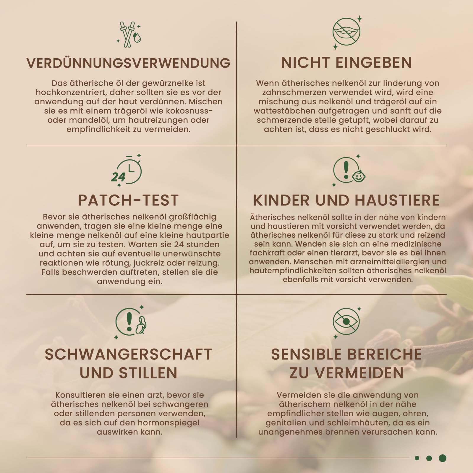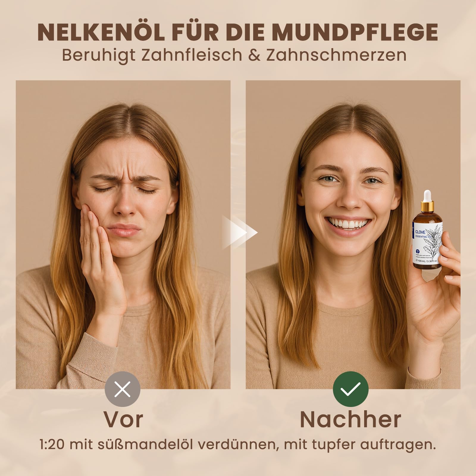 • Vielseitige Verwendung: Ätherisches Nelkenöl lindert Zahnschmerzen, erfrischt den Atem und lindert empfindliches Zahnfleisch. Sie können es auch verwenden, um Ihren eigenen Lufterfrischer oder Hausduft herzustellen, um das Aroma der Gewürznelken zu geniessen