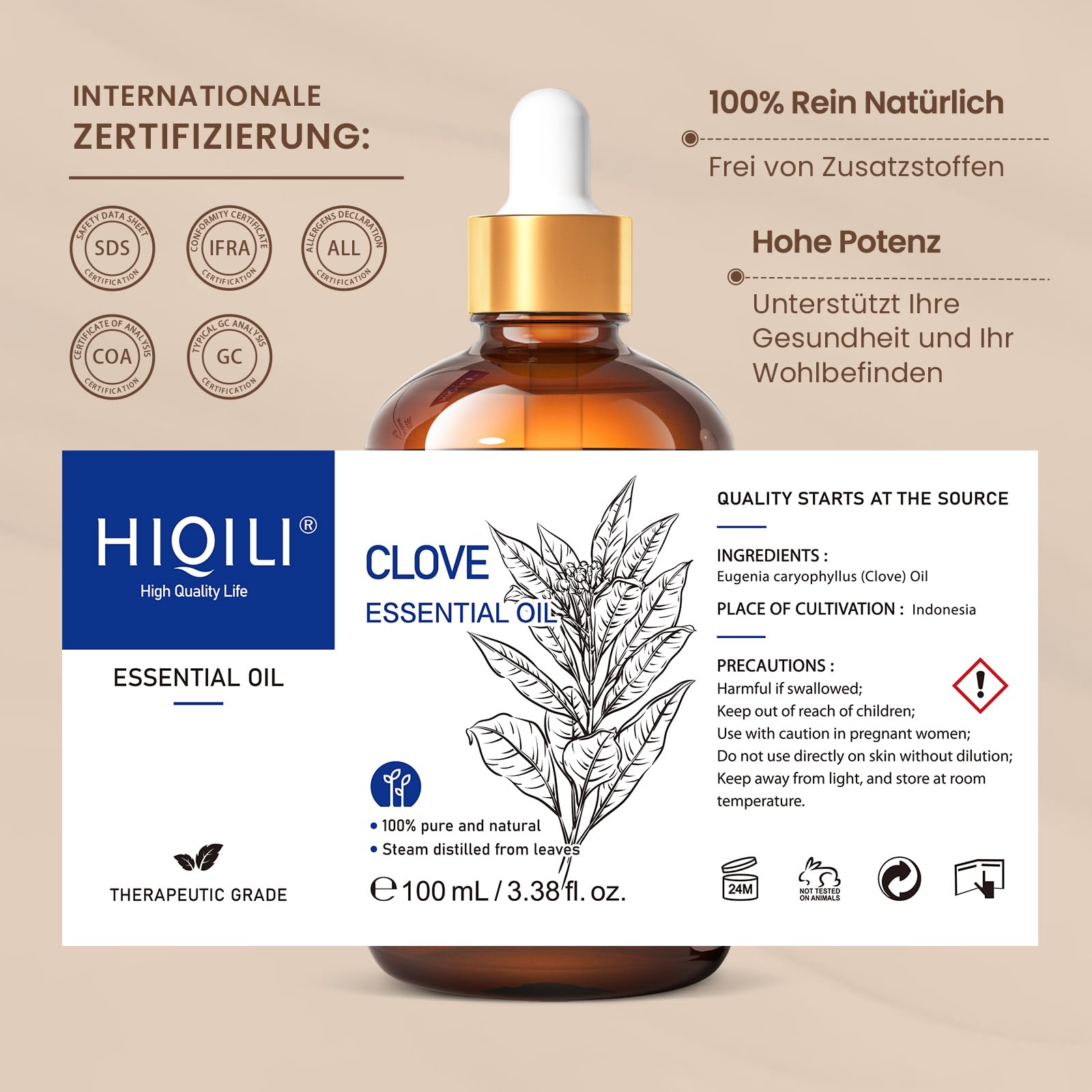HIQILI Nelkenöl 100ml, 100% Reines Naturreines, Ätherisches Aromatherapie Öl, Duftöle für Aromatherapie,Diffusor, Luftbefeuchter,Hautpflege, Entspannen,Home,DIY