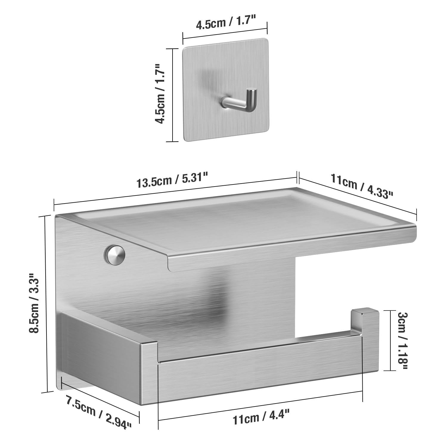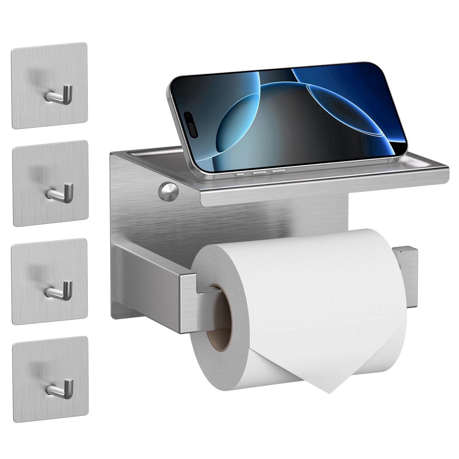 HITSLAM Toilettenpapierhalter Ohne Bohren mit 4 Klebehaken, Edelstahl Selbstklebend Klopapierhalter mit Ablage, Wc Papier Halterung Rollenhalter Wandmontage mit Kleber für Badzimmer Silber