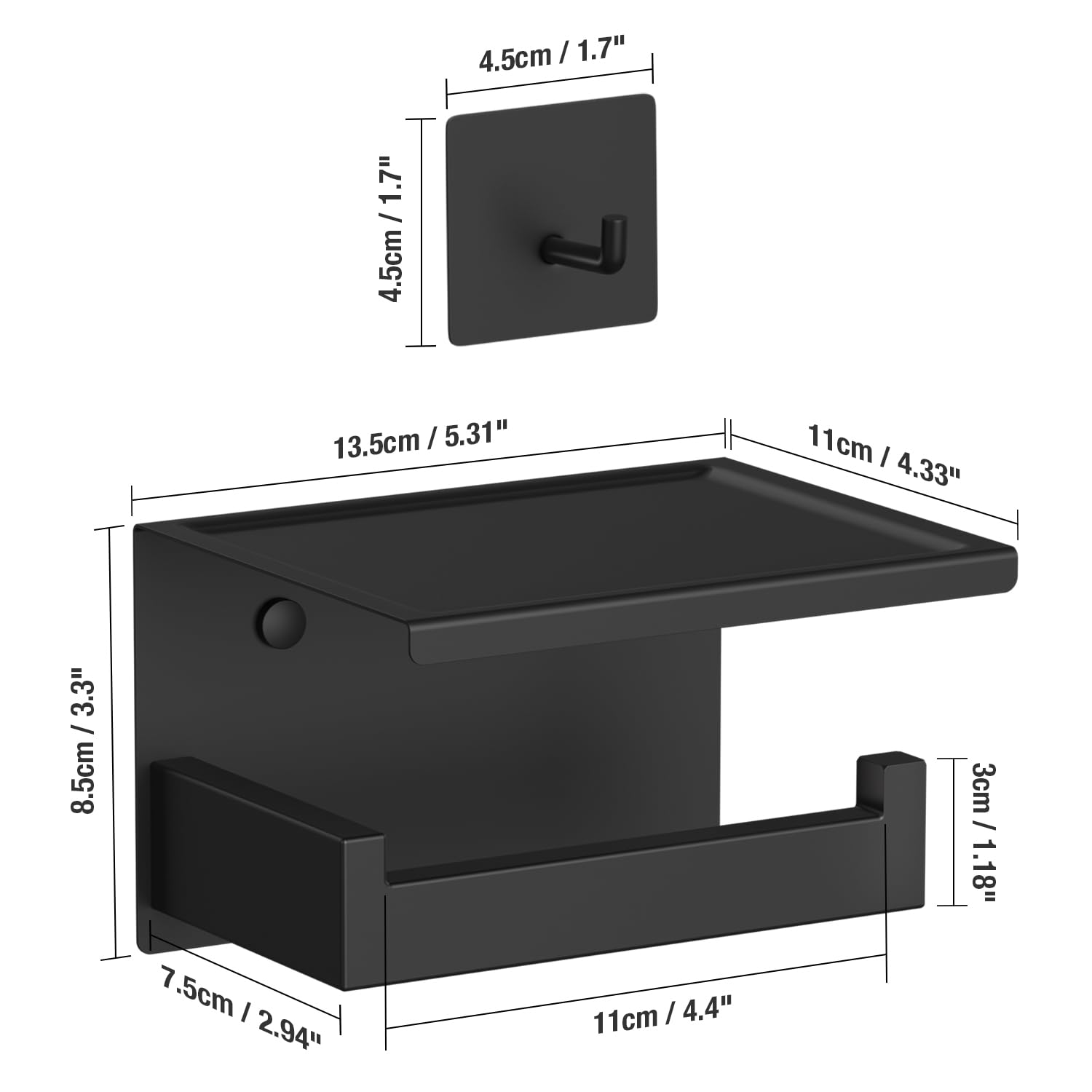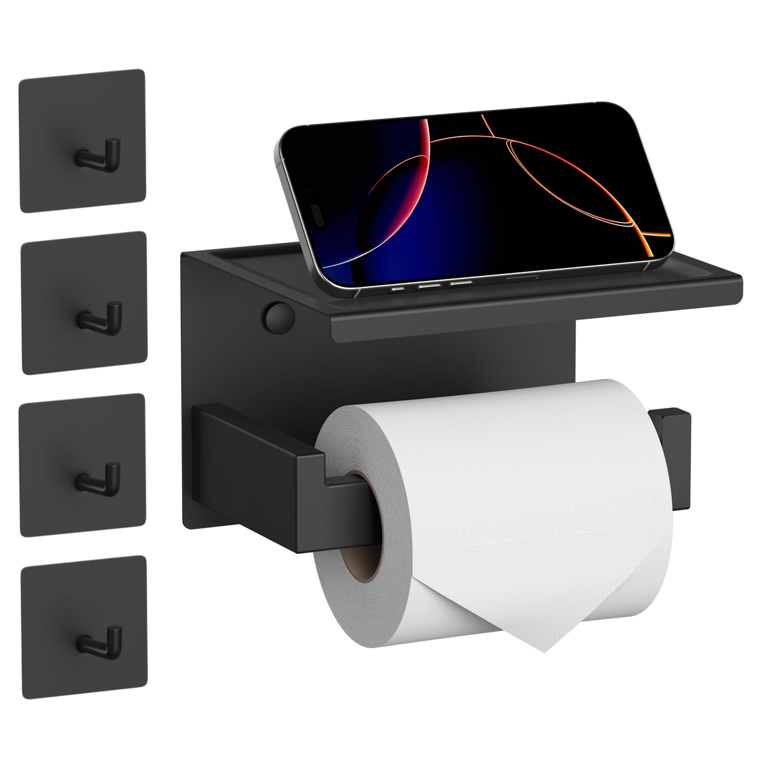 HITSLAM Toilettenpapierhalter Ohne Bohren mit 4 Klebehaken, Edelstahl Selbstklebend Klopapierhalter mit Ablage, Wc Papier Halterung Rollenhalter Wandmontage mit Kleber für Badzimmer Schwarz