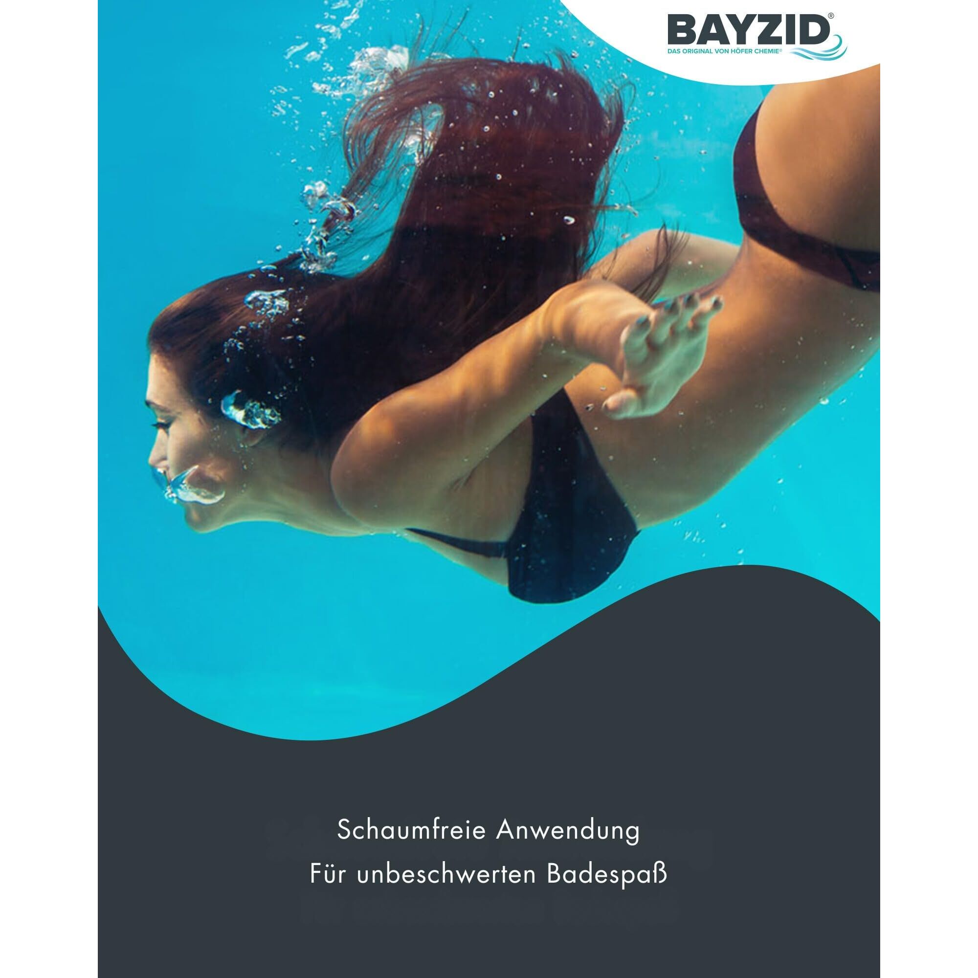 "Geniessen Sie den Sommer im eigenen sauberen Pool. Nutzen Sie Algenvernichter, der gewissenhaft Algen, Bakterien und Pilze im Wasser beseitigt. Nach der Behandlung mit diesem wirkungsvollen Biozid wird das Wasser rein und hygienisch sauber sein. Gebrauch bei Erstbehandlung: 70 - 140 ml pro 10 m³, je nach Wetterlage Gebrauch bei mehrmaliger Behandlung: 25 - 50 ml pro 10 m³, je nach Wetterlage bekämpft alle Algentypen (einzellig und mehrzellig) wirksam gegen Vermehrung von Bakterien und Pilzen schaumfrei 1 x 10 L Algenvernichter erleichtert die Poolpflege Die wirksame Unterstützung gegen alle Algentypen Der Algenvernichter BAYZID ist ein hochwertiges Biozid für die Pflege Ihres privaten Schwimmbads. Der Algenvernichter ist ein Qualitätsprodukt, hergestellt in Europa von Höfer Chemie. Er ist absolut schaumfrei und bietet Ihnen tatkräftige Unterstützung bei der Bekämpfung von Algen. Ob ein- oder mehrzellige Algen, das Mittel wirkt gegen alle Algentypen und beseitigt auch Bakterien und Pilze im Wasser. Klares und sauberes Wasser in Ihrem Pool Sie erhalten einen Kanister mit 10 L Algenvernichter und können davon bei dem ersten Gebrauch je nach Wetterlage pro 10 m³ 70 ml bis 140 ml einsetzen. Bei mehrmaligem Gebrauch verwenden Sie 25 ml bis 50 ml. Mit diesem 10 L Algenvernichter werden Sie schon bald das ansehnliche Ergebnis bewundern können. Das Wasser in Ihrem Pool wird wieder klar und hygienisch sauber sein.