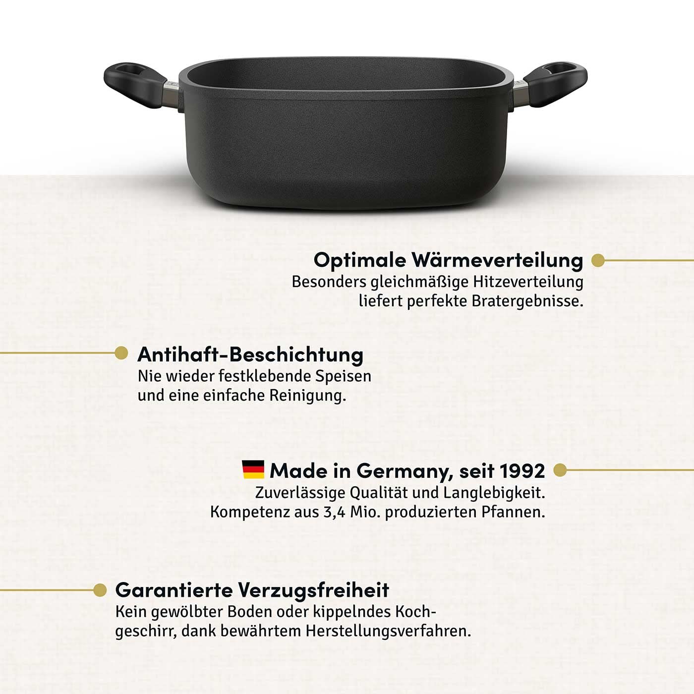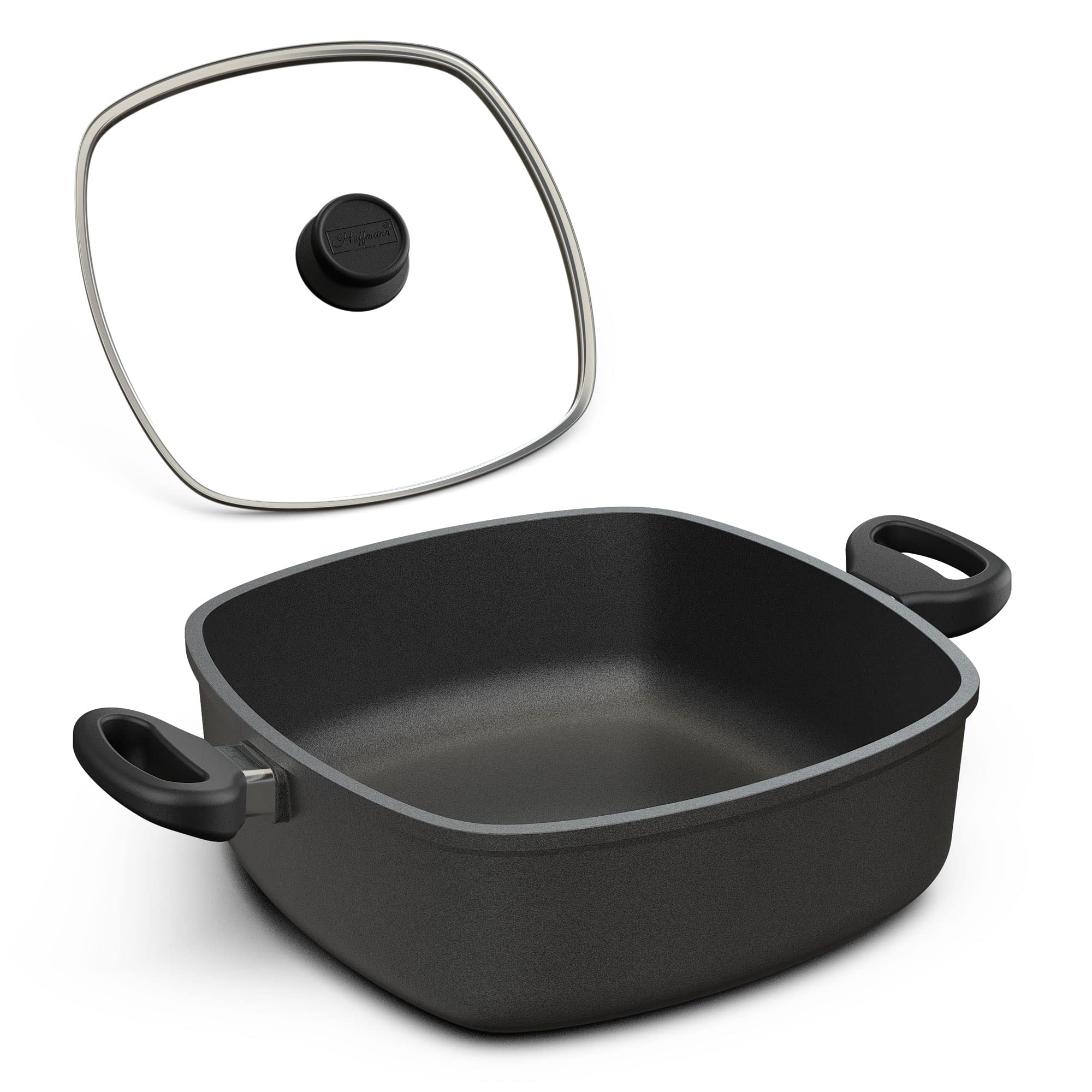Hoffmann Schmorkasserolle 28x28 cm Induktion Viereckpfanne I Made in Germany I Servierpfanne Eckig I Gussbräter I Viereckbräter mit Glasdeckel Bräter Schmorpfanne Induktionsgeeignet Backofengeeignet
