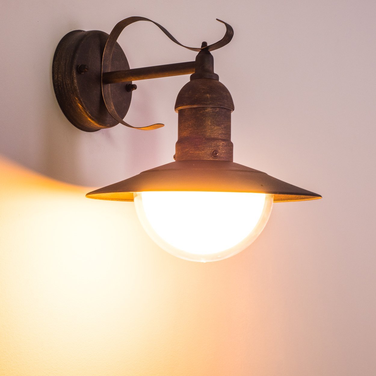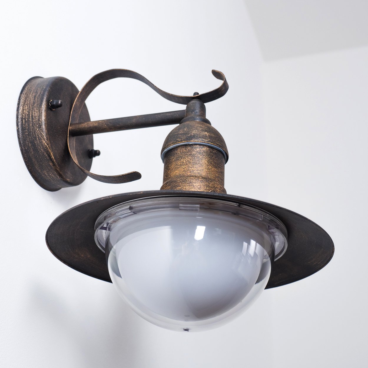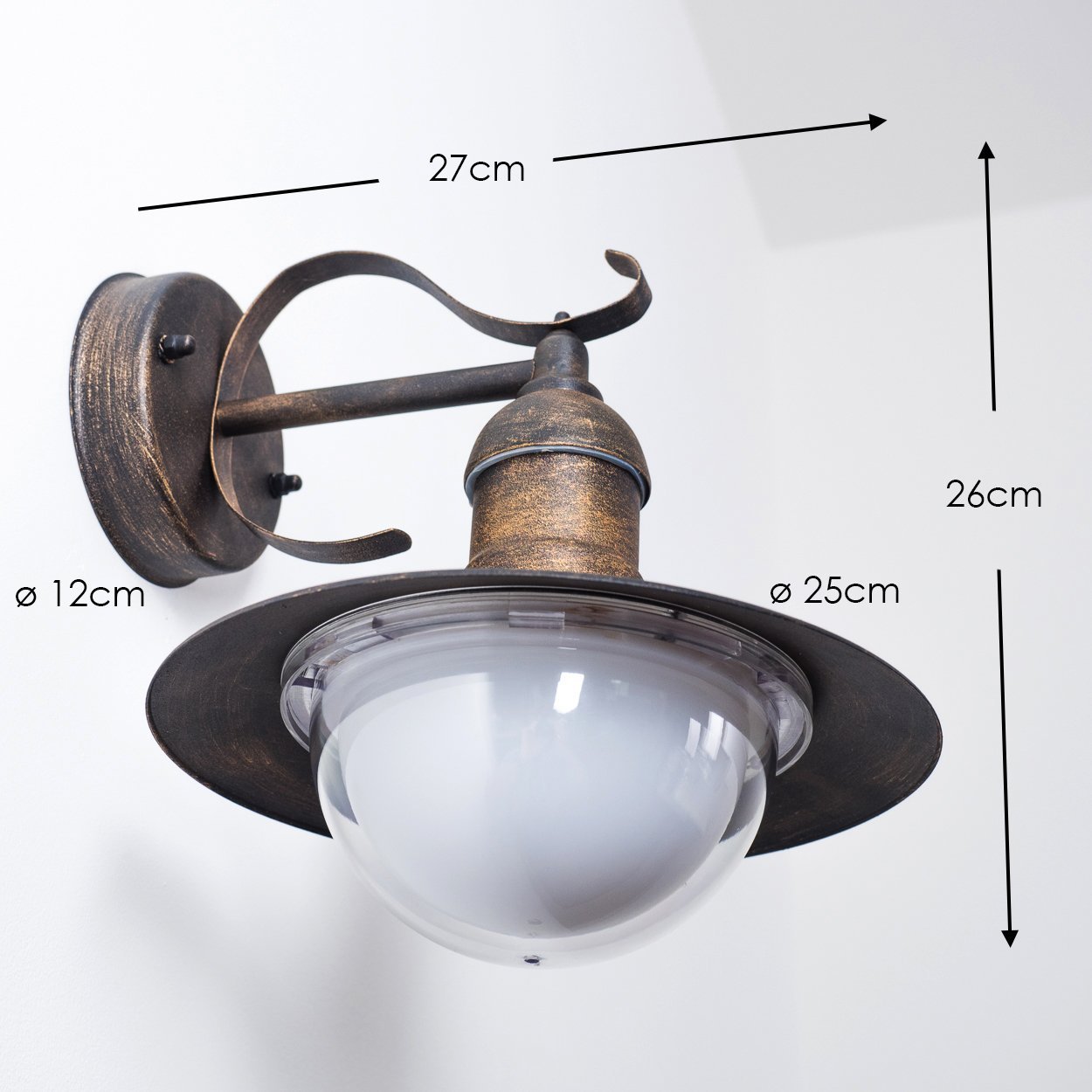 Diese Aussen Wand Beleuchtung ist genau das richtige für Sie, wenn Sie nach einem echten Hingucker für Ihre Fassade suchen. Durch das geschwungene Design und die Retro Farben Gold und Braun könnte sie ein Zeitreisender sein, der schon viele Jahre und Geschichten miterlebt hat. Sie können die Aussen Wandbeleuchtung ganz einfach über die mitgelieferte Befestigung an Ihrer Fassade anbringen. Ein Leuchtmittel gehört nicht zum Lieferumfang. Sie entscheiden zwischen LED Lampen, Eco Halogen Leuchtmitteln, Energiesparlampen und herkömmlichen Leuchtmitteln. Die Aussenleuchte ist absolut wetterfest, so dass Sie lange Freude daran haben werden.Fassung/Leuchtmittel: 1 x E27 max. 60 Watt (ohne Leuchtmittel) Geeignet für: LED Leuchtmittel, Eco-Halogen Leuchtmittel, Energiesparleuchtmittel, herkömmliches Leuchtmittel Material der Leuchte: Metall Farbe der Leuchte: braun-gold Material des Schirms: Kunststoff Farbe des Schirms: weiss Durchmesser Leuchte: 25 cm Höhe: 26 cm Ausladung: 27 cm Durchmesser Aufhängung: 12 cm Schutzklasse: IP44