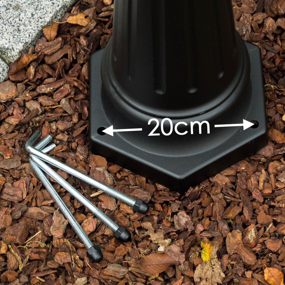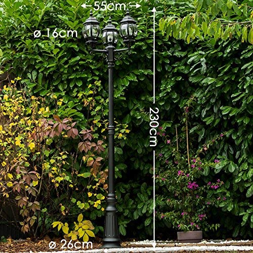 Entdecken Sie die exquisite Aussenleuchte Kobe von HOFSTEIN, eine perfekte Ergänzung für Ihren Garten oder Aussenbereich. Diese beeindruckende Kandelaberleuchte vereint funktionales Design mit einem antiken Look und bietet eine elegante Beleuchtungslösung für anspruchsvolle Umgebungen. Der Korpus besteht aus hochwertigem Aluguss in Schwarz, die Gläser sind aus robuste Kunststoff-Scheiben gefertigt. Die robuste Materialkombination aus Metall und Kunststoff ist absolut wetterfest und tritt jedem Herbststurm sicher entgegen.Mit einer stattlichen Höhe von 230 cm erhellt die Kobe nicht nur Ihren Garten, sondern setzt auch stilvolle Akzente als Gartenlaterne für draussen. Die E27-Fassung ermöglicht Ihnen die Wahl der passenden Leuchtmittel, sodass Sie die Lichtstimmung individuell anpassen können. Diese Gartenbeleuchtung ist nicht nur funktional, sondern auch wetterfest mit einer Schutzart von IP44.Ob als Garten Stehlampe, aussen- Mastleuchte oder Strassenlaterne, die 3-armigen Wegeleuchte beeindruckt durch ihre Vielseitigkeit. Das zeitlose Design im Landhausstil fügt sich nahtlos in jede Umgebung ein, sei es als aussen Standleuchte am Hauseingang oder als 3 flammig kandelaber in Ihrem Garten. Diese vintage Laterne ist in einem eleganten Schwarz gehalten und strahlt einen Hauch von Nostalgie aus, der Ihre Aussenbereiche in ein warmes Licht taucht. Die Kobe Laterne ist nicht nur eine Gartenlampe, sondern auch ein stilvolles Statement, das Ihre Aussenbereiche aufwertet. Sie ist ideal als aussen Wegeleuchten, um Wege sicher zu erhellen, oder als Gartenlampe, die beeindruckende Lichtakzente setzt. Diese Stehlaterne ist die perfekte Wahl für alle, die Wert auf Design und Funktionalität legen. Erleben Sie die perfekte Symbiose aus Ästhetik und Praktikabilität mit der HOFSTEIN Aussenleuchte Kobe welche gerne an Hausecken und Eingangsbereichen steht, um Besucher zu empfangen. Marke HOFSTEIN