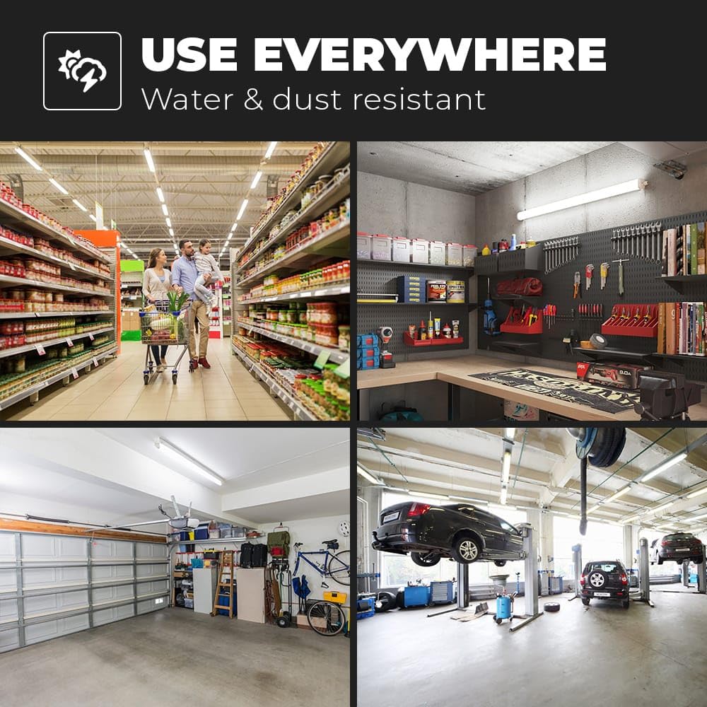 Die hat Tri-proof? Super! Denn Tri-proof heisst, dass diese 120 cm lange LED-Feuchtraumleuchte wasserdicht, staubdicht (IP65) und stossfest ist (IK07). Raues Wetter und Temperaturen von -20 bis +40°C verträgt sie anstandslos, genau wie mal einen anschlagenden Rollcontainer o. Ä. Und schau mal, was sie noch zu bieten hat: Sie blendet nicht und ist augenschonend, flimmerfrei, sensorgeeignet und mit 120 Lumen pro Watt hocheffizient. Die verwendeten LED-Chips neuester Generation bringen es auf 4320 Lumen mit nur 36 Watt. Das ist so viel Licht wie eine herkömmliche 62-Watt-Leuchtstoffröhre, aber du sparst mit der LED-Lampe 40% Strom - gut für die Umwelt und gut für dich: Den ohnehin günstigen Kaufpreis wirst du so nämlich schnell wieder drin haben. Die Farbtemperatur dieser modern designten LED-Wannenleuchten ist ein sehr helles, konzentrationsförderndes Tageslichtweiss (6500 Kelvin = Lichtfarbe 865), das für eine äusserst präzise Sicht sorgt: innen und aussen, in Lager, Fuhrpark und Werkstatt, Fertigungshalle, Supermarkt und Parkplatz oder wo auch immer du erstklassige Beleuchtung brauchst. Die undurchsichtig scheinende Kunststoffhülle sorgt für eine perfekte Lichtverteilung über die gesamte Leuchtenlänge. Bis zu 10 Lampen kannst du miteinander verbinden und so auch grossflächige Objekte perfekt ausleuchten. Die Brenndauer beträgt 25.000 Stunden, im Normalfall also gut 10 Jahre, und wir geben dir 2 Jahre Garantie.