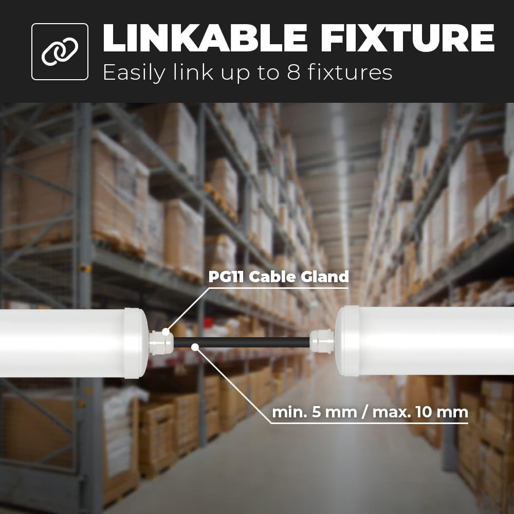 Diese 120 cm lange LED Leuchtstofflampe verbraucht nur 36 Watt und erzeugt 4320 Lumen Licht. Eine Effizienz von 120 Lumen pro Watt. Damit ersetzt diese LED Leuchtstofflampe eine 62-Watt-Leuchtstofflampe. Die LED Leuchtstofflampe ist verknüpfbar, so dass Sie problemlos mehrere LED Leuchtstofflampen miteinander verbinden können. Die LED Leuchtstofflampe strahlt ein neutralweisses Licht von 6500 Kelvin aus. Die ideale Lichtfarbe für die Beleuchtung von Funktionsbereichen wie: Garagen, Scheunen, Werkstätten und Lagerhallen. Die LED-Leuchtstofflampe ist wasserdicht nach IP65 und stossfest nach IK07. Dadurch eignet sich die Lampe auch sehr gut für grossflächige Anwendungen.