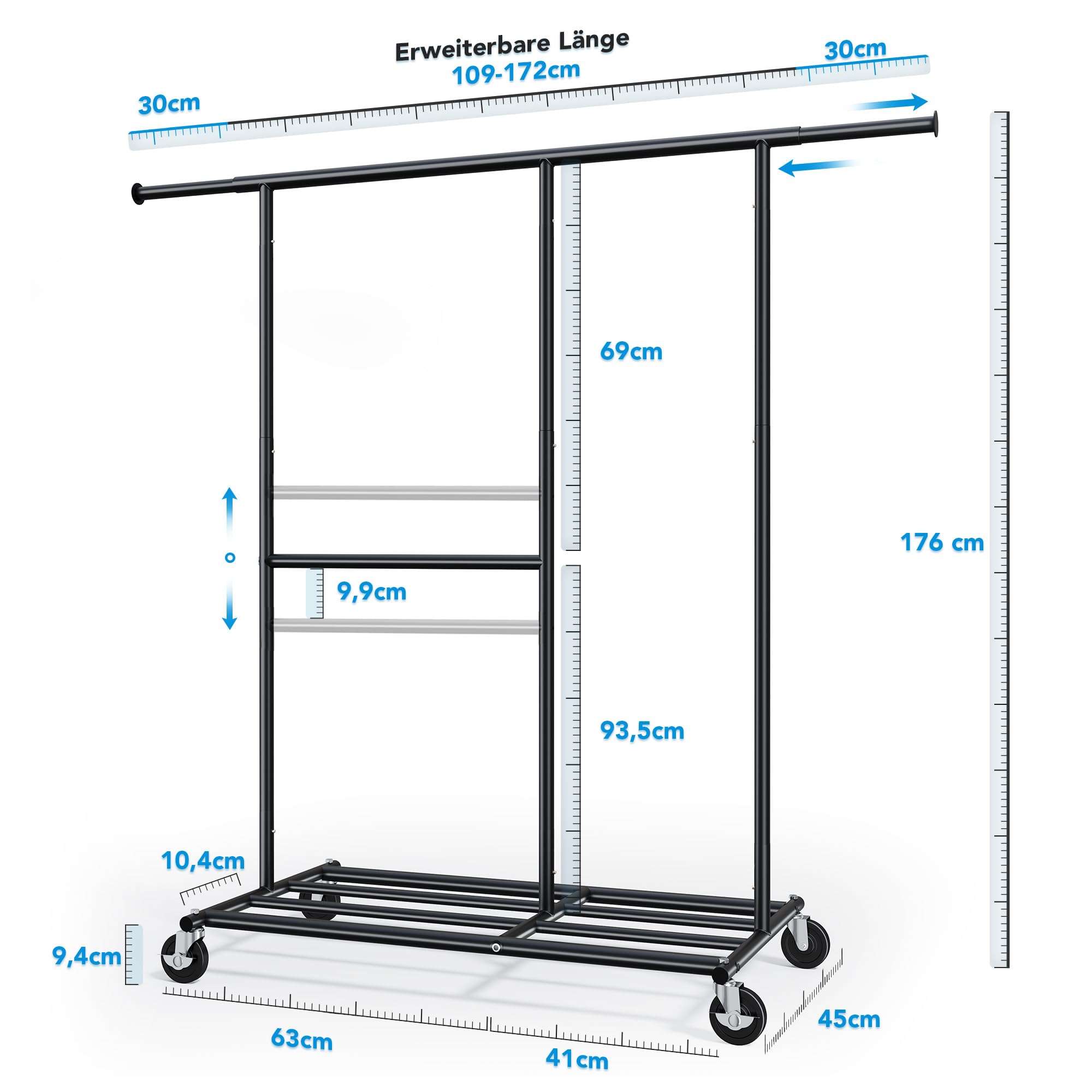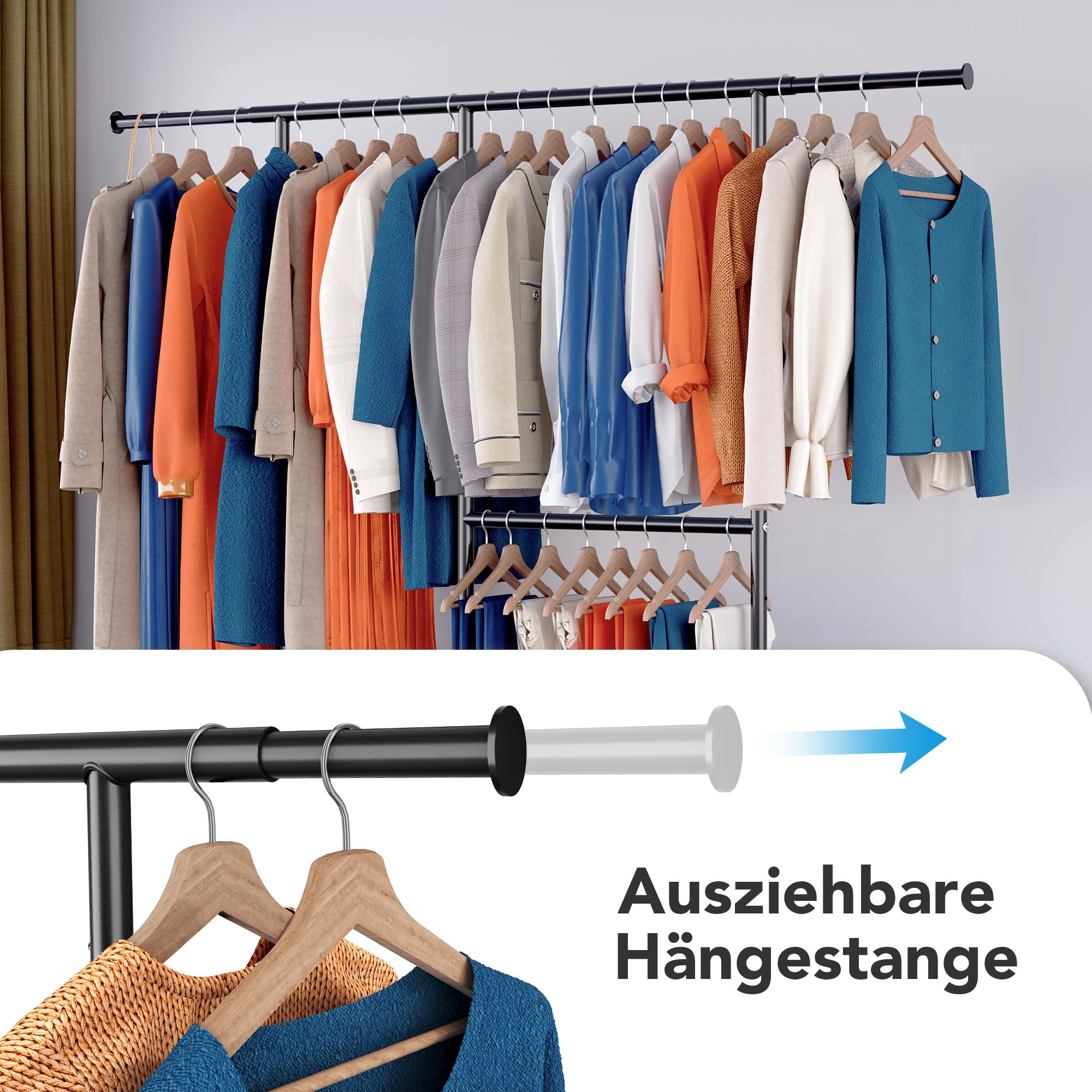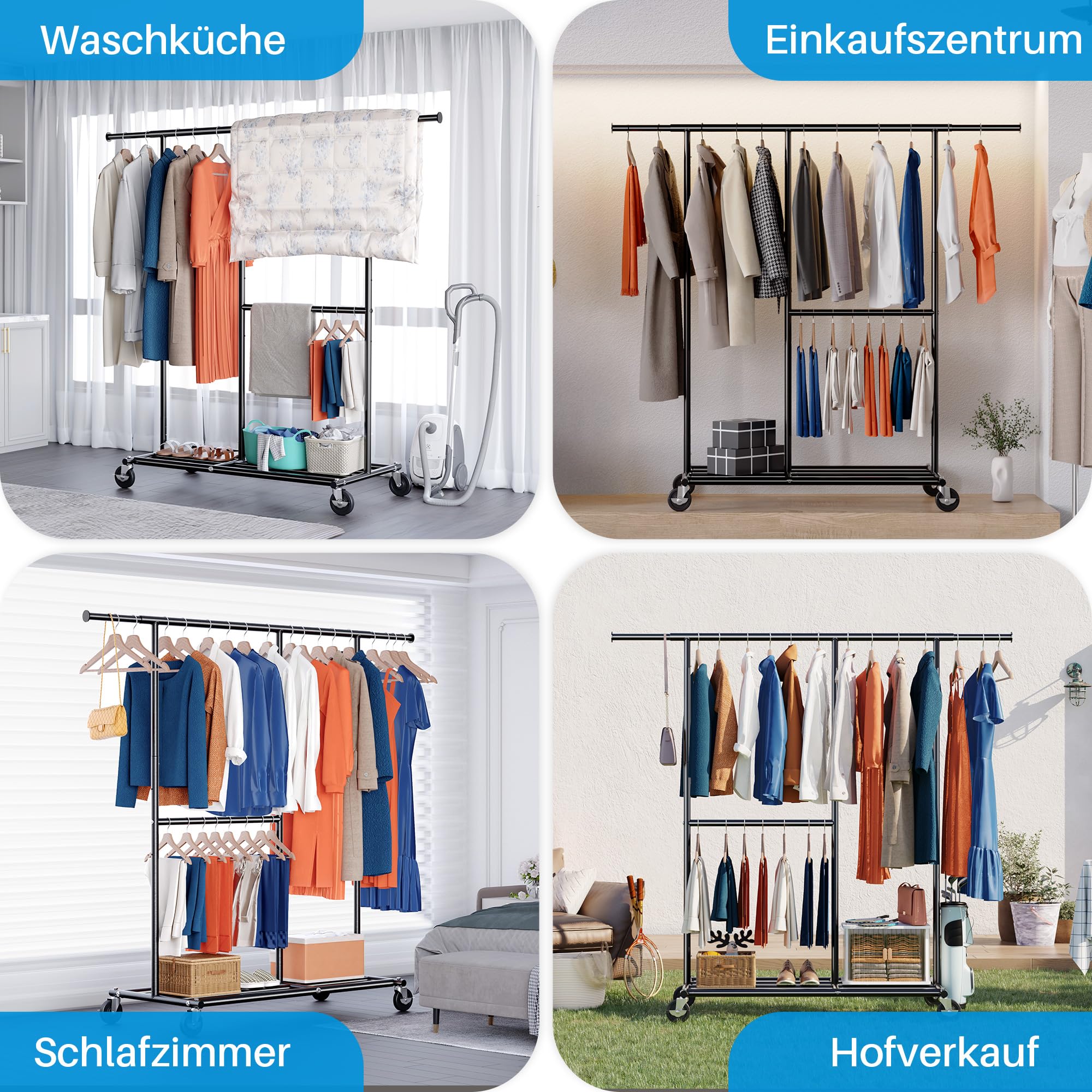 Der HOKEEPER Schwerlast Kleiderständer kombiniert Funktionalität mit robustem Design und bietet eine optimale Lösung für Ihre Kleideraufbewahrung. Aus hochwertigem, verchromtem Stahl gefertigt, besticht dieser Ständer durch seine Langlebigkeit und Stabilität, selbst bei voller Belastung bis zu 150 kg.Eigenschaften und Vorteile:Robuste Konstruktion:Gefertigt aus verchromtem Stahl, ist dieser Kleiderständer besonders widerstandsfähig und ideal für den intensiven Einsatz in Schlafzimmern, Büros oder Geschäften.Erweiterbare Kleiderstange:Die ausziehbare Kleiderstange lässt sich leicht an verschiedene Raumgrössen und Bedürfnisse anpassen, ideal für saisonale Garderobenwechsel. Zweistufiges Design:Mit zwei Ebenen bietet dieser Garderobenständer zusätzlichen Stauraum für eine Vielzahl von Kleidungsstücken und Accessoires. Mobilität:Ausgestattet mit stabilen Rollen, lässt sich der Ständer leicht bewegen und feststellen, perfekt für dynamische Umgebungen.Zusätzlicher Ablageraum: Das untere Gestell eignet sich hervorragend zur Lagerung von Schuhen, Kisten oder weiteren Accessoires, wodurch Ordnung und Übersichtlichkeit gewährleistet werden.Der HOKEEPER Schwerlast Kleiderständer ist die ideale Wahl für jeden, der eine professionelle und strapazierfähige Lösung für die Aufbewahrung von Kleidung sucht. Er fügt sich nahtlos in jedes Raumkonzept ein und hilft Ihnen, Ihre Kleidungsstücke effizient und stilvoll zu organisieren.