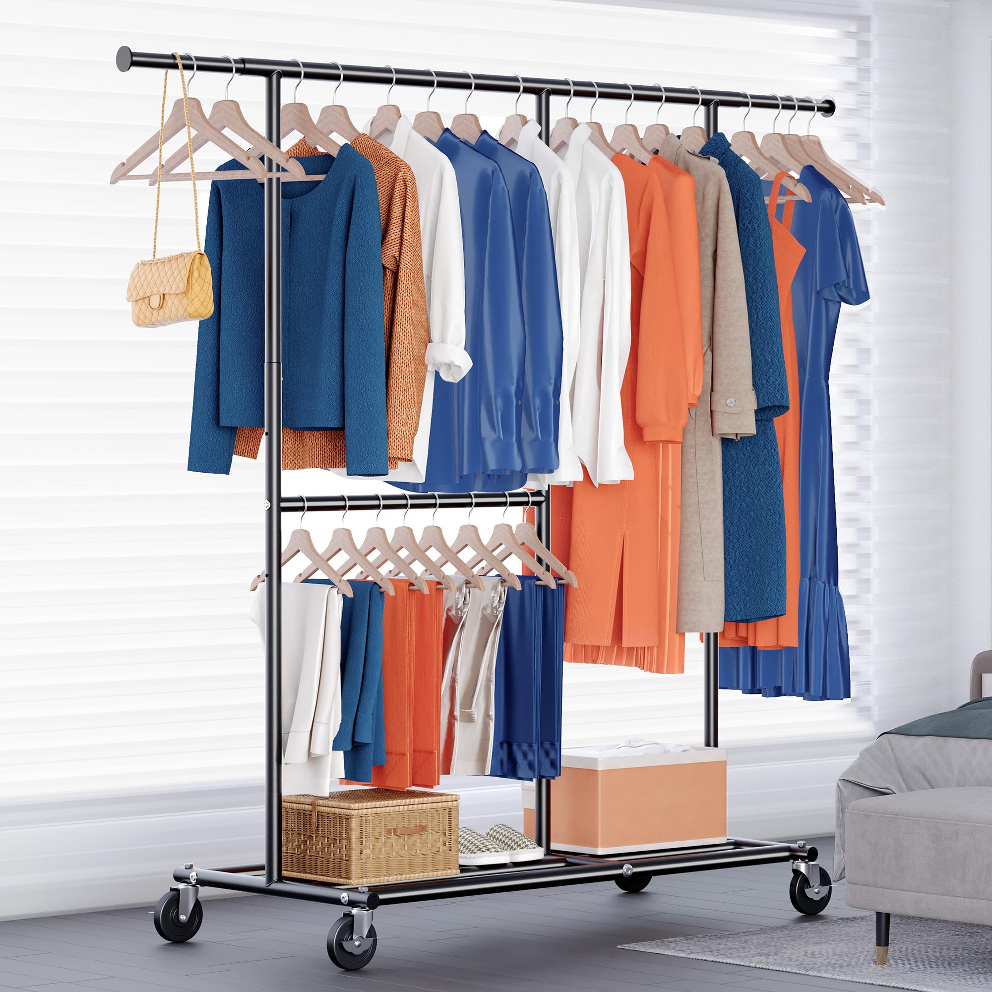 HOKEEPER Schwerlast Kleiderständer auf Rollen, bis 150 kg Belastbarkeit, strapazierfähige Kleiderstange mit Ablageflächen zum Aufhängen, für Schlafzimmer, Büro, Geschäft, verchromter Stahl, schwarz
