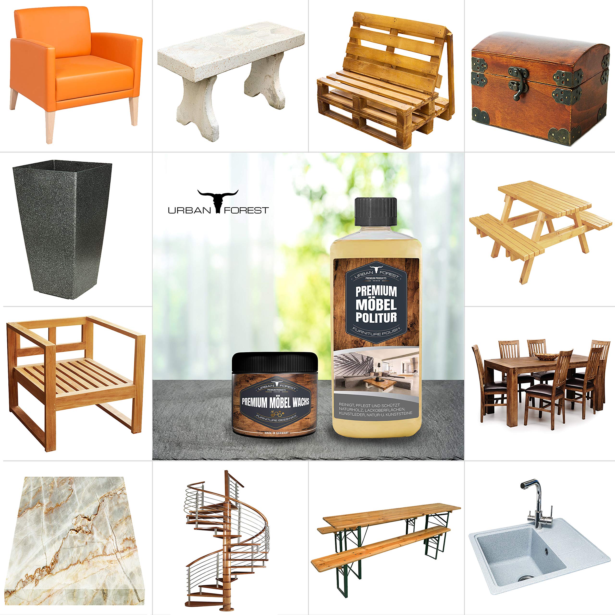 Holzschutz & Möbelpolitur | Möbelpflege für Möbel, Holzoberflächen, Kunststoffoberflächen, Kunstleder, Natur- u. Kunststeine, Lederoberflächen URBAN FOREST (Sparset Wachs+Politur)