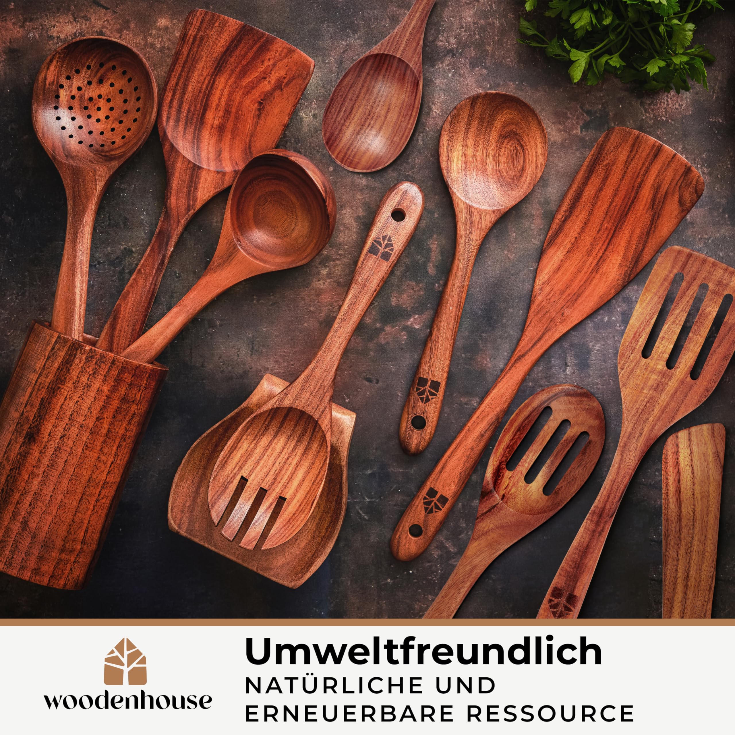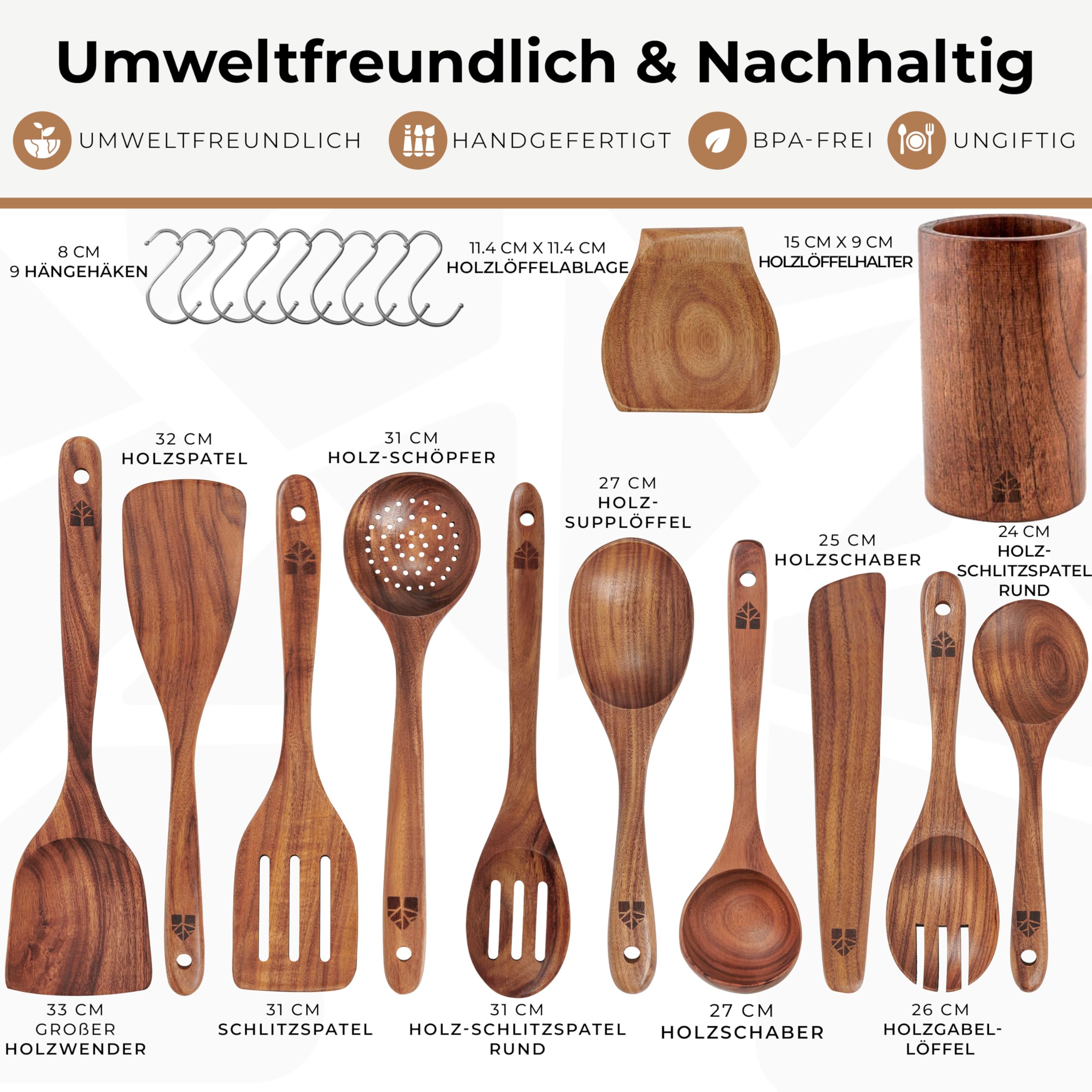 Holz kochlöffel Set 12 Stück aus Teakholz - Robuste Holzlöffel Set mit Halter, Haken und Ablage, Pfannenwender Holz & Kochbesteck - Natürlich & Perfekt für Antihaft, BPA-FREI küchenhelfer
