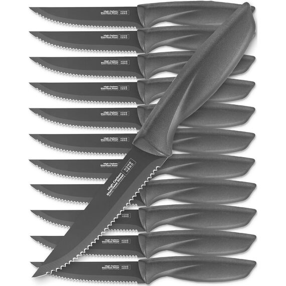 Home Hero Steakmesser Set mit 12 Stück – Klingen aus kohlenstoffreichem Edelstahl – rasiermesserscharfe gezackte Messer – schwarze ergonomische Griffe – 12 Stück, schwarz