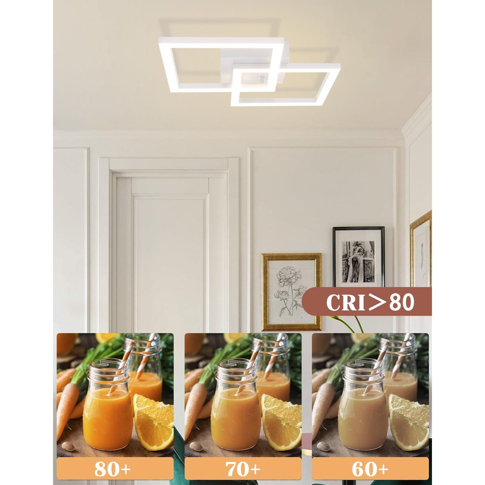 - Deckenleuchtenparameter: Masse: 47 x 29.5 x 6 cm; Spannung: 230 V, Leistung: 24 W; Dimmbar: Nein; Farbtemperatur: 3000K-Warmweiss; Schutzart: IP20, Seitenlänge des Quadrats: 21 cm, Seitenlänge des Deckenmontagetabletts: 13cm. Das geometrische Design erzeugt nicht nur eine perfekte visuelle Wirkung, sondern erhöht auch die Helligkeit im Raum, um Ihr Interieur ideal zu beleuchten und zu dekorieren