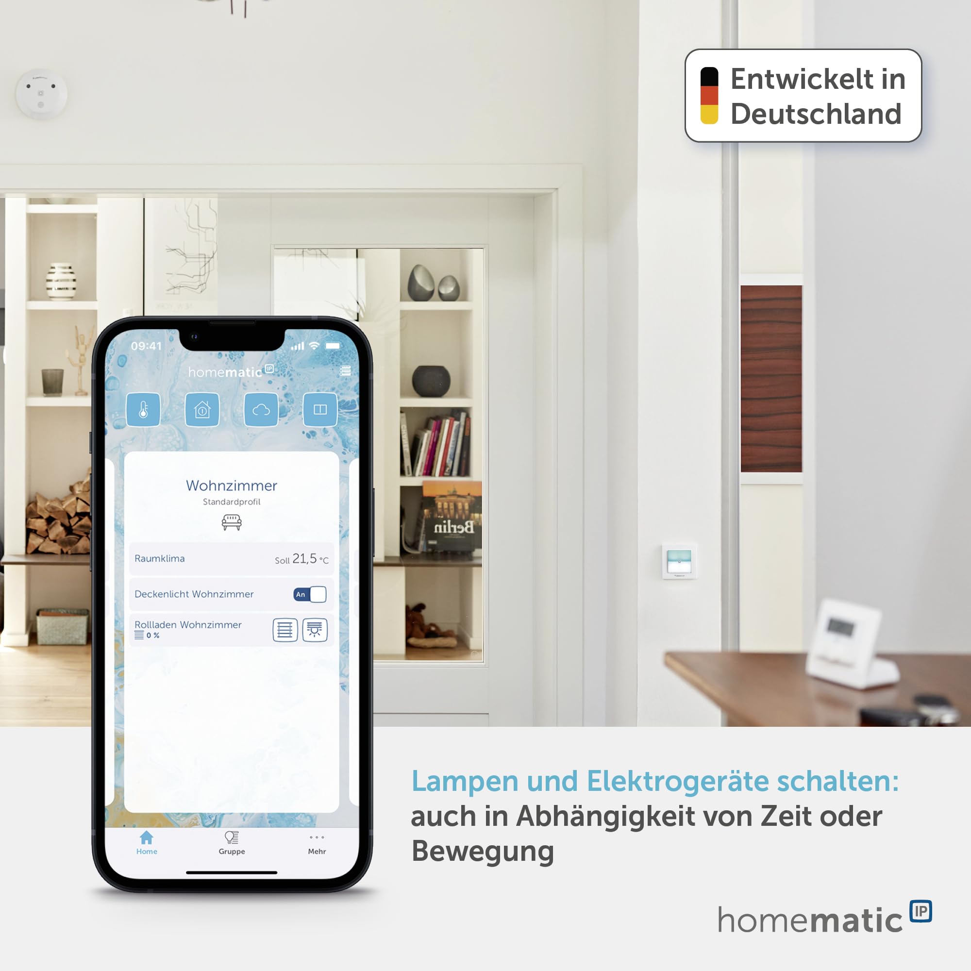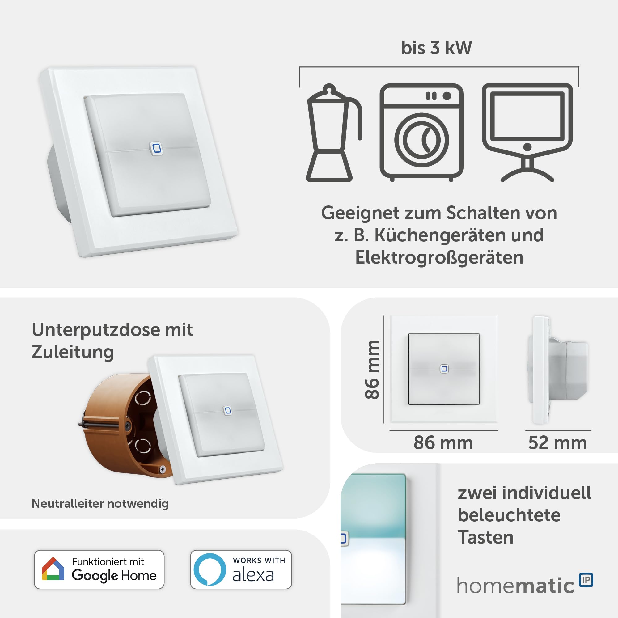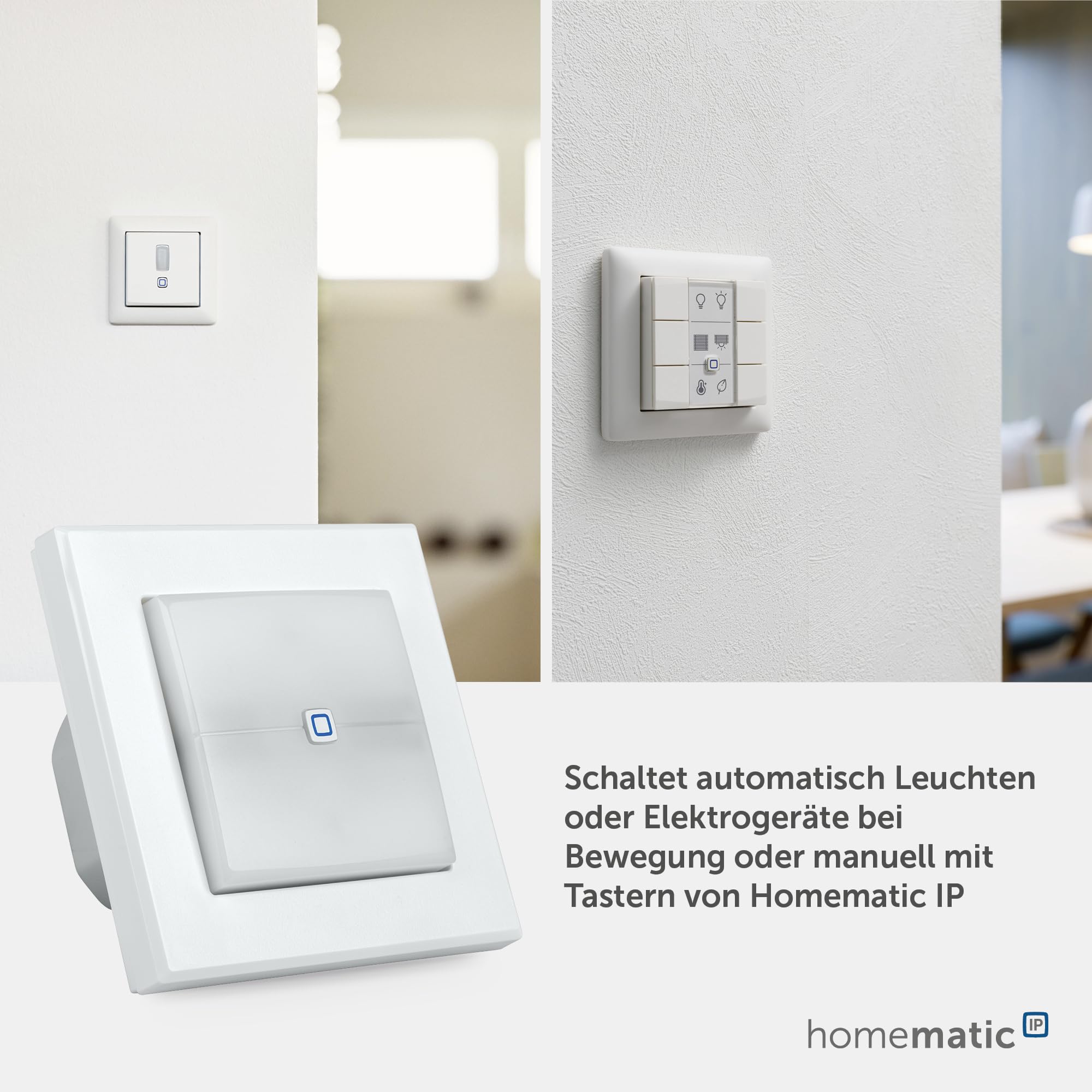 Homematic IP Smart Home Schaltaktor für Markenschalter – mit Signalleuchte, zwei beleuchtete Tasten, steuert Geräte und Leuchten per App, Alexa & Google Assistant, Energie sparen, 152020A0