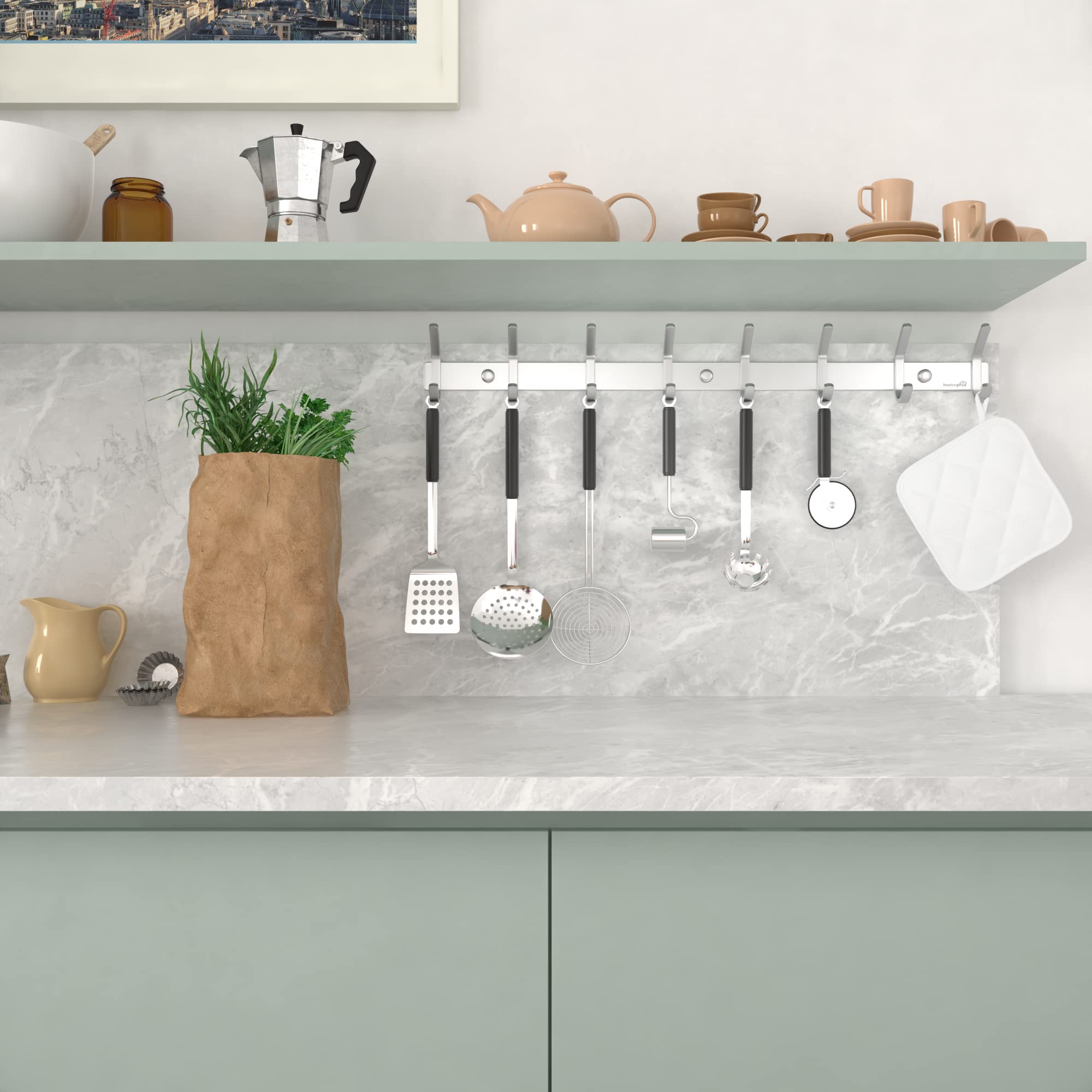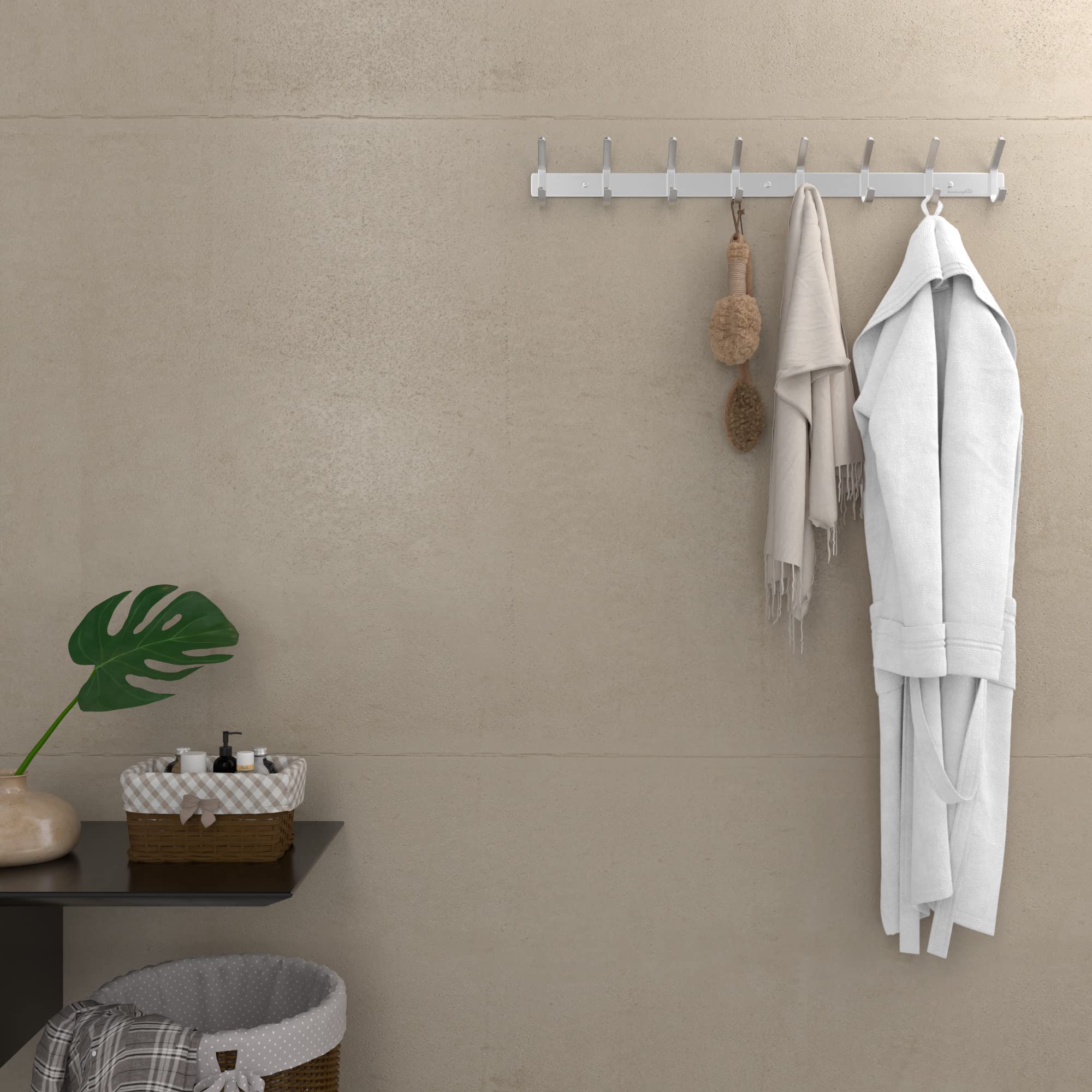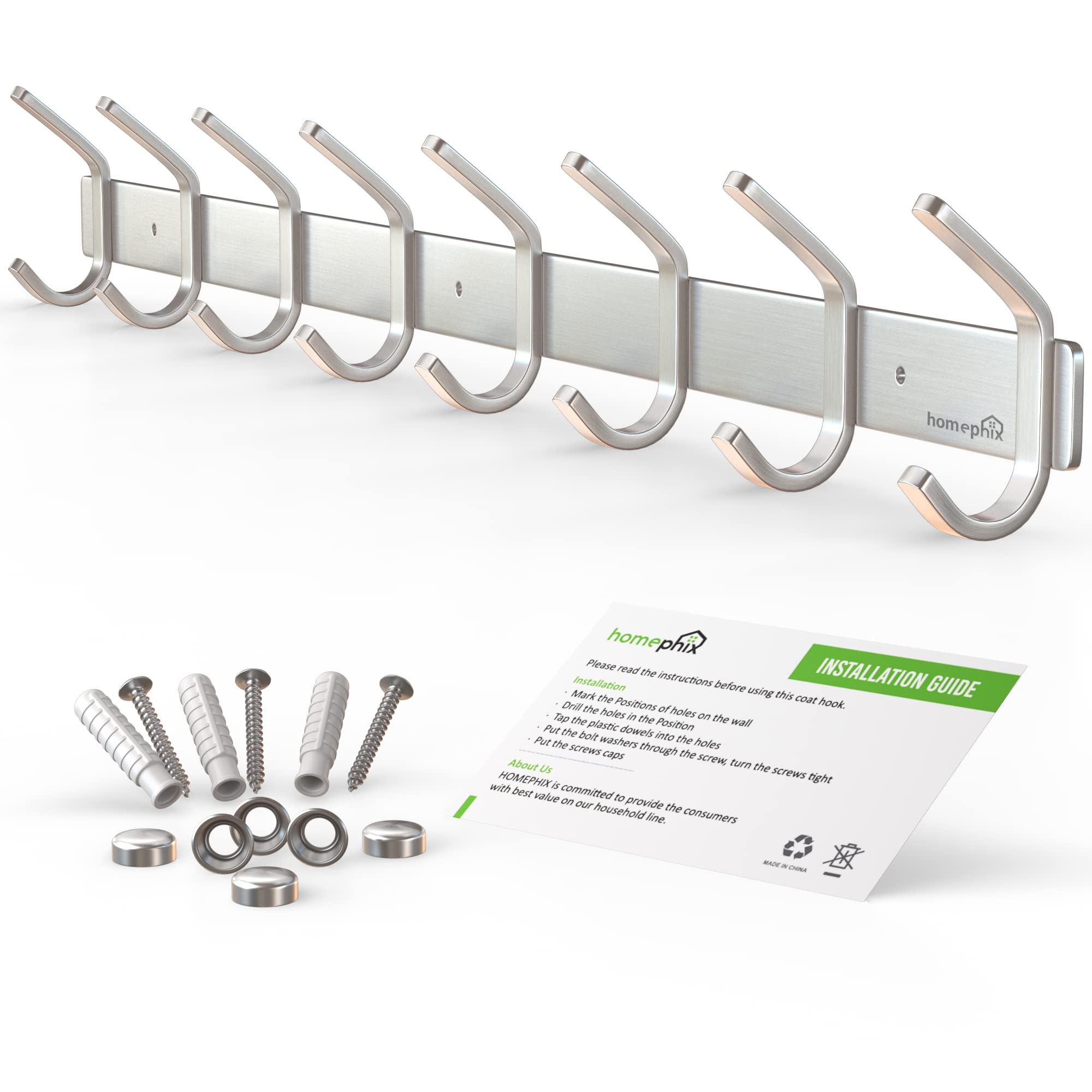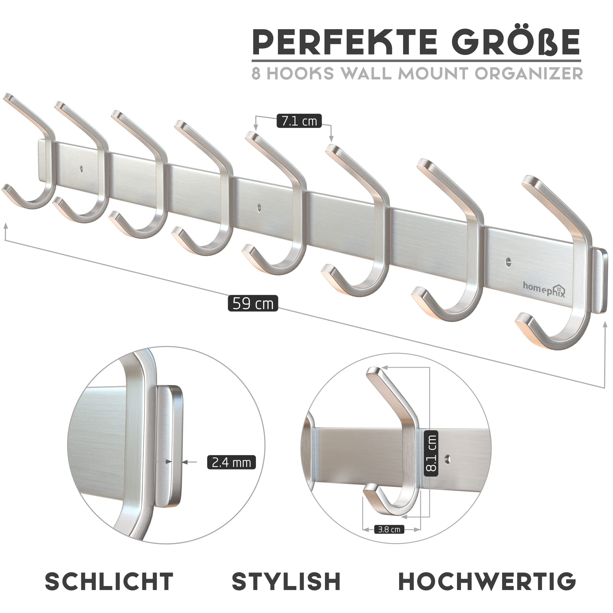 HOMEPHIX Garderobenhaken Edelstahl kleiderhaken gebürstet (1 Stück – 8 Haken, 59cm, Silber)- Hohe Tragkraft Garderobenleiste - Stabile kleiderhaken wand - Garderobenpaneel für Garderoben, Flure, Küche