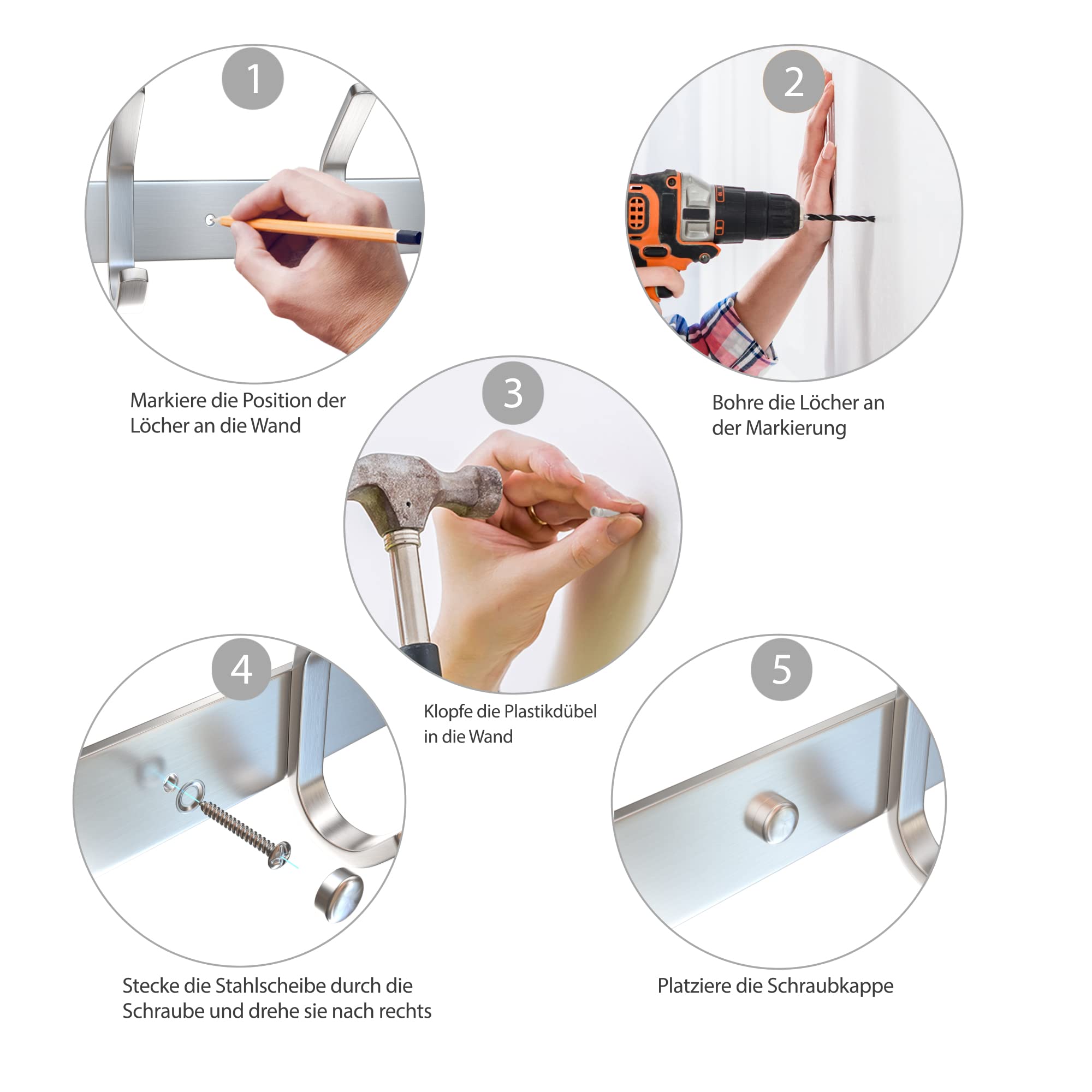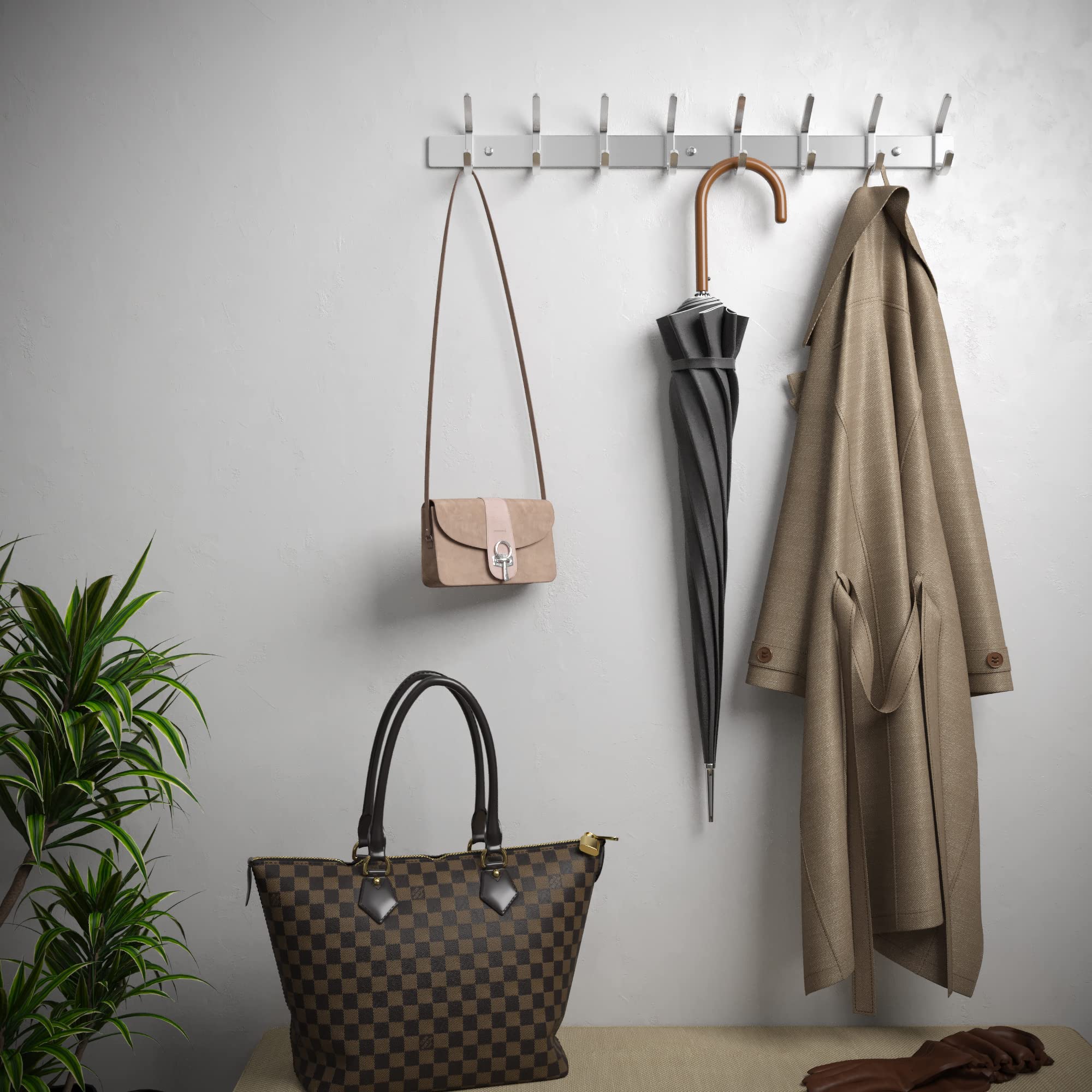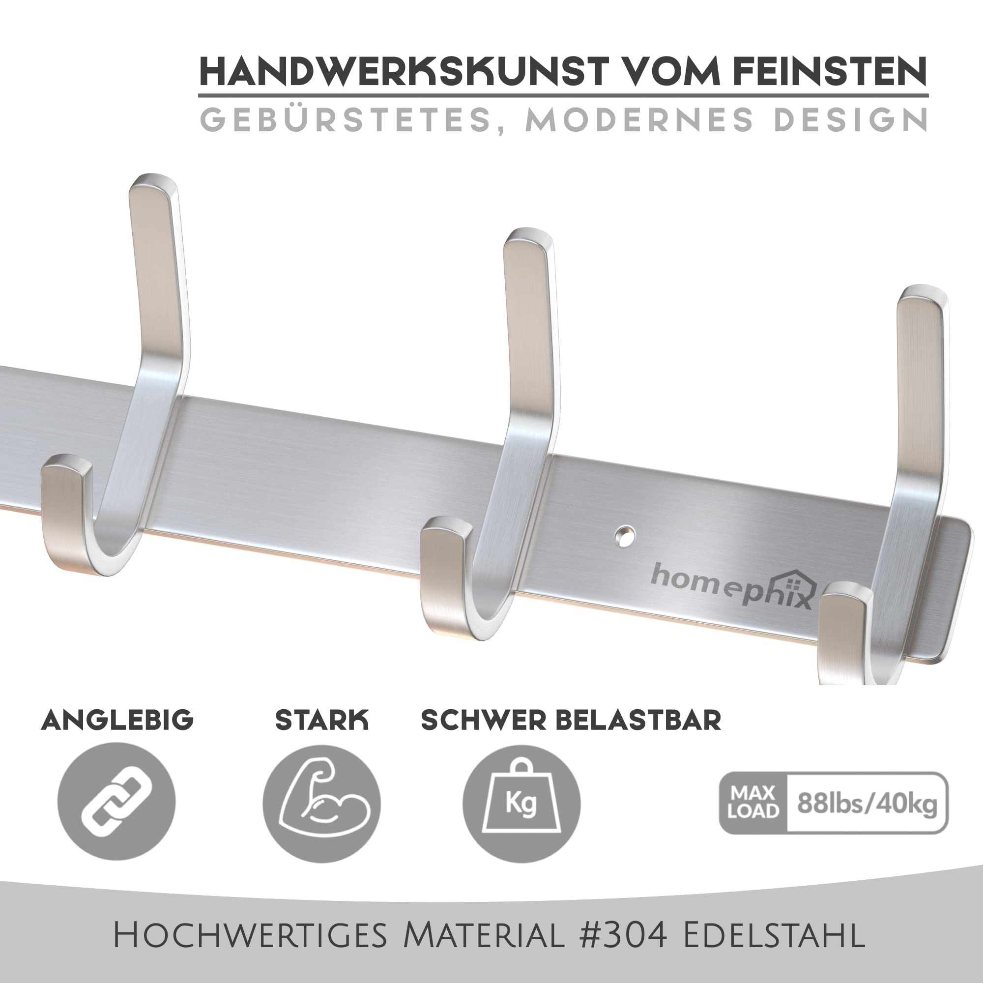 Stabile Edelstahl Hakenleiste! Die Hakenleiste Garderobe aus hochwertigem 304-Edelstahl ist dank einer erstklassigen Verarbeitung super robust und überzeugt mit einer hohen Tragkraft von bis zu 40 kg! Mit 8 innovativen Doppelhaken! Die clever durchdachten Doppelhaken können besonders viel Kleidung tragen. Das Design der Edelstahl-Haken eignet sich zudem perfekt, um Hüte, Regenschirme oder Handtücher sicher und ordentlich zu verstauen! Super platzsparend – passt an jede Wand! Die Garderobenleiste Edelstahl passt mit nur 59 cm wunderbar an jede Wand und ist gut geeignet für enge Wohnungseingänge, denn die Haken stehen nicht weit hervor und nehmen so im Durchgang kaum Platz ein! Als Garderobe, in der Küche oder im Badezimmer! Das moderne Design aus schlichtem silbernem Edelstahl passt perfekt in allen Räumen und zu jeder Wohnungseinrichtung. So kannst du die Garderobenhaken modern überall nutzen – im Bad als Handtuchhalter, in der Küche als Geschirrtuchhalter oder in der Garage. So hältst du dein Zuhause überall ordentlich! Hochwertige Verarbeitung und 100% rostfrei! Die Hakenleiste Edelstahl ist rostfrei und korrosionsbeständig und damit auch sehr gut für feuchte Räume wie das Badezimmer oder die Garage geeignet! Der glänzende Edelstahl ist schön gebürstet und sorgt für ein besonders edles Aussehen! Nach der Montage werden die mitgelieferten Schraubkappen einfach auf die Schraublöcher gesetzt – für ein perfektes Finish! Lieferumfang: Edelstahl Hakenleiste mit 8 Haken, 3 Schrauben und 3 Schraubkappen
