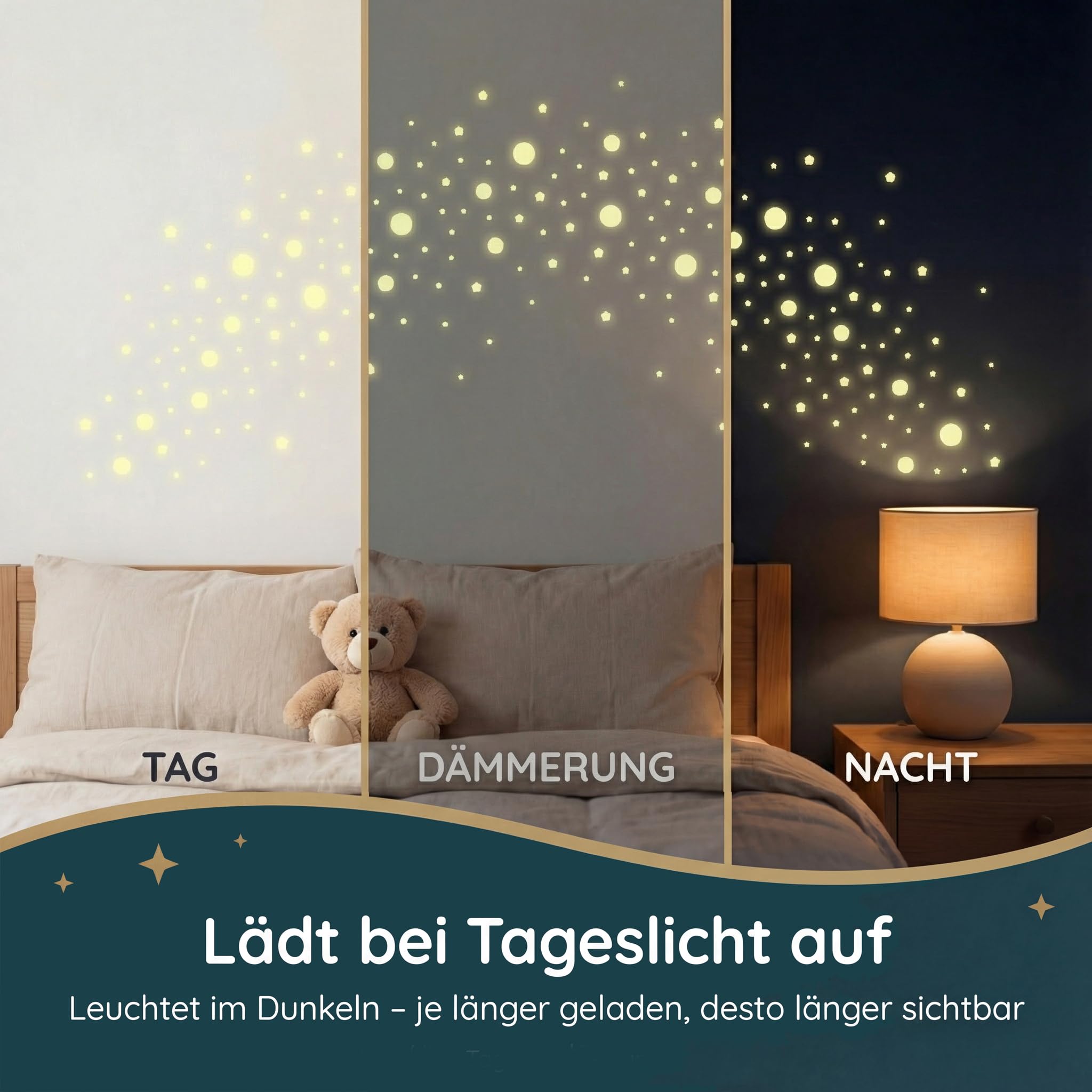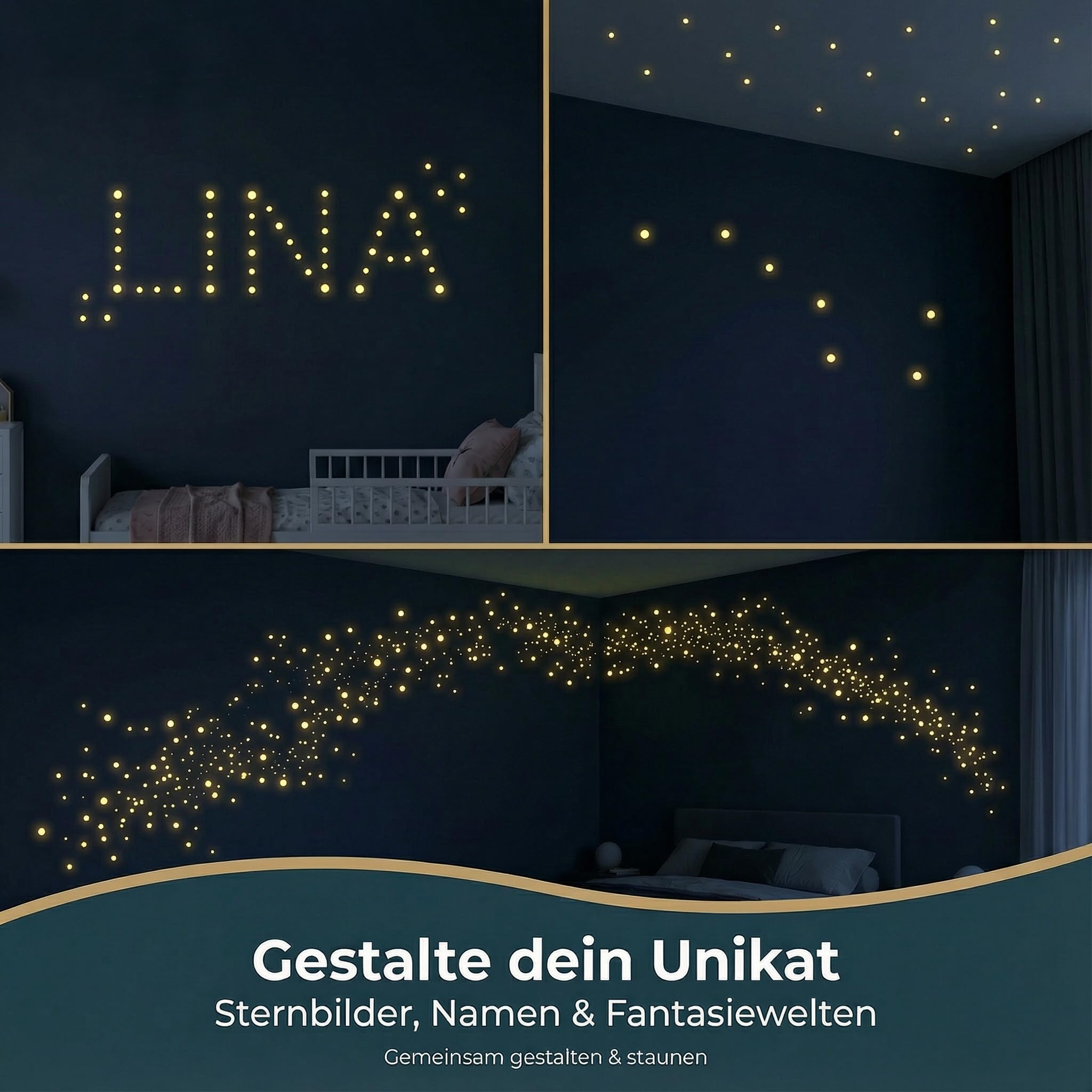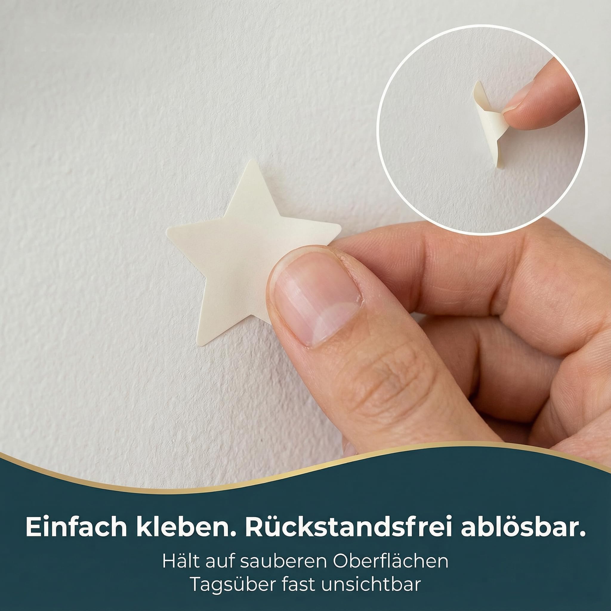 Unsere Wandaufkleber laden zum träumen ein! Gestalte einen wunderschönen Sternenhimmel und verzaubere dein Zuhause. Kinder benötigen viel Raum um sich auszutoben, zu entfalten und einen Rückzugsort an dem sie sich wohl fühlen. Der Sternenhimmel von Homery hilft dir ganz einfach dabei das umzusetzen. Denn die Leuchtsterne bringen nicht nur kindliche Behaglichkeit in das Kinderzimmer, sondern mit ihrer beruhigenden Wirkung die Wand nachts zum funkeln! Verwandle dein Zuhause in eine Sternenkulisse Durch den Einfall von Licht laden sich die selbstklebenden fluoreszierende Sterne auf und leuchten bei Dunkelheit. Egal ob als Leuchtsterne für Kinderzimmer, Schlafzimmer oder Bad - deiner Kreativität sind keine Grenzen gesetzt. Unsere Sterne sorgen für eine angenehme Raumatmosphäre und laden mit ihrer beruhigenden Wirkung zum Träumen ein.