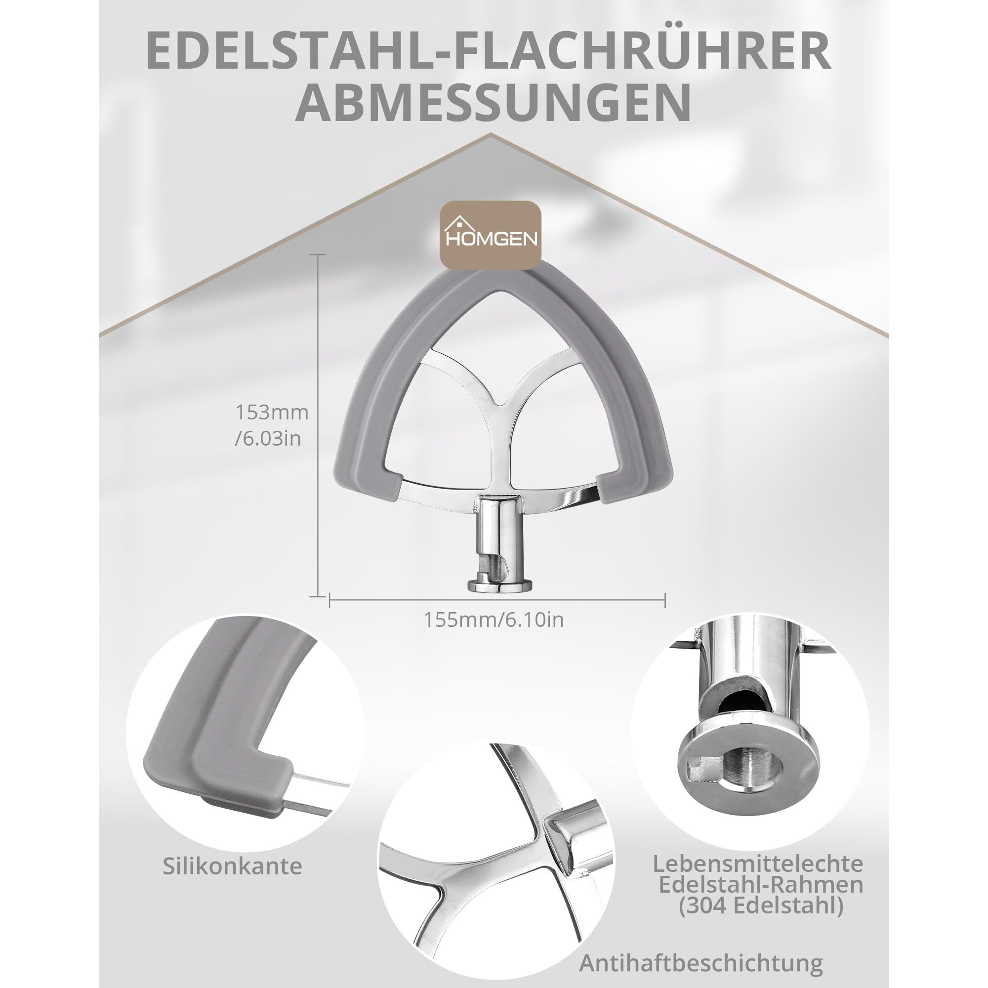 HOMGEN Flachrührer-Aufsatz aus Edelstahl für KitchenAid 4,5-5 Quart Kitchenaid Standmixer mit kippbarem Kopf, Ersatzschläger, Zubehör mit Haken