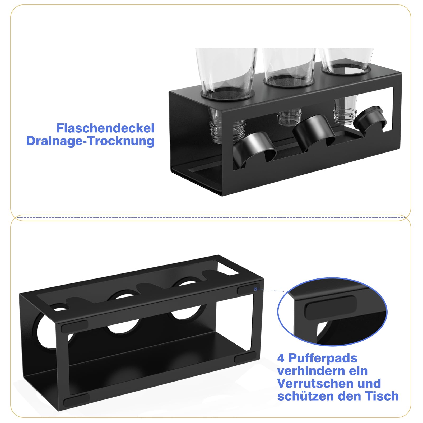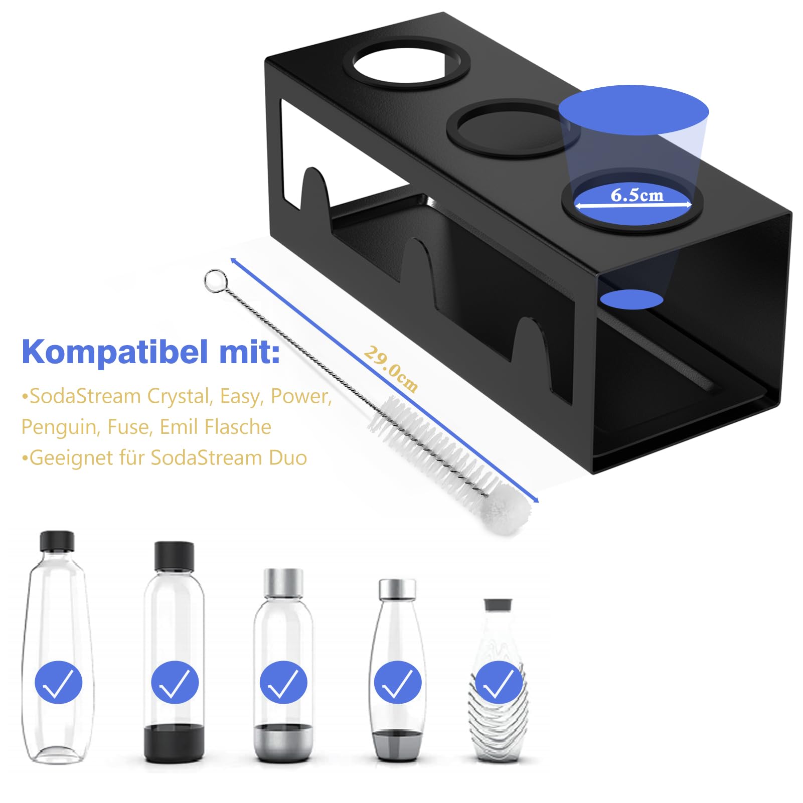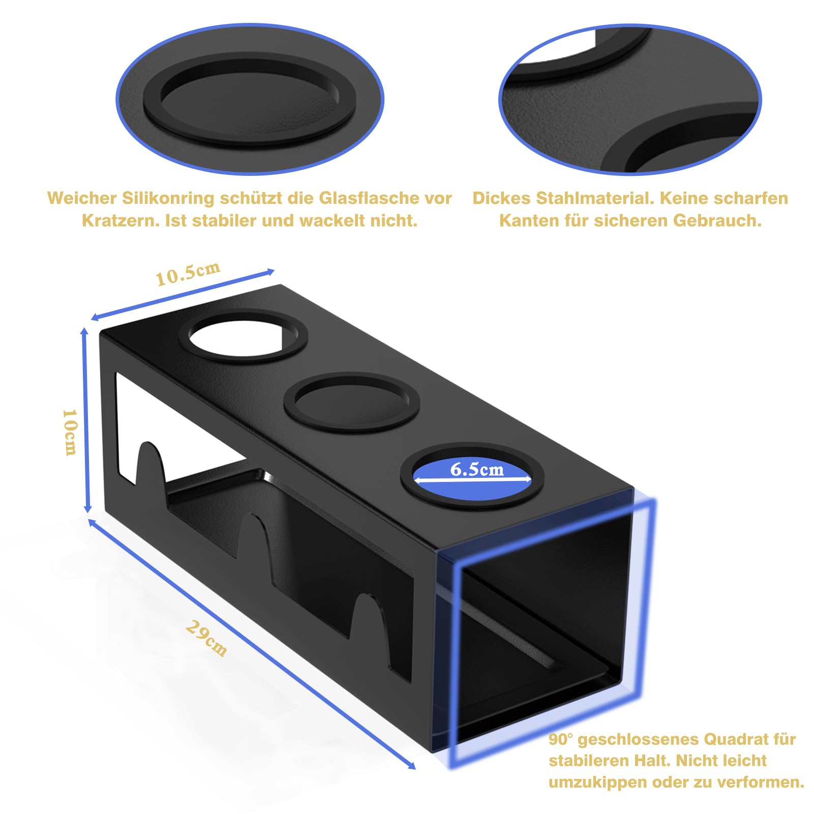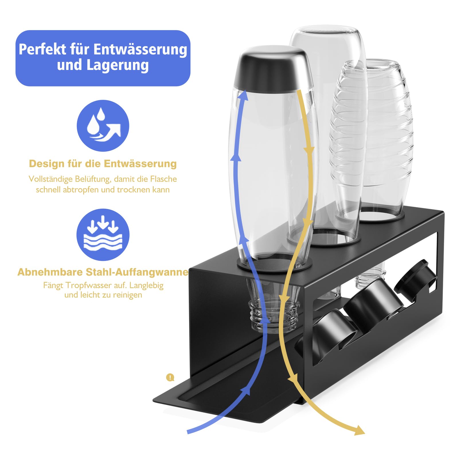 HOMMAND Abtropfhalter für SodaStream Flaschen Universal Schwarz - Halten Sie Ihre Flasche sauber und trocken!Material: Pulverbeschichteter StahlDurchmesser der Löcher: Φ65 mmLieferumfang: Flaschenhalter x 1, Tropfschale x 1, Silikonringe x 3 (die Flaschen sind nicht enthalten)Weiche SilikonringeSchützt die Glasflasche vor Kratzern, ist stabiler und schwankt nicht.Starke StabilitätQuadratisches geschlossenes Schweissdesign. Kein leichtes Umkippen oder Verformen, mehr Stabilität zum Stützen der Flaschen.3 DeckelhalterAusserdem verfügt er über 3 Deckelhalter zum Trocknen von Flaschendeckeln.Sicher in der AnwendungOhne scharfe Kanten geschliffen, schont Flaschen und Hände. Pulverbeschichtung. Langlebig und korrosionsbeständig.Anmerkung:1. Bitte achten Sie beim täglichen Gebrauch auf die Sicherheit von Kindern, um Verletzungen zu vermeiden.2. Bitte pflegen Sie den Flaschenhalter entsprechend den Tipps in der Bedienungsanleitung.