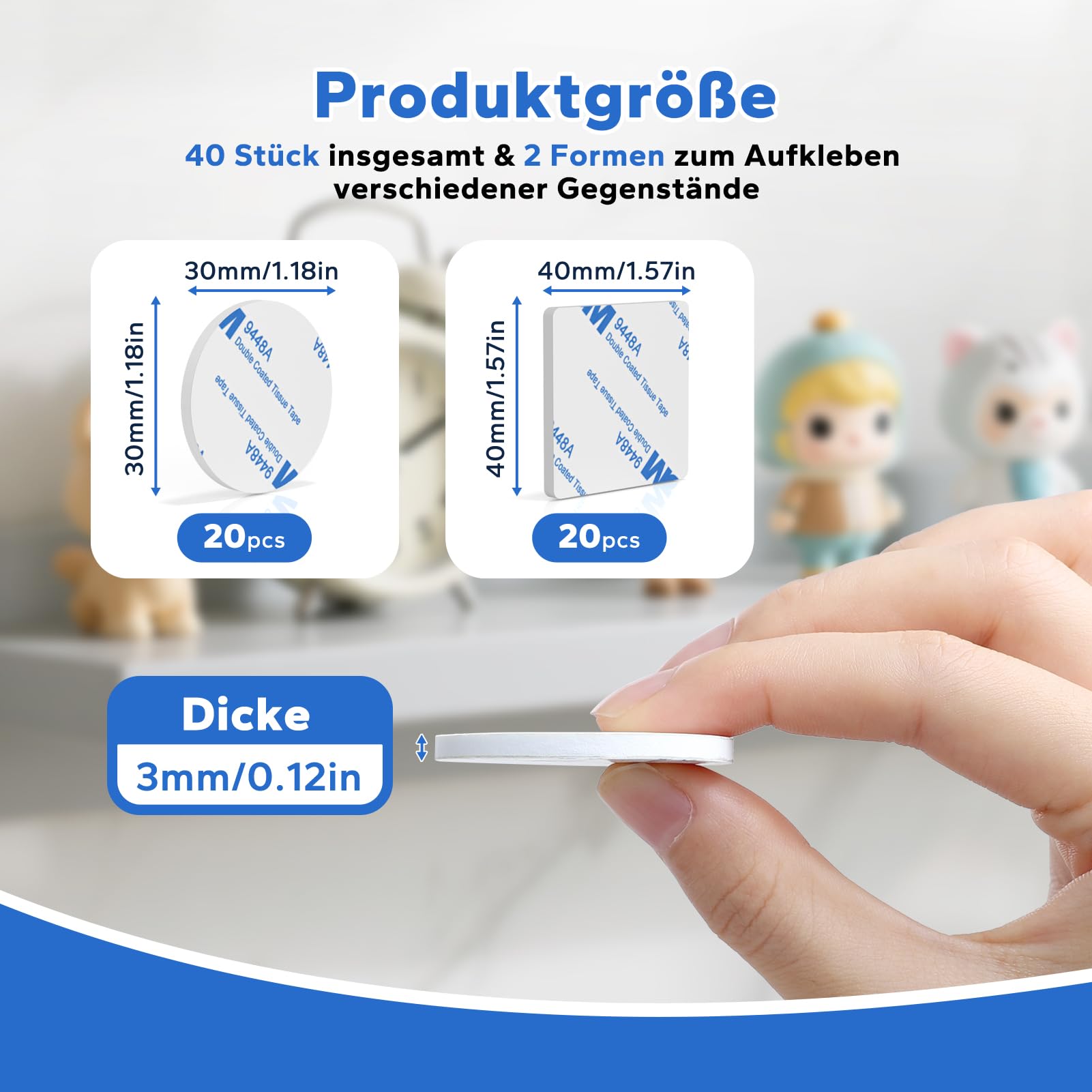 HOMMAND Klebepads Doppelseitig Extra Stark, 40 Stück Doppelseitiges Schaumstoff Klebepads, Wasserfeste Montagepads für Zuhause Büro Auto Schule, Doppelseitige Klebepads Rund/Quadratisch, Weiss