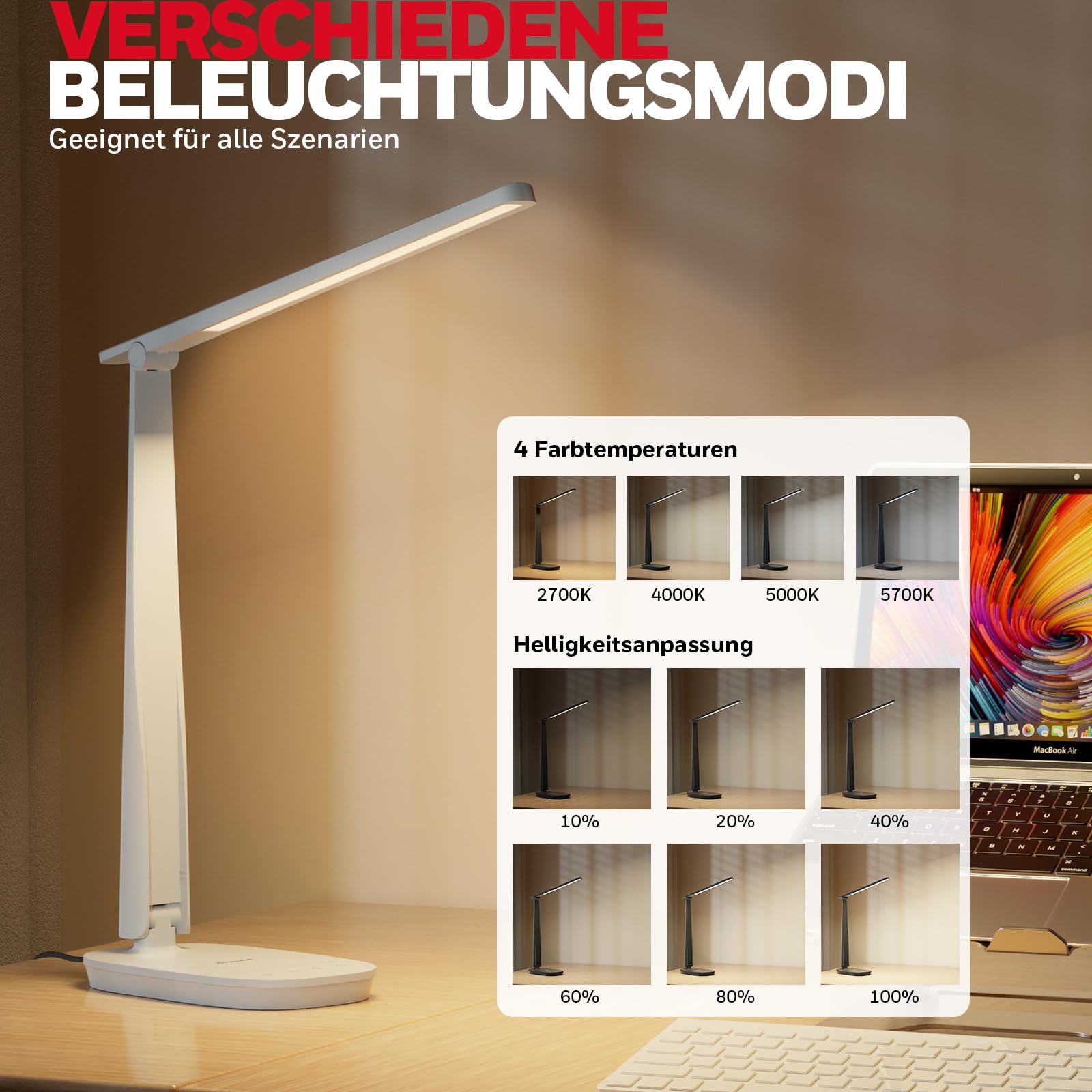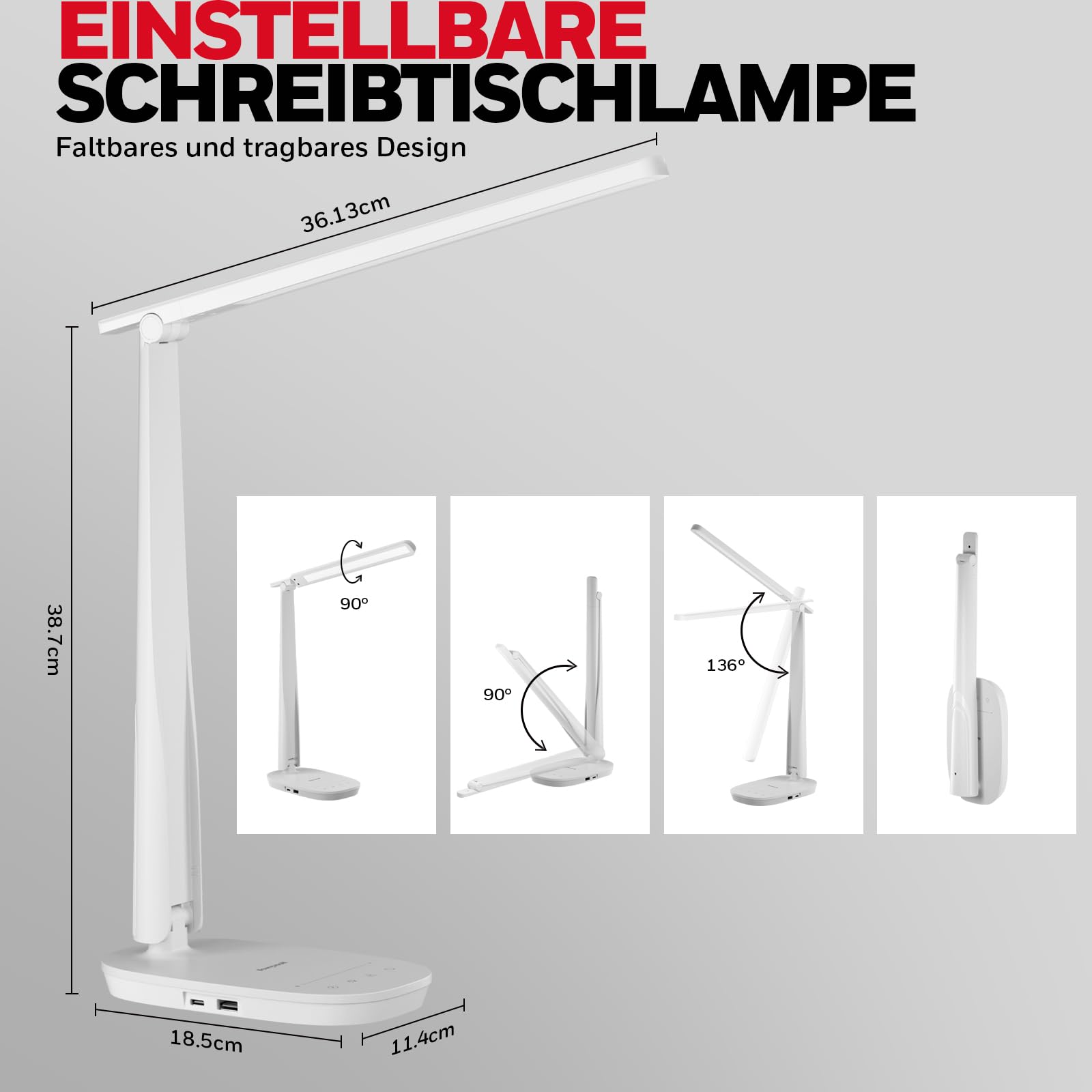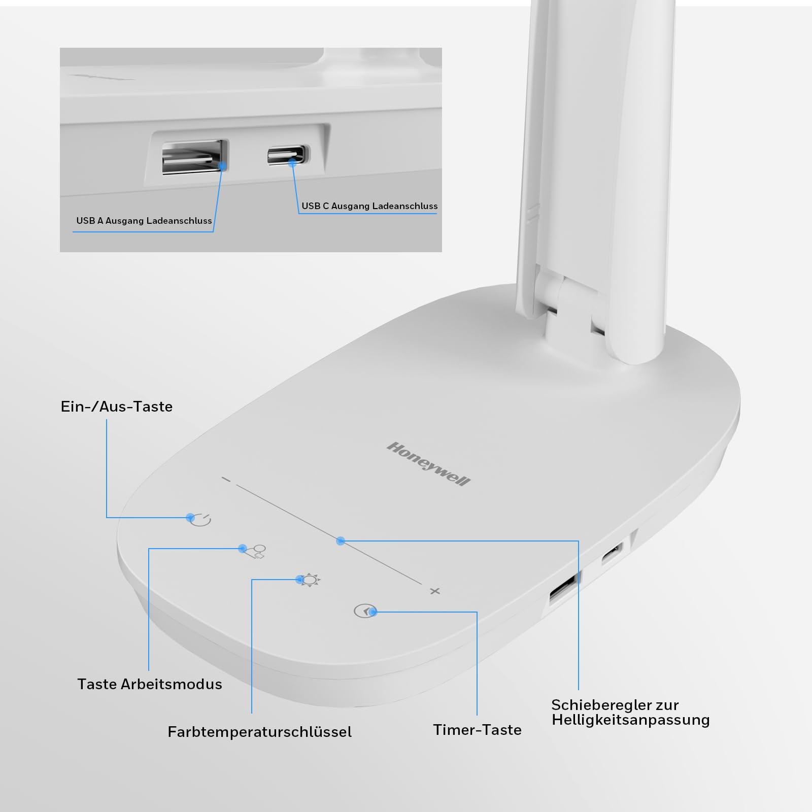 Honeywell Schreibtischlampe mit USB-Ladeanschluss – Sunturalux™ H2 dimmbare, augenschonende LED Tischlampe für Erwachsene, faltbare, tragbare Tischlampe für das Homeoffice, Schlafzimmer, Lesen, Weiss