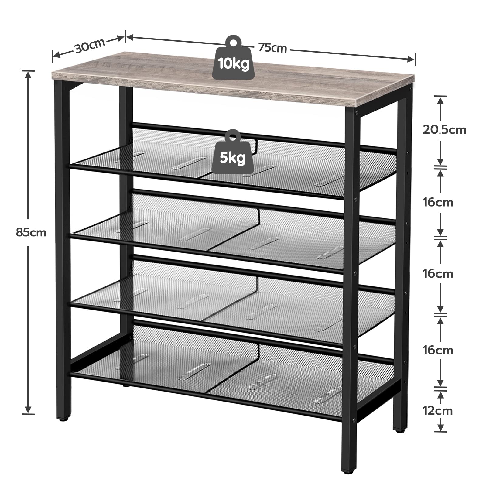 Achtung: Max. Tragfähigkeit der Oberfläche 10 kg, max. 5 kg pro Ablage. Bitte installieren Sie das Schuhregal gemäss den Anweisungen, um eine sichere Benutzung zu gewährleisten.