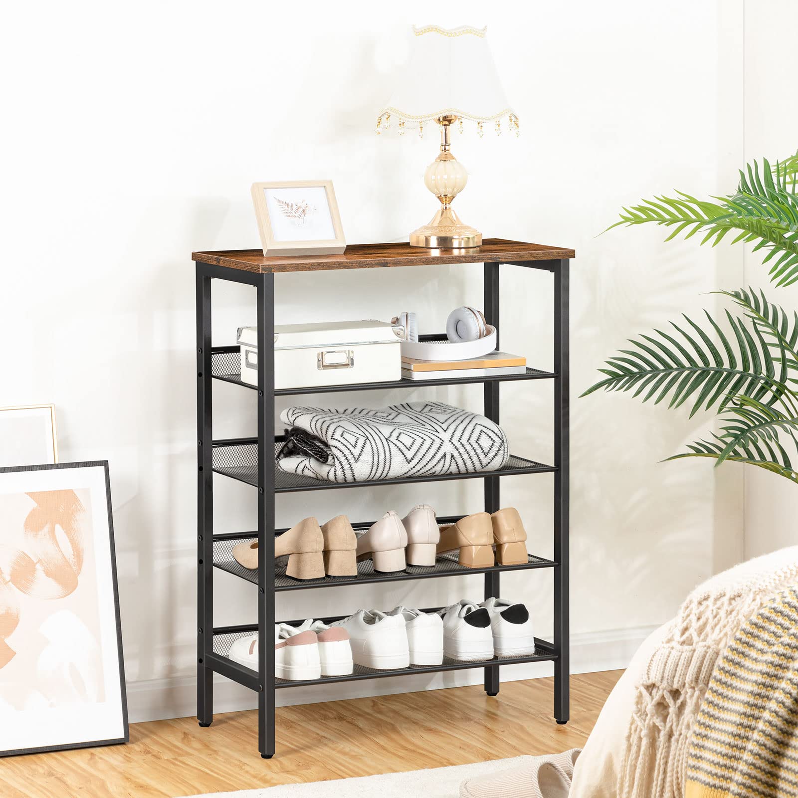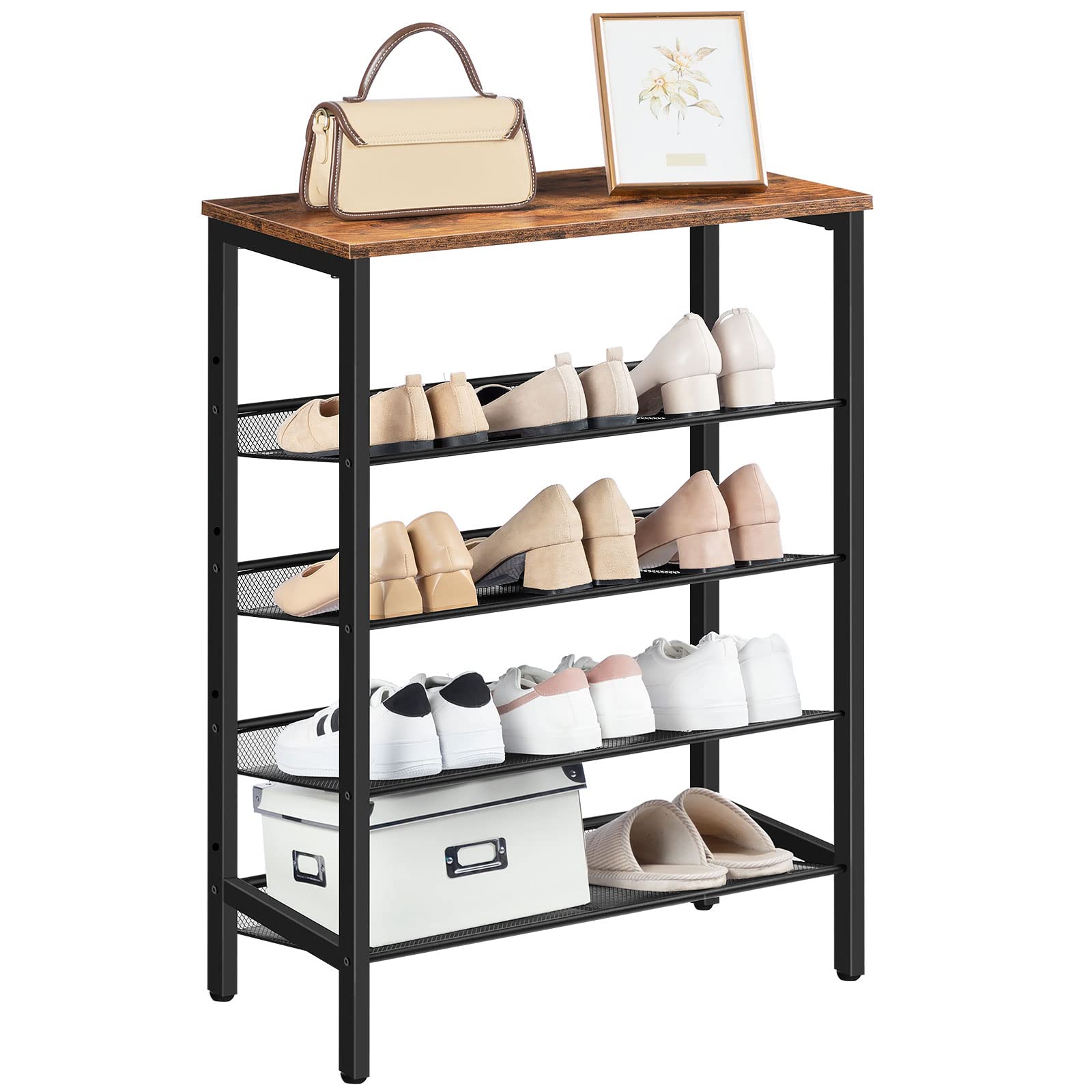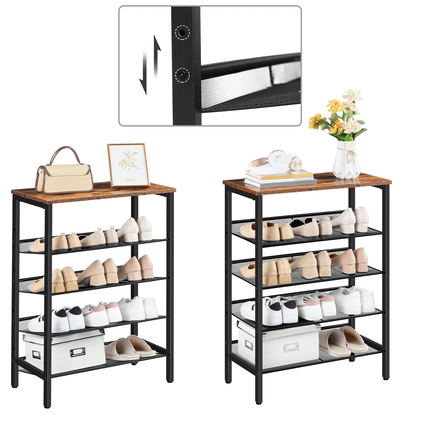 HOOBRO 5-lagiges Schuhregal, Verstellbares Schuhablage, schmal Schuhschrank, Flach und Neigbar, Stabil, Metall, Eingang, Korridor, Industrie, vintagebraun-schwarz EBF106XJ01