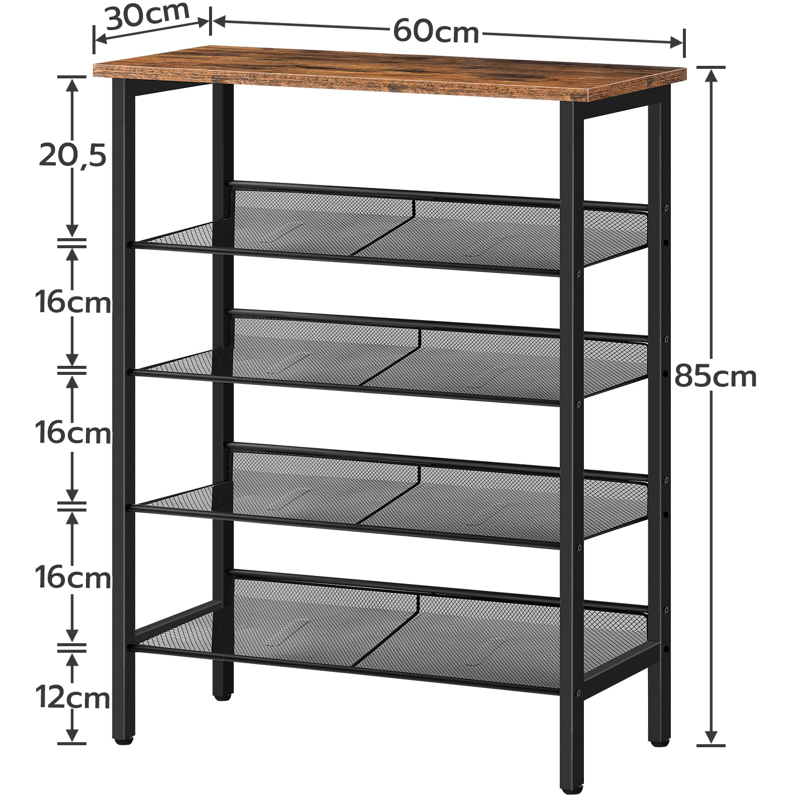 Dies ist unser Schuhregal, das nicht nur toll im Aussehen ist, sondern auch besser in der Qualität, um Ihr Leben schön zu halten. Eine perfekte Lösung, um Artikel zu lagern und Platz zu sparen. Keine Schuhe stapeln sich in der Ecke, kein Chaos sind in Ihrem Eingangsbereich. Mit diesem Schuhablage werden die Plätze in Ihrem Zuhause maximiert, alles wird in Schiffsform sein. Sie werden feststellen, dass sogar ein Schuhbank so schön sein kann. Die Platte jeder Schicht kann auf flach oder geneigt eingestellt wird. Es hängt alles von Ihnen oder der Höhe Ihrer Schuhe ab. Anpassen ist so einfach und doch grossartig! Dieses Schuhregal ist robust, langlebig und attraktiv. Darüber hinaus sind die vier Beine doppelt befestigt, stabil wie ein Berg, und die Fusspolster sind die positiven Elemente zum Schutz des Bodens. Produktdetails: - Farbe: Dunkelbraun - Material: Holzspanplatte, Eisen - Grösse: 60 x 85 x 30 cm ( B x H x T) - Gewicht: 6,26 kg - Max. statische Belastbarkeit der Oberfläche: 10 kg - Max. statische Belastbarkeit pro Gitterablage: 5 kg Lieferumfang: - 1 x Schuhregal - 1 x Zubehörbeutel - 1 x Anleitung (DE, EN, ES, FR, IT) HOOBRO Hinweise: - Das Schuhregal sollte keiner direkten Sonneneinstrahlung ausgesetzt werden. Platzieren Sie es zudem nicht in feuchten Räumen. - Bitte halten Sie das Schuhablage von spitzen Gegenständen fern, um Beschädigungen zu vermeiden.