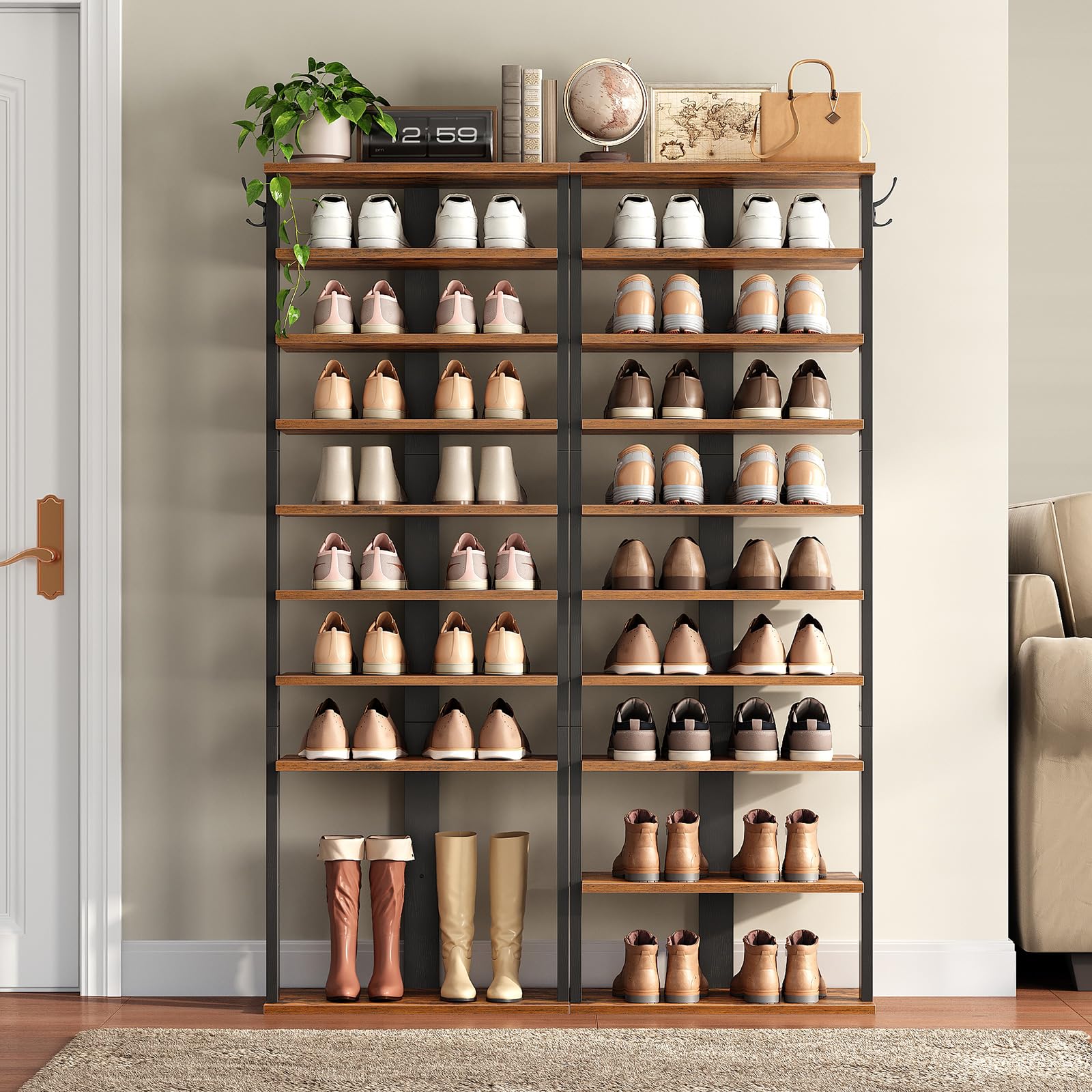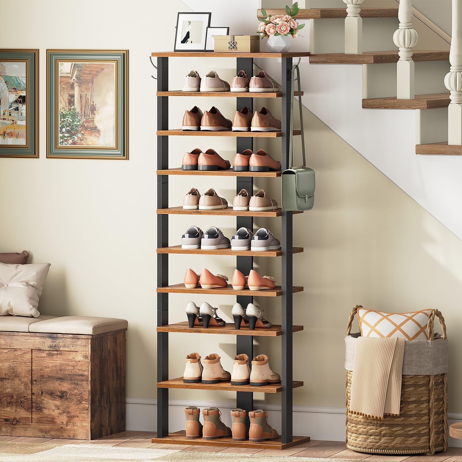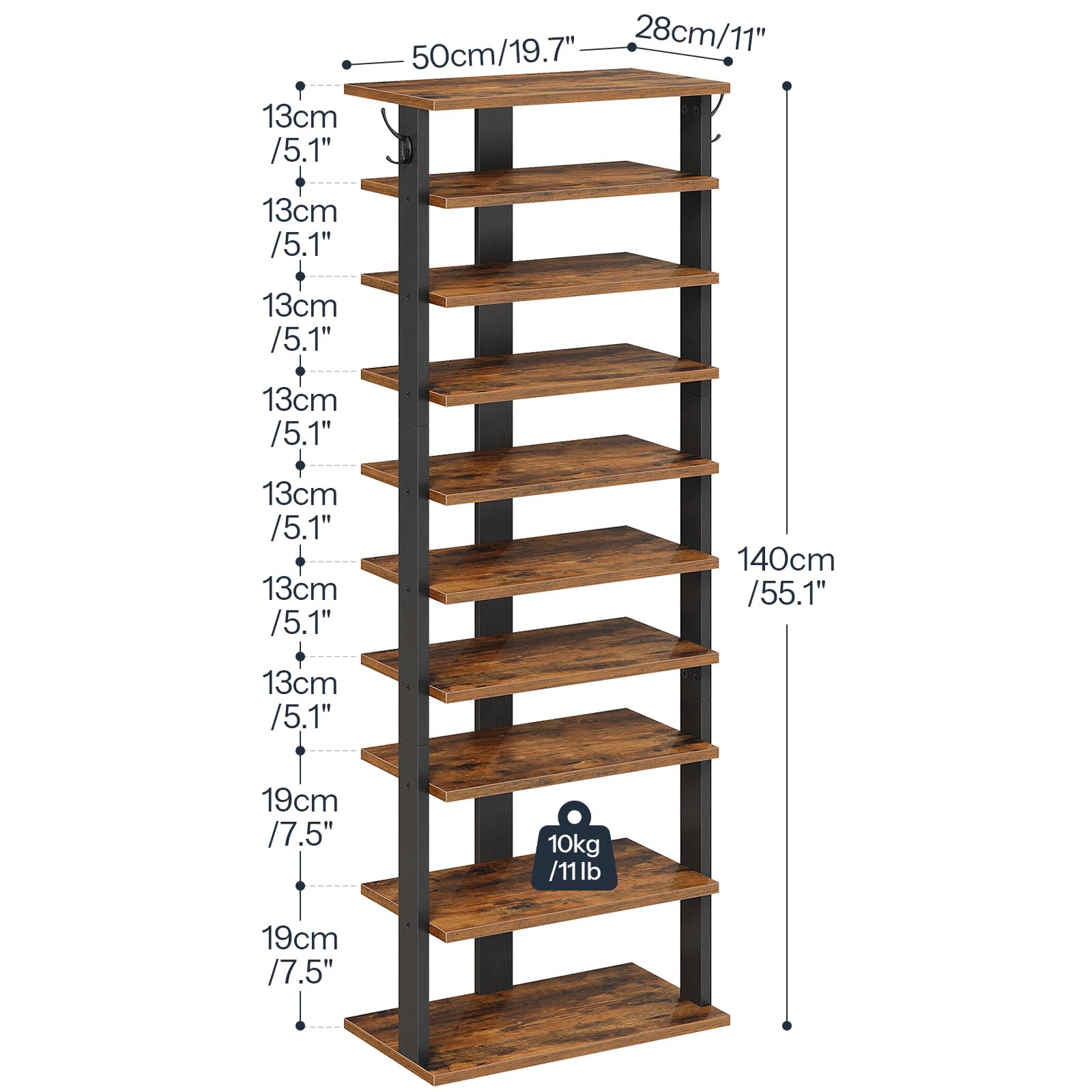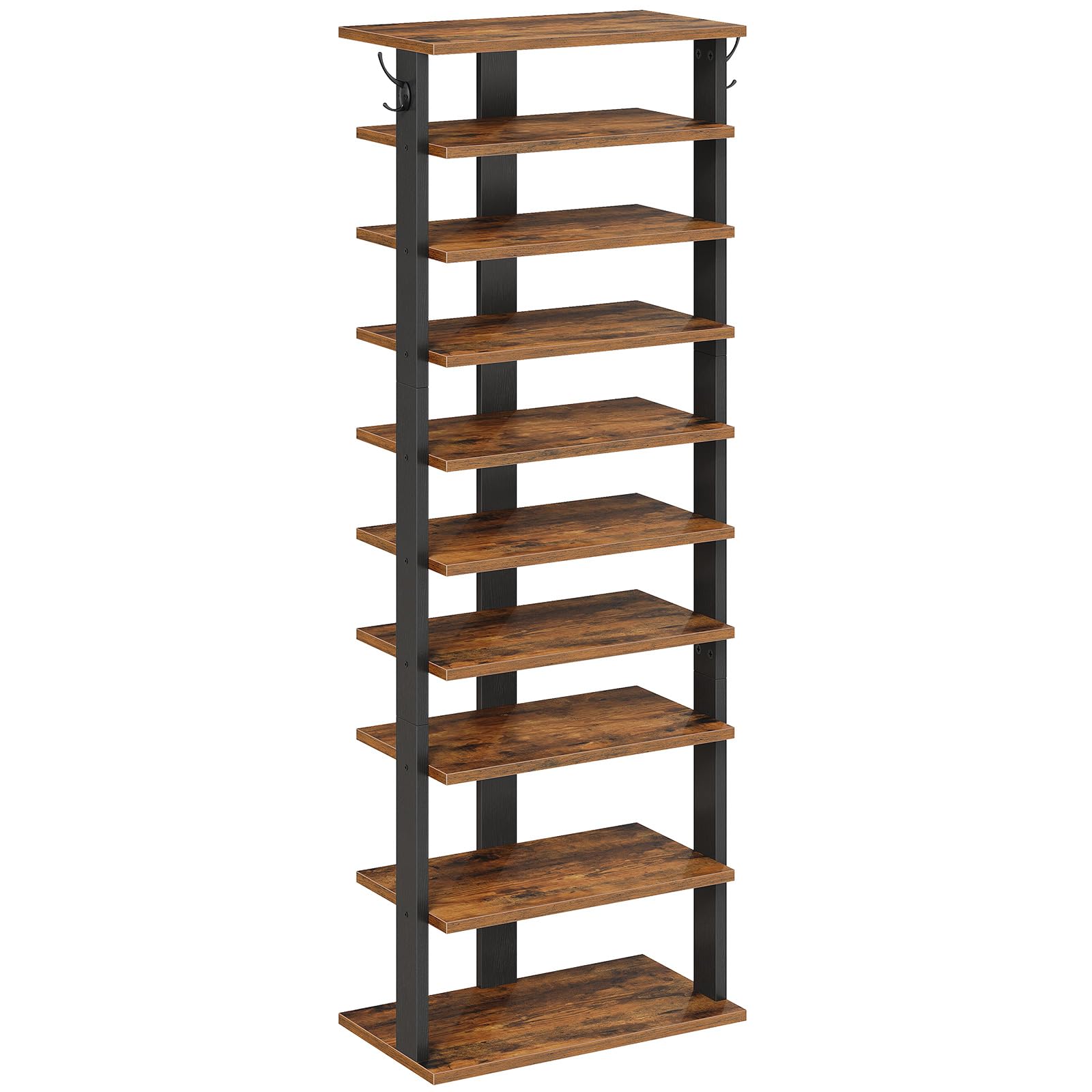 HOOBRO 10-lagiges Schuhregal, schmales Schuhablage, 50 cm Schuhschrank mit 2 Haken, Ablagegestelle, Stabil, für Eingang, Wohnzimmer, Schlafzimmer, Rustikales Braun EFG140XJ01