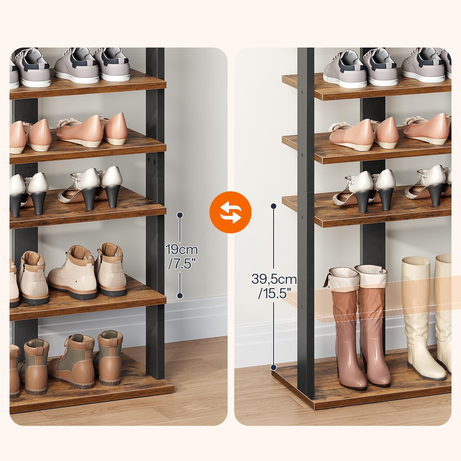 Verabschieden Sie sich von den unordentlichen Fluren der Vergangenheit. Verabschieden Sie sich von Schuhtürmen aus fadenscheinigem Plastik. Begrüssen Sie das HOOBRO Schuhregal. Er wird Ihre rechte Hand am Eingang Ihres Flurs sein und Ihnen helfen, die Schuhe und Taschen Ihrer Familie zu ordnen. Wenn Sie ein einfaches und stilvolles Leben führen wollen, ist dieser Schuh-Organizer genau das Richtige für Sie. Produktdetails: Farbe: Rustikales Braun Material: Holzspanplatte, Metall Grösse: 50 x 28 x 140 cm (L x B x H) Gewicht: 12,8 kg Lieferumfang: 1 x Schuhregal 1 x Montagezubehör 1 x Anleitung (DE, EN, ES, FR, IT) HOOBRO Hinweise: Kinder dürfen nicht auf das Schuhablage klettern oder damit spielen, um mögliche Verletzungen durch Umkippen zu vermeiden.