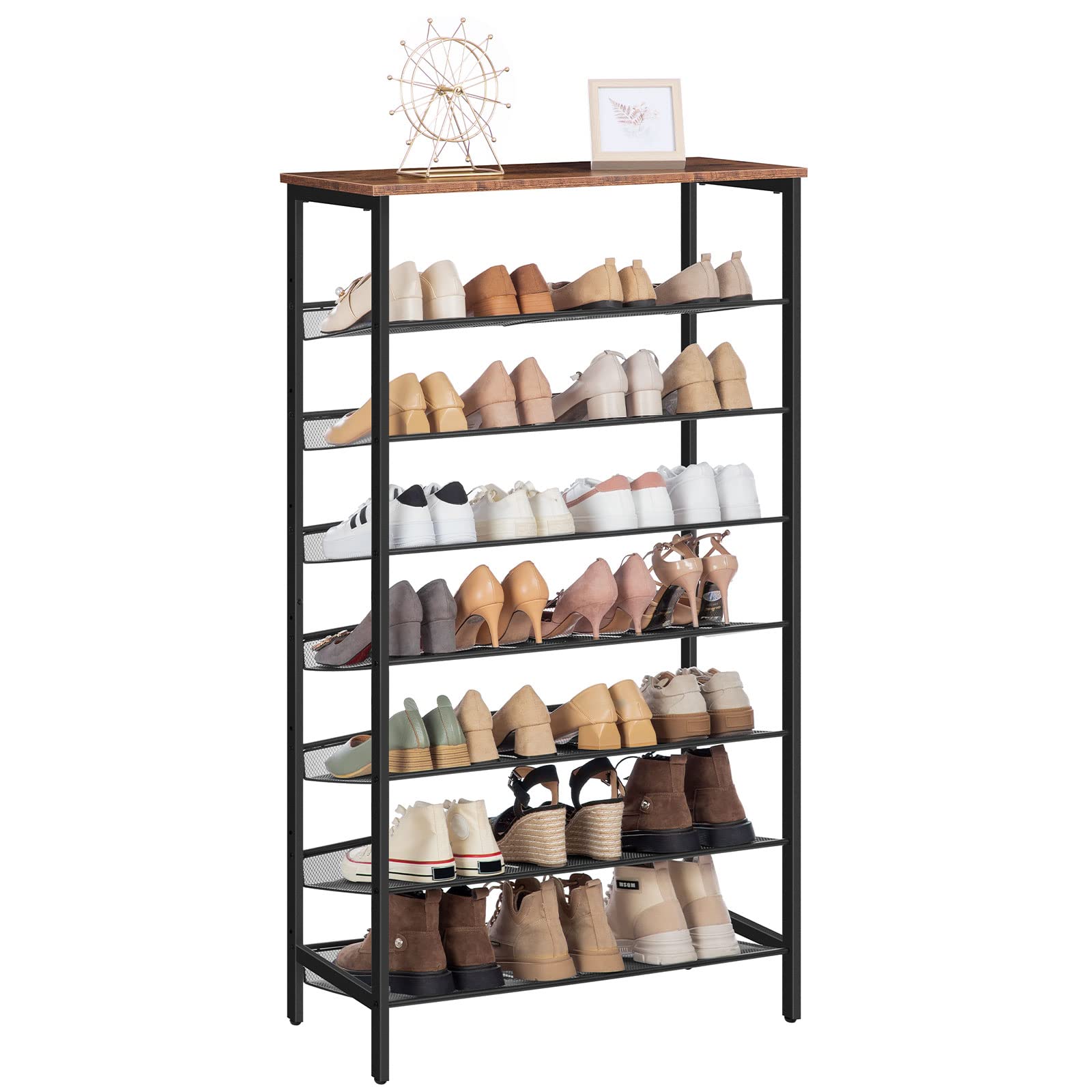 HOOBRO 8-stöckiges Schuhregal, Schuhschrank hoch, Grosse schmal Schuhablage, Flache und kippbare Gitternetzregale, Metall, für 24-32 Paar, für Eingang, Flur, vintagebraun-schwarz EBF18XJ01
