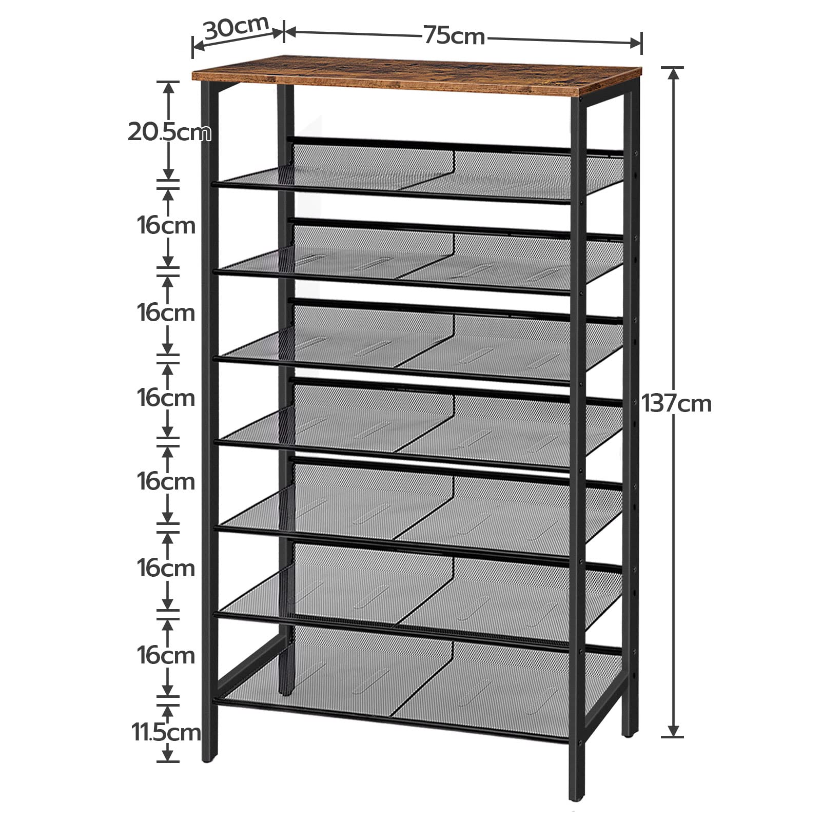 HOOBRO Es hat sich zur Aufgabe gemacht, stilvolle, einfache und stimmungsvolle Möbel in jedem Zuhause anzubieten. Dieser XXL-Schuhständer mit 8 Ebenen von HOOBRO wird der Star Ihres Zuhauses sein. Ein multifunktionales Schuhregal zieht immer die Aufmerksamkeit der Menschen auf sich. Es kann nicht nur zum Aufbewahren von Schuhen der ganzen Familie verwendet werden, sondern auch zum Aufbewahren von Utensilien in der Küche oder für Dinge in einer Ecke, um Ihnen zu helfen, Ihre unordentlichen Sachen zu verstauen. Die Gitterregale sind mit Löchern für gute Belüftung und Feuchtigkeitsbeständigkeit konzipiert. Sehen Sie, HOOBRO denkt an jedes Detail. Jedes Regal kann flach oder geneigt installiert werden, je nach Ihren persönlichen Vorlieben für eine optimale Nutzung. Eigenschaften: Farbe: rustikales Braun Material: Spanplatte, Metall Masse: 75 x 30 x 137 cm Gewicht: 10,3 kg Maximale statische Belastbarkeit der Oberfläche: 10 kg Maximale statische Belastbarkeit pro Ebene: 5 kg Lieferumfang: 1 x Schuhregal 1 x Montagesatz 1 x Inbusschlüssel 1 x Anleitung (DE, EN, ES, FR, IR, T) HOOBRO Notes: Kindern ist es verboten, auf das Schuhregal zu steigen und damit zu spielen, um potenzielle Risiken durch das Umkippen des Schuhregals zu vermeiden.