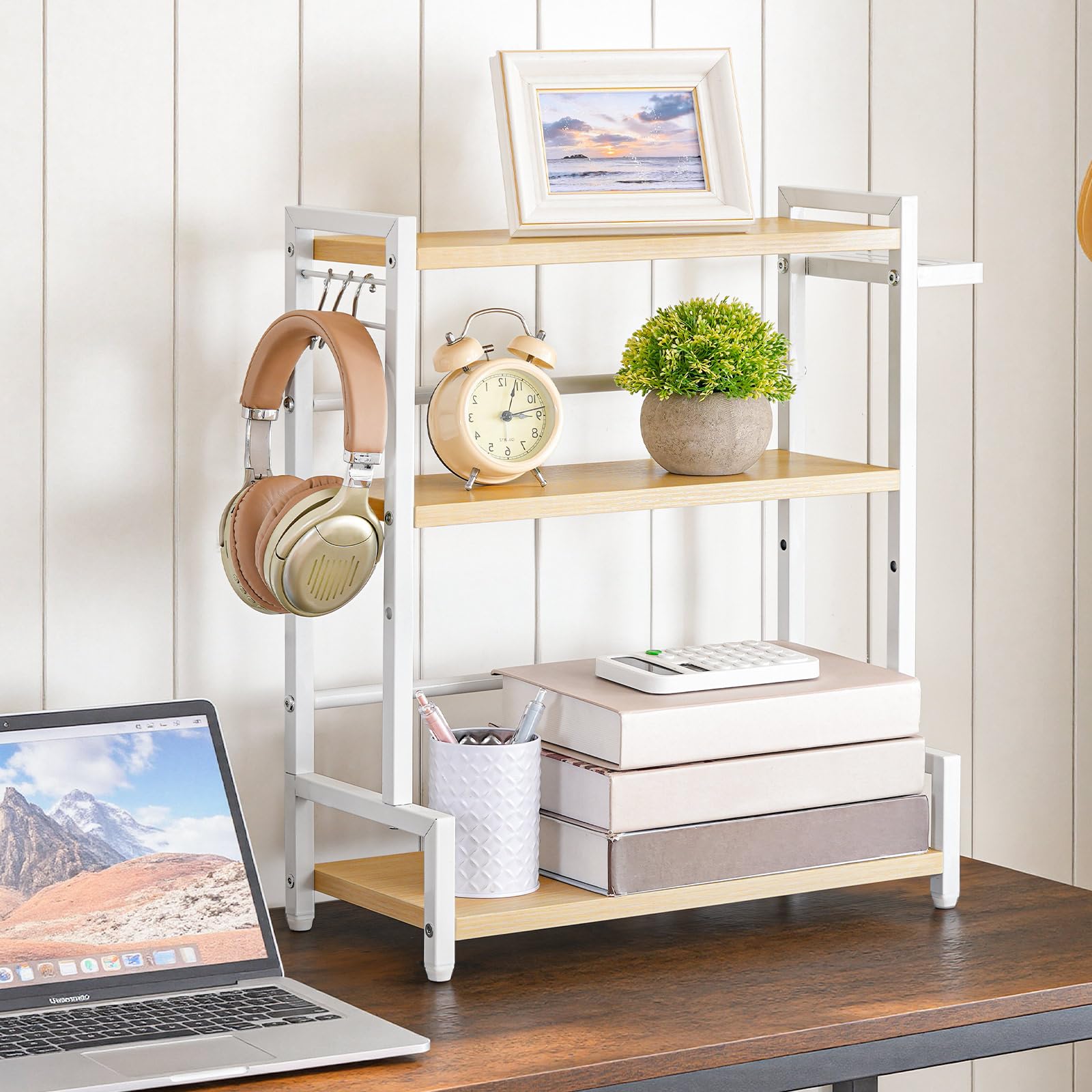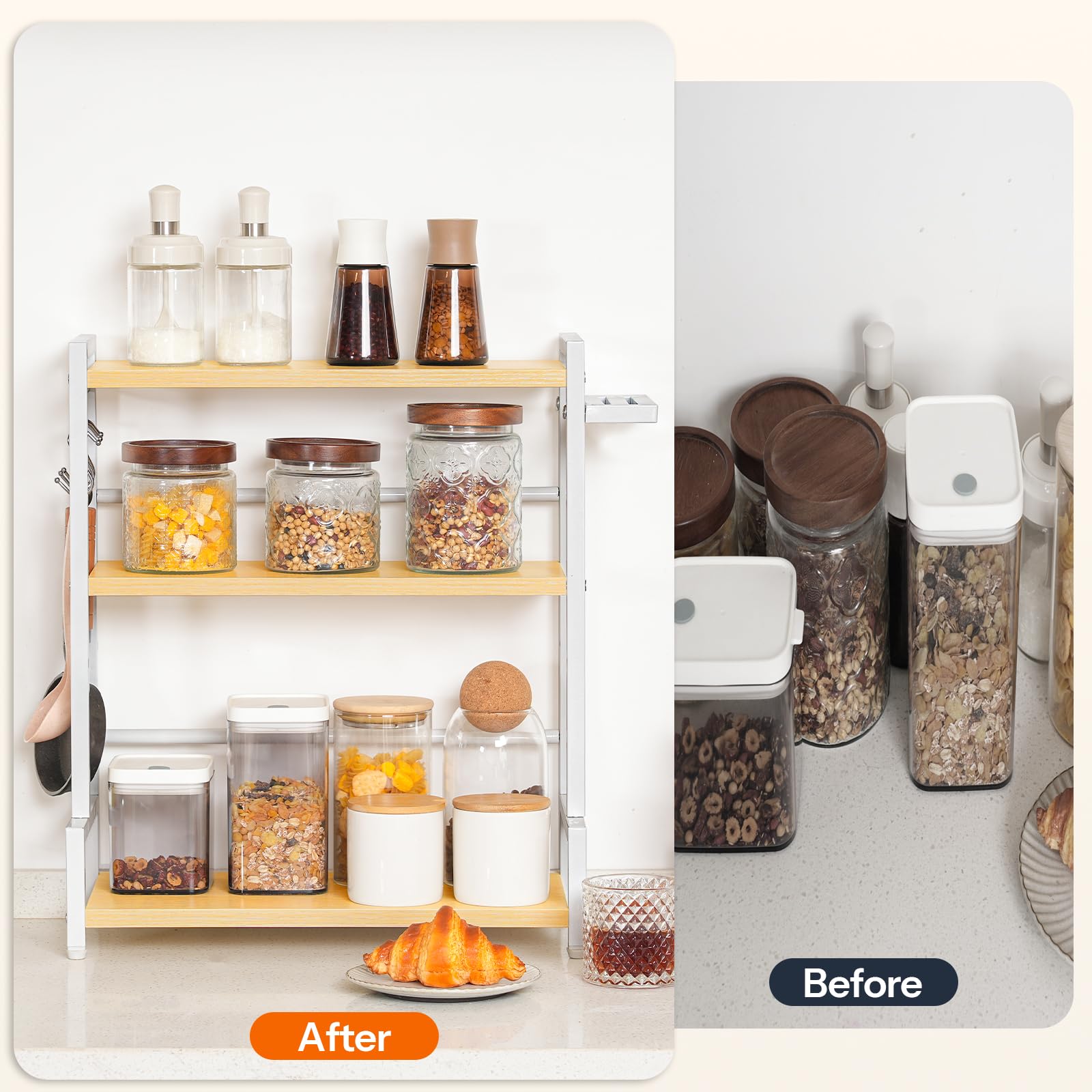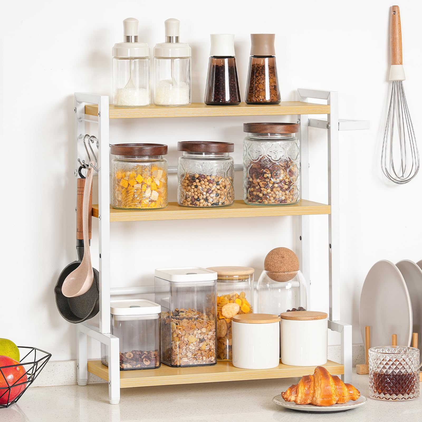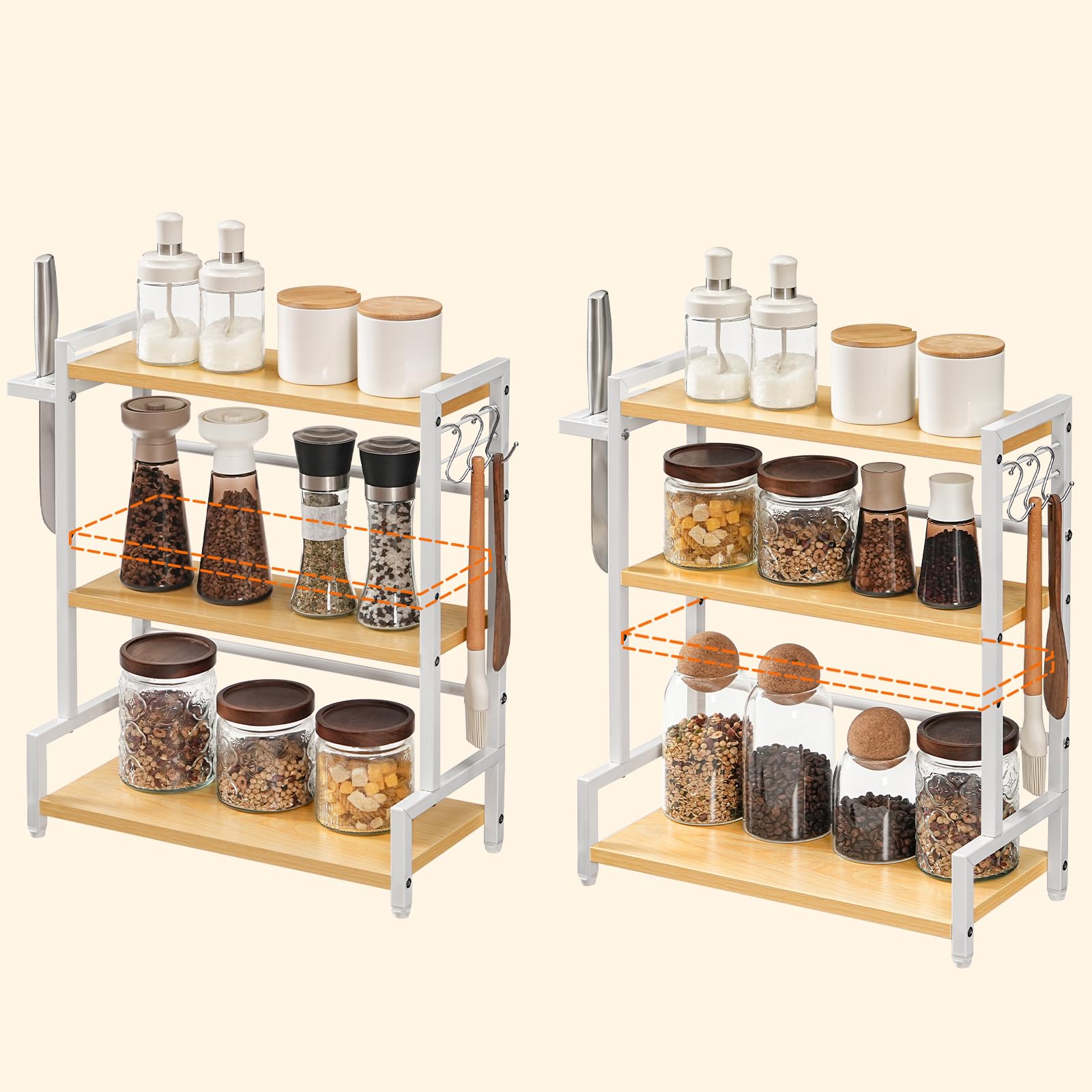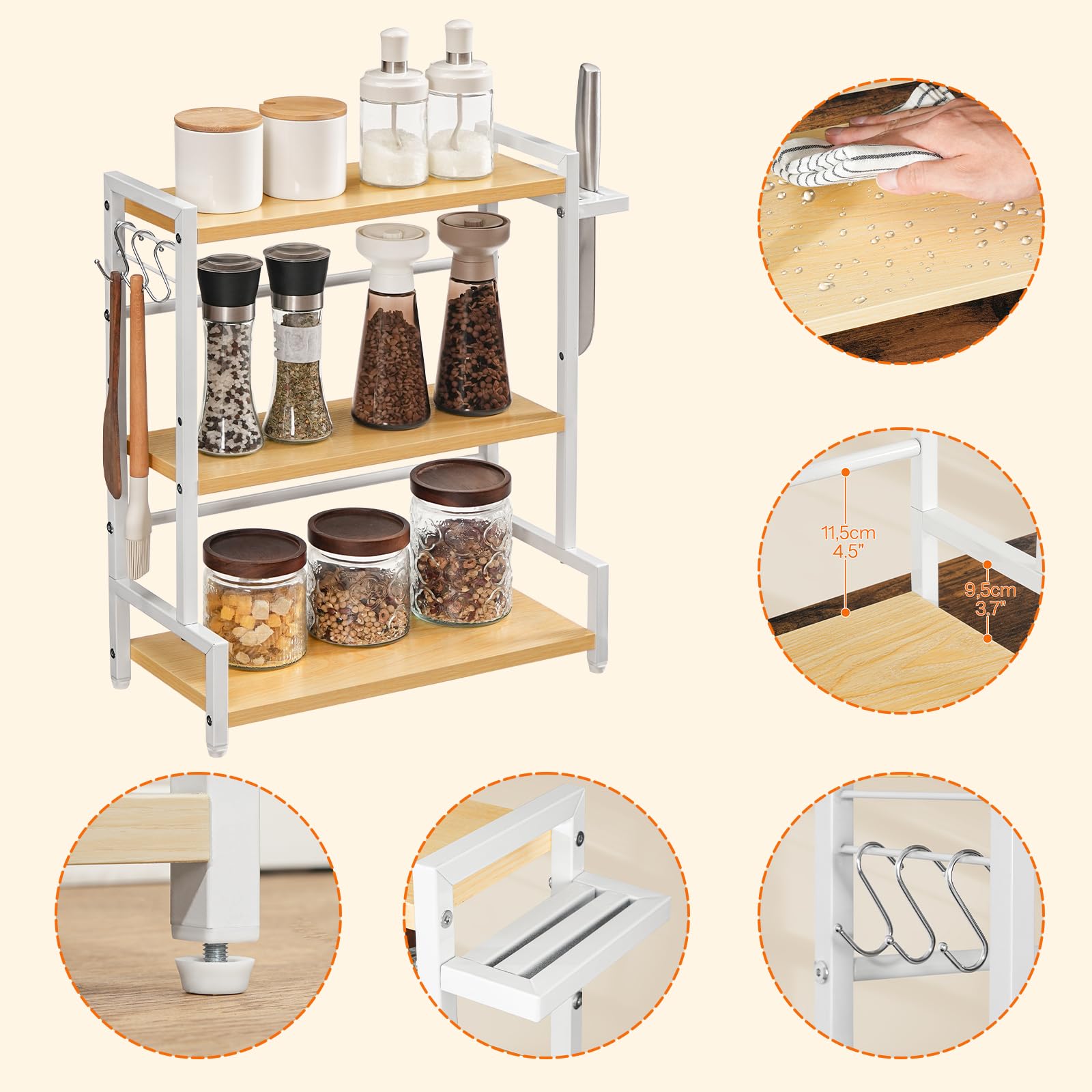 HOOBRO Gewürzregal, Küchenregal mit 3 Haken und Messerhalter, Gewürzständer, Küchen-Organizer auf der Arbeitsplatte, Gewürzhalter, für Küche, Esszimmer, Badezimmer, Holzfarbe und Weiss EWN01TL01
