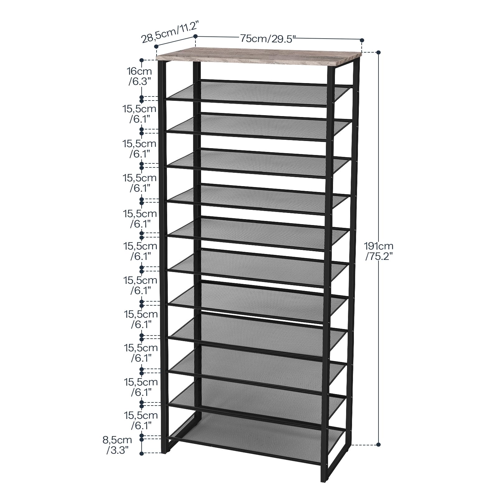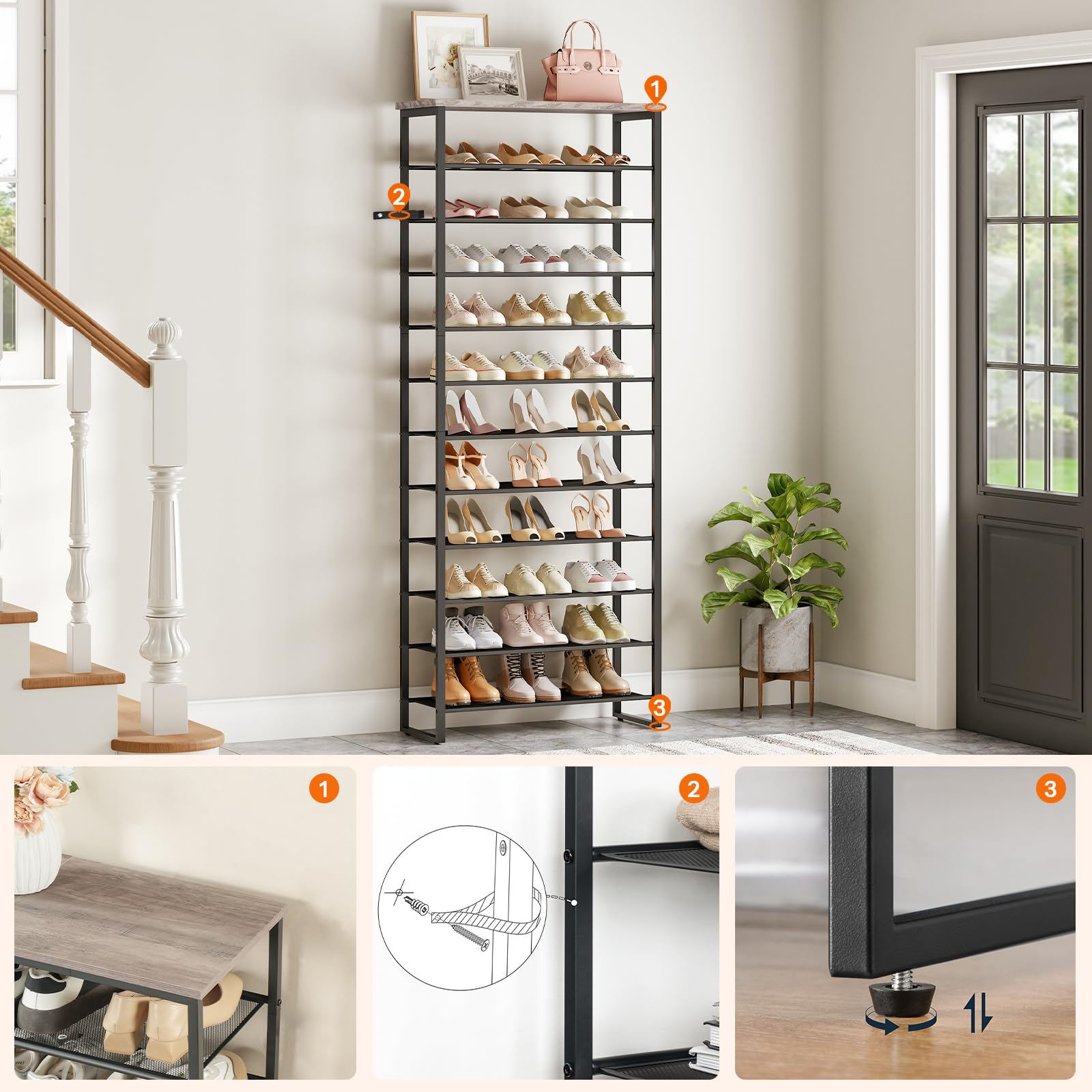 HOOBRO Grosse Schuhregal, 12-stöckiges Schuhablage, Schuhschrank hoch, für 35-45 Paar Schuhe, Metallrahmen, Industriestil, für Flur, Wohnzimmer, Schlafzimmer, Greige-Schwarz EBG127XJ01