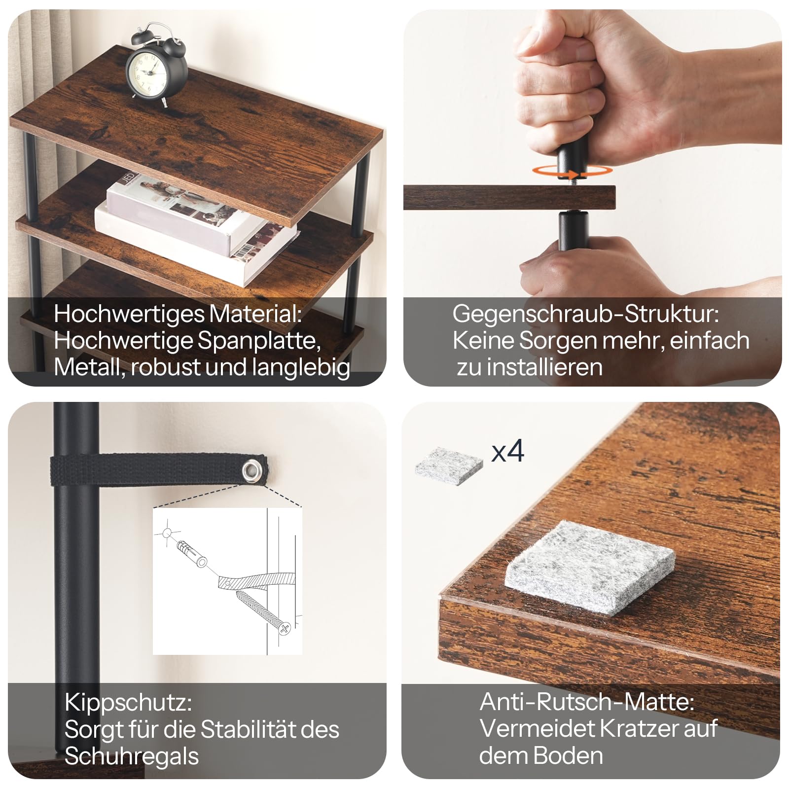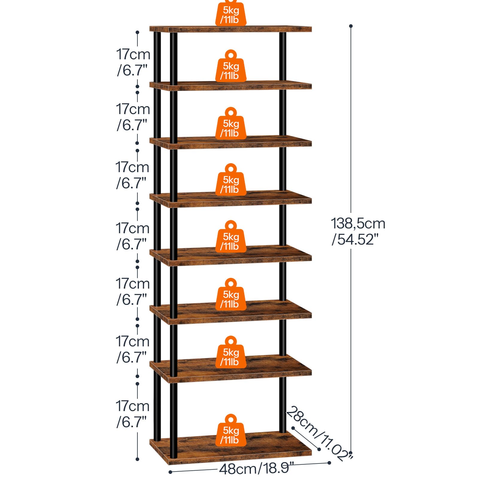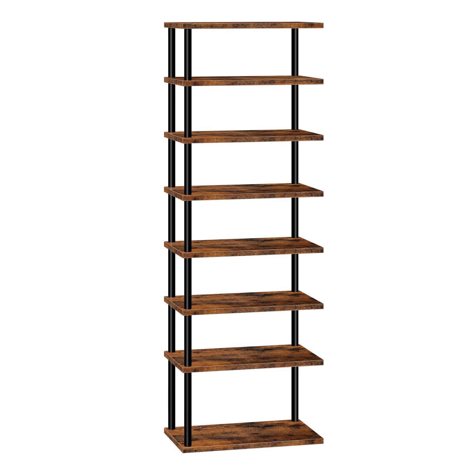 Das 8-lagige Schuhregal trägt dazu bei, ein warmes Zuhause zu schaffen! Das vertikale HOOBRO Schuhregal verleiht Ihrem Zuhause wie ein sorgfältiger Butler einen Hauch von Ordentlichkeit und Eleganz. Sein einzigartiges Design bietet Ihren Schuhen ein bequemes Zuhause und verleiht Ihren Ecken ein aufgeräumtes Aussehen. Sie müssen sich keine Sorgen mehr machen, dass Sie nicht die richtigen Schuhe finden oder dass Schuhe zu viel Platz beanspruchen. Spezifikation: - Farbe: Vintage, Schwarz - Material: Spanplatte, Eisen - Produktgrösse: 48 x 28 x 138,5 cm - Produktgewicht: 12,4 kg - Die maximale statische Tragfähigkeit jeder Schicht: 5 kg Lieferumfang: - 1 x Schuhregal - 1 x Anti-Kipp-Set - 1 x Zubehörtasche - 1 x Anleitung (DE, EN, FR, ES, IT) HOOBRO Hinweise: - Verwenden Sie vor dem Gebrauch das Anti-Kipp-Set, um das Produkt sicher an der Wand zu befestigen. - Kinder dürfen nicht auf das Produkt klettern oder damit spielen.