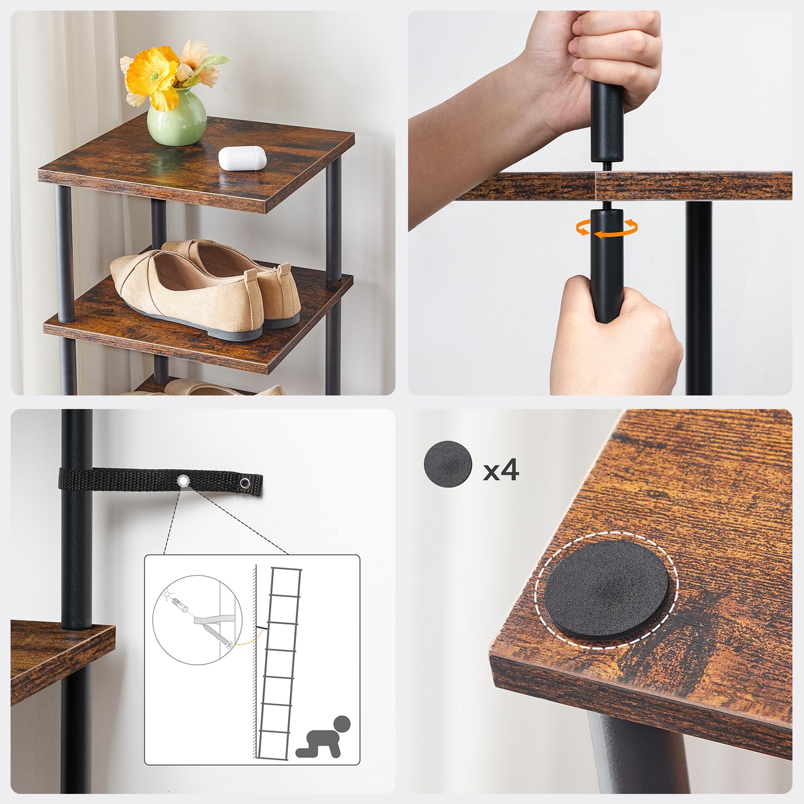 Das vertikale HOOBRO Schuhregal verleiht Ihrem Zuhause wie ein sorgfältiger Butler einen Hauch von Ordentlichkeit und Eleganz. Sein einzigartiges Design bietet Ihren Schuhen ein bequemes Zuhause und verleiht Ihren Ecken ein aufgeräumtes Aussehen. Sie müssen sich keine Sorgen mehr machen, dass Sie nicht die richtigen Schuhe finden oder dass Schuhe zu viel Platz beanspruchen.