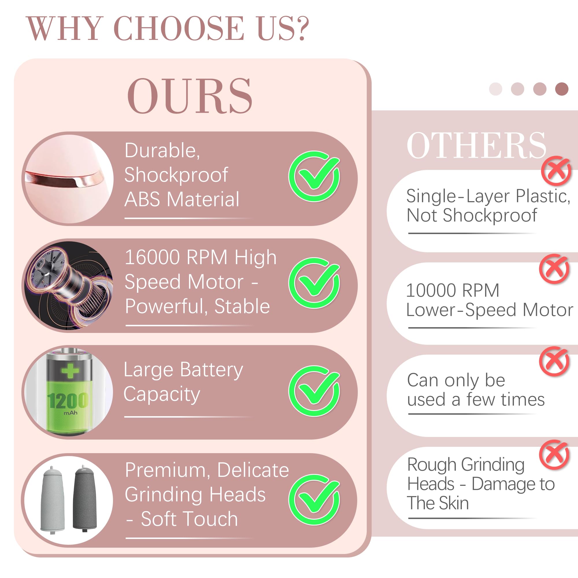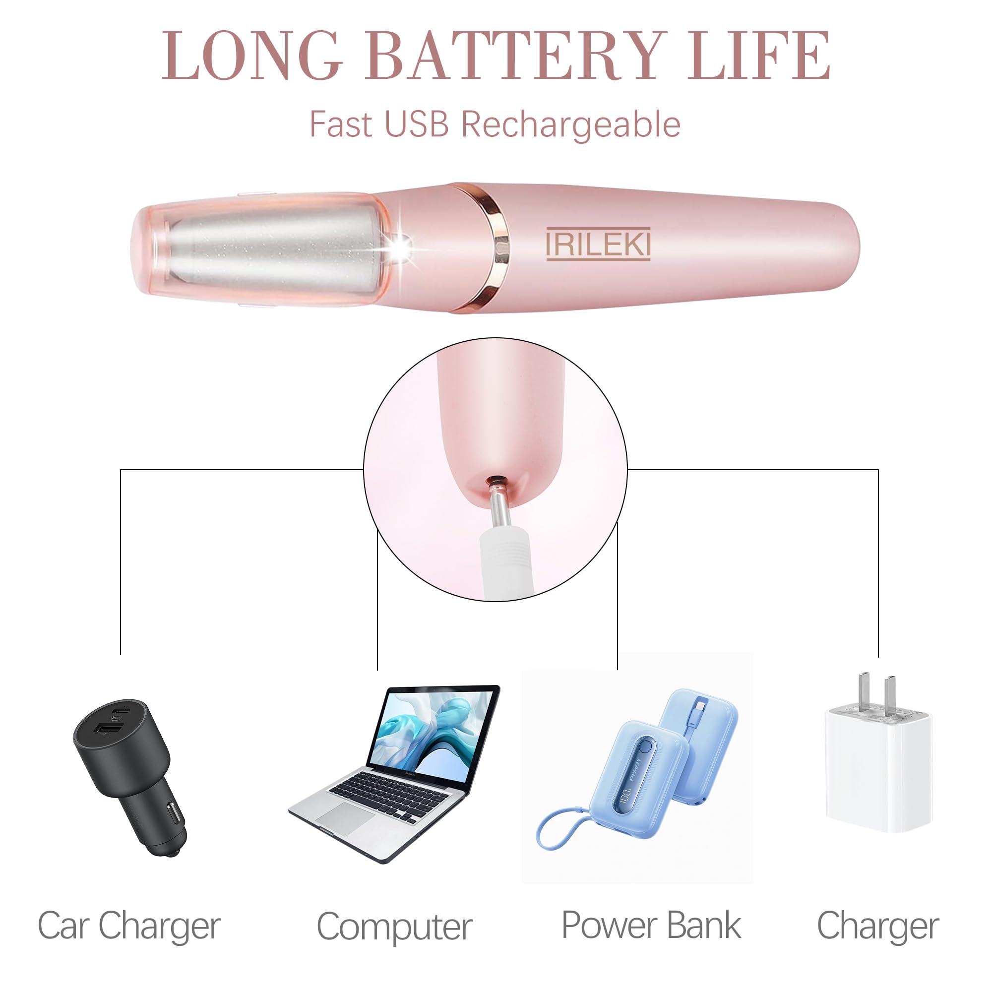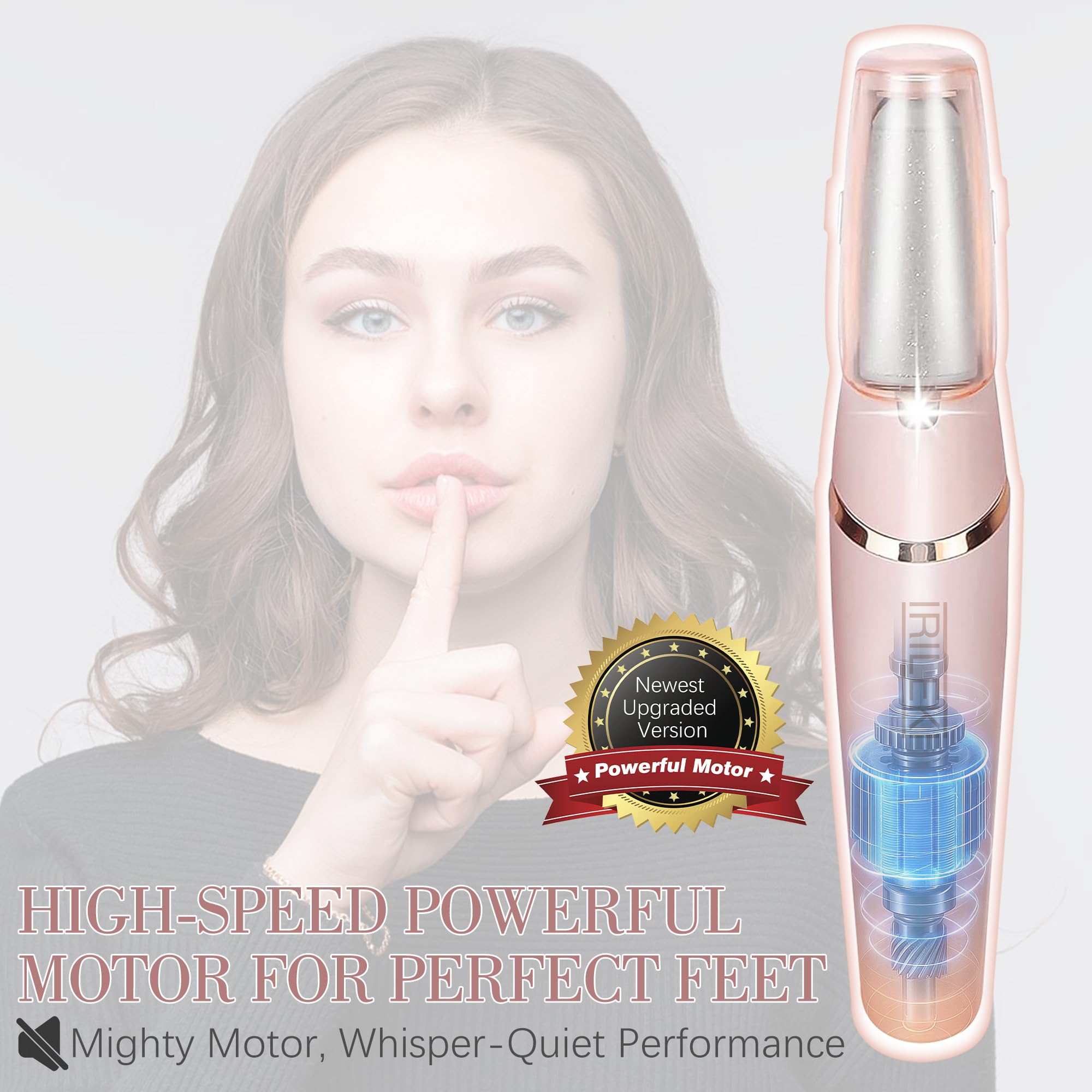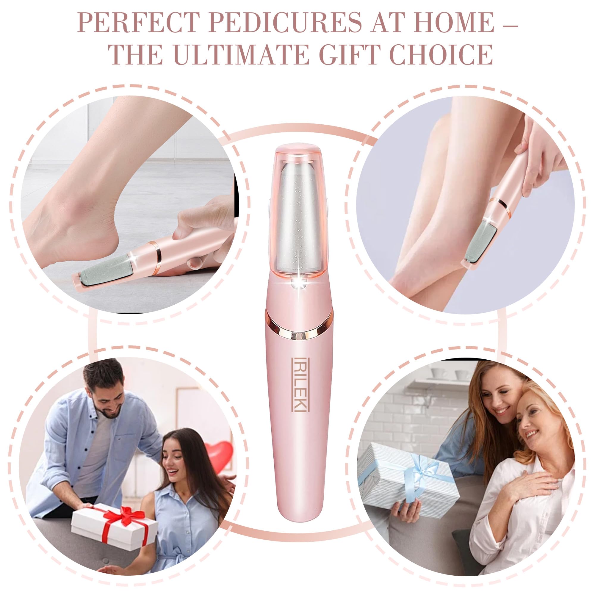 IRILEKI Elektrischer Hornhautentferner - Verbessern Sie Ihr FusspflegeerlebnisMit IRILEKI geniessen Sie jeden Tag glatte, schöne Füsse. Unser elektrischer Hornhautentferner bringt Ergebnisse in Salonqualität zu Ihnen nach Hause und macht die Fusspflege mühelos und effektiv. Das perfekte Geschenk für sich selbst oder Ihre Lieben, unterstützt von unserem Engagement für Qualität und Kundenzufriedenheit.Paket Beinhaltet: 1 x Elektrischer Fusskallusentferner 2 x Rollenköpfe 1 x Reinigungsbürste 1 x USB-LadekabelWie zu verwenden:1. Weiche deine Füsse 10-15 Minuten in warmem Wasser ein, um harte Hornhaut und trockene Haut zu mildern.2. Tupfe deine Füsse vorsichtig mit einem Handtuch trocken (optional).3. Schalten Sie den elektrischen Hornhautentferner ein und gleiten Sie ihn vorsichtig über Hornhautstellen, wobei Sie ihn nach Bedarf 1-3 Mal wiederholen.4. Tragen Sie nach dem Gebrauch eine Feuchtigkeitscreme auf, um Ihre Füsse mit Feuchtigkeit zu versorgen und eine weiche, glatte Haut zu geniessen.Hilfreiche Tipps:1. Zu Ihrer Sicherheit ist der Hornhautentferner mit einem Überlastschutzschalter ausgestattet. Wenn die Walze auf zu viel Widerstand stösst und sich länger als 3 Sekunden nicht mehr dreht, schaltet sich das Gerät automatisch aus. Schalten Sie es einfach aus und wieder ein, um den normalen Gebrauch fortzusetzen.2. Der Hochgeschwindigkeitsmotor kann während des Gebrauchs Wärme erzeugen. Um Überhitzung zu vermeiden, begrenzen Sie bitte jede Sitzung auf nicht mehr als 15 Minuten. Wenn der Hornhautentferner zu heiss wird, beenden Sie die Verwendung sofort und lassen Sie ihn abkühlen, bevor Sie ihn wieder verwenden.Ausstattung:Ausgestattet mit LED-Licht: Das eingebaute LED-Licht sorgt dafür, dass Sie das Gerät bei schlechten Lichtverhältnissen verwenden können, ohne sich Gedanken über unzureichende Sicht machen zu müssen.Hocheffizienter Schleifkopf: Der um 360 ° drehbare Schleifkopf entfernt schnell und effektiv abgestorbene Haut.Einstellbare Geschwindigkeiten: Wählen Sie zwischen 1700x / min niedriger Geschwindigkeit und 2000x / min hoher Geschwindigkeit für eine individuelle Pflege.USB wiederaufladbar: Eine vollständige Aufladung ermöglicht eine Betriebsdauer von bis zu 100 Minuten und bietet eine lang anhaltende Leistung.Ergonomisches Stabdesign: Leicht und einfach zu manövrieren, das ergonomische Design macht die Bedienung einfach und komfortabel.Perfekt für die Entfernung abgestorbener Haut und Hornhaut: Erzielen Sie mit Leichtigkeit glatte, schöne Füsse. Ein durchdachtes Geschenk für Ehefrauen, Mütter oder alle, die gerne ihre Füsse verwöhnen.