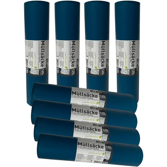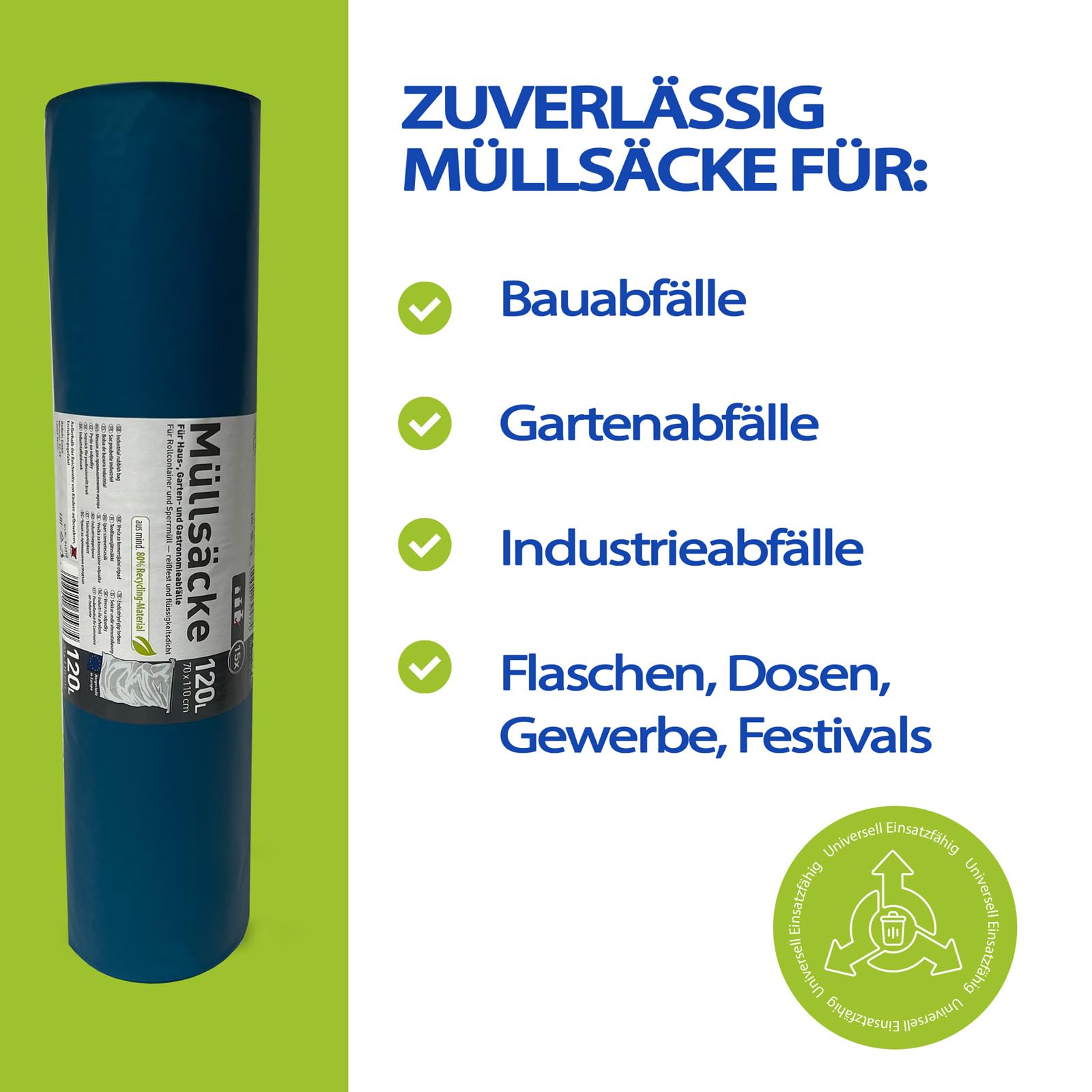 8 Rollen Schwerlast Müllsäcke, à 15 QUALITY PLUS Müllbeutel, Müllsäcke blau, Mülltüten extrem reissfest, 120l, 700x1100mm, 70my | speziell für Gewerbe, Bau, Bauschutt und Garten