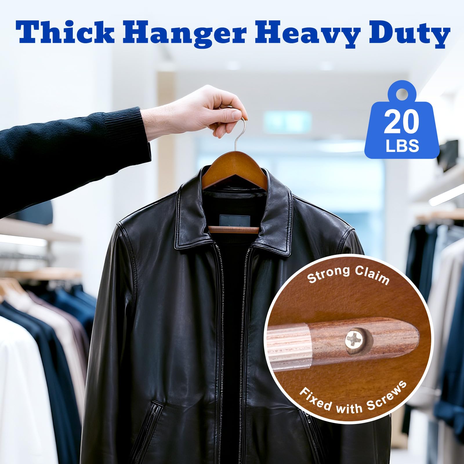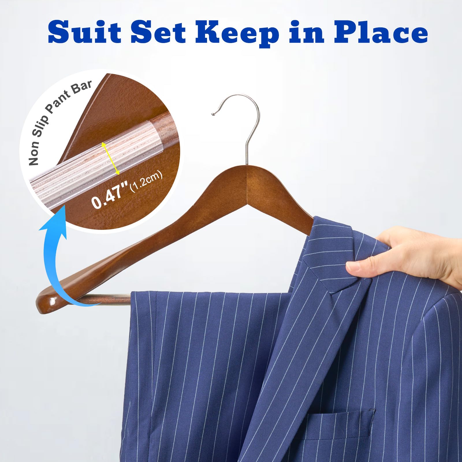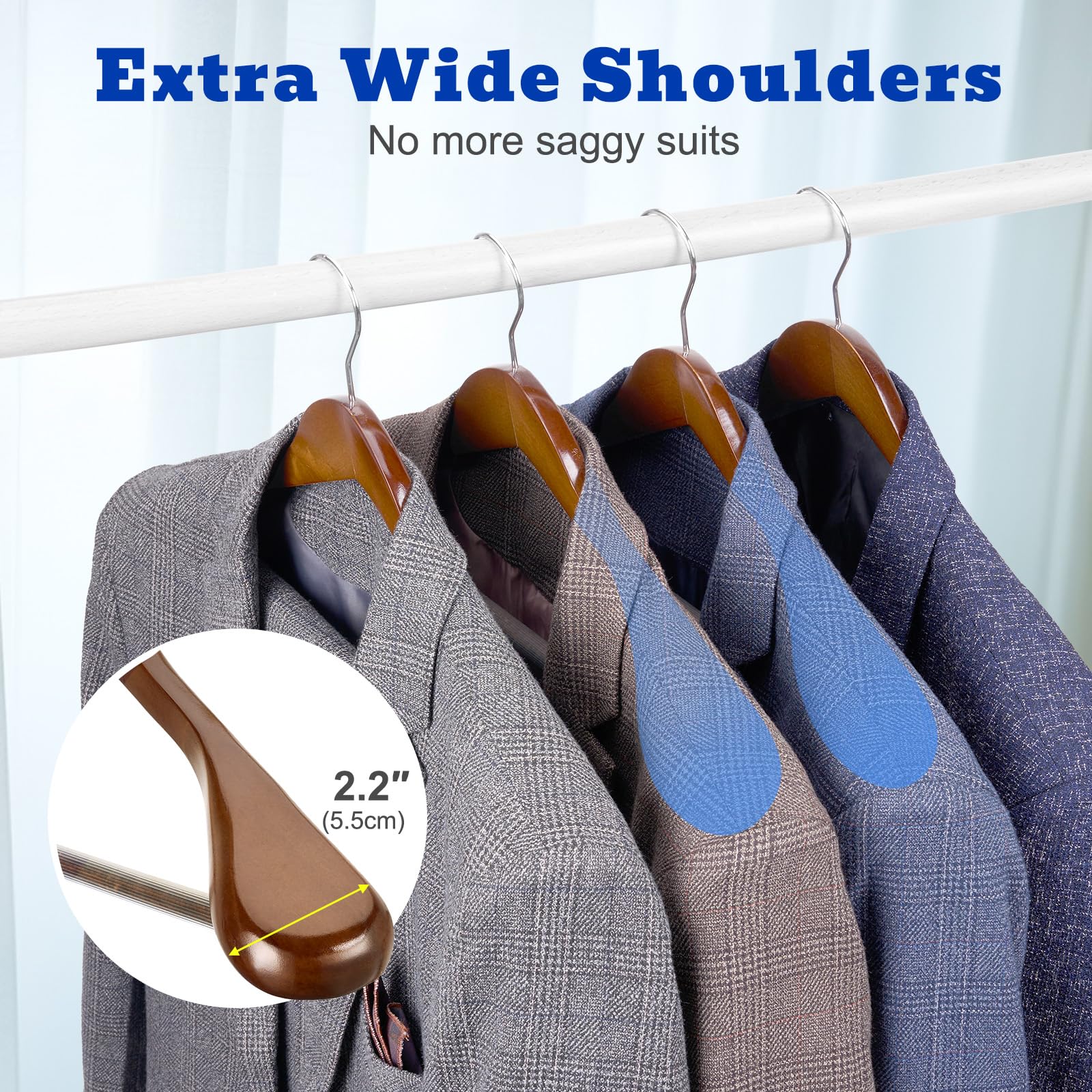 Die Kleiderbügel, die aus hochwertigem Holz herstellt sind, können die Kleidung bis 9 kg aufhängen. Die Holzbügel sind passend für Winderjacken, Mäntel, Anzüge, Kleider, Hosen, Jeans. Die Holzkleiderbügel mit grösseren Schultern sind breiter als andere Holzbügel im Markt. Die Kleiderbügel aus Holz haben drehbare Haken und Anti-Rutsch-Materialien auf der Kleiderstange, die passend zum Aufhängen der Hosen.