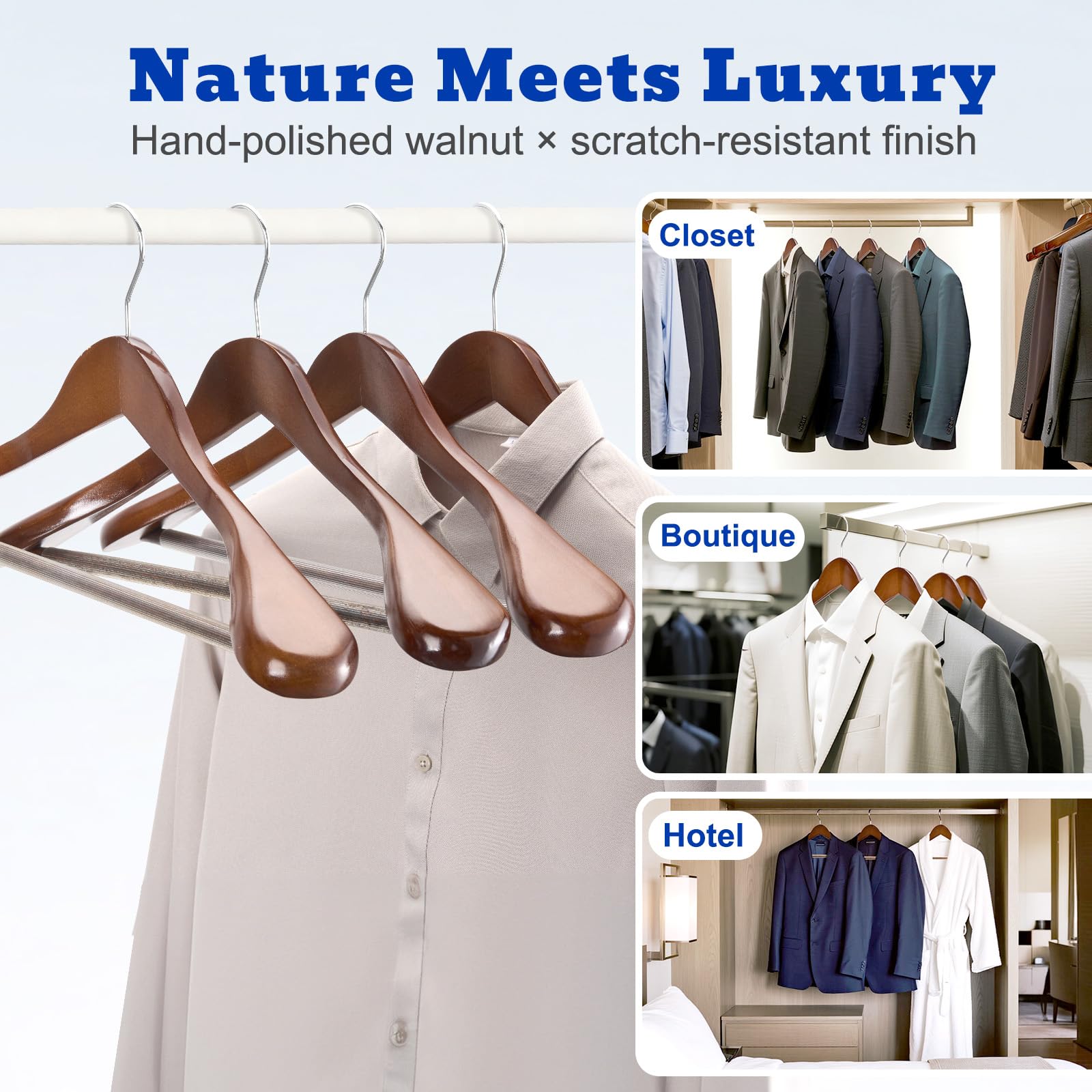 HOUSE DAY Kleiderbügel Holz Breit Walnuss 6X rutschfest Kleiderbügel Stabil Jackbügel Anzugbügel Holzbügel, Breite Schultern rutschfeste Hosenstangen Drehbare Haken