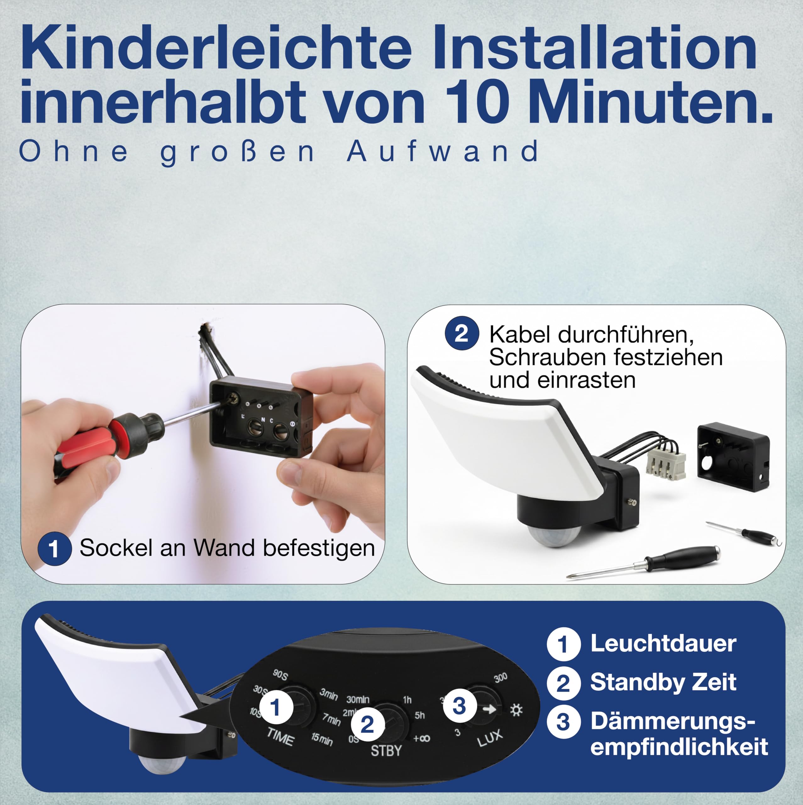Ansprechempfindlichkeit bei Dämmerung von 3 bis 2000 Lux einstellbar