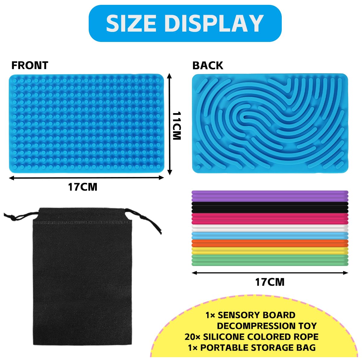 • ????【Fidget Toys Set Kinder】Dieses sensorische Fidget-Spielzeug verfügt über eine komplizierte Silikonplatte, 20 bunte Saiten,1 reisetasche.Dieses doppelseitige Fidget-Spielzeug ist reisefreundlich, kompakt, leicht und tragbar.