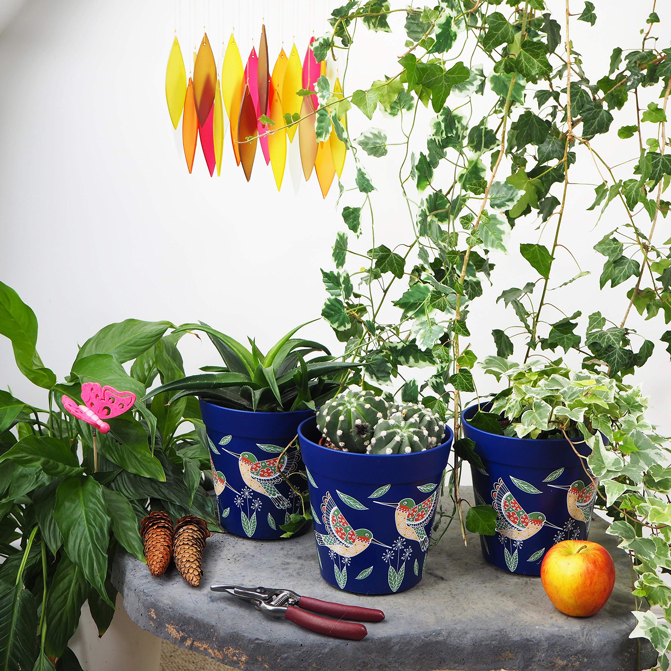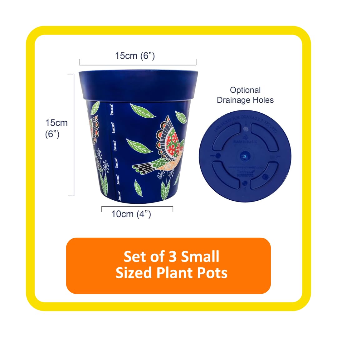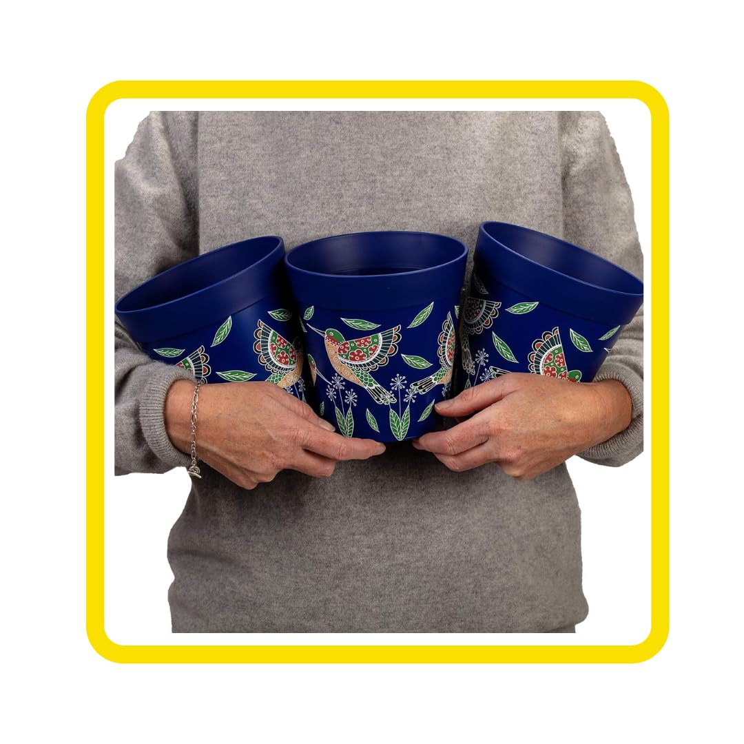 Hum Flowerpots, 15cm, 3er-Set, in Verschiedenen Farben und Mustern, Blumentöpfe aus Kunststoff für Drinnen und Draussen, Blaue Kolibris