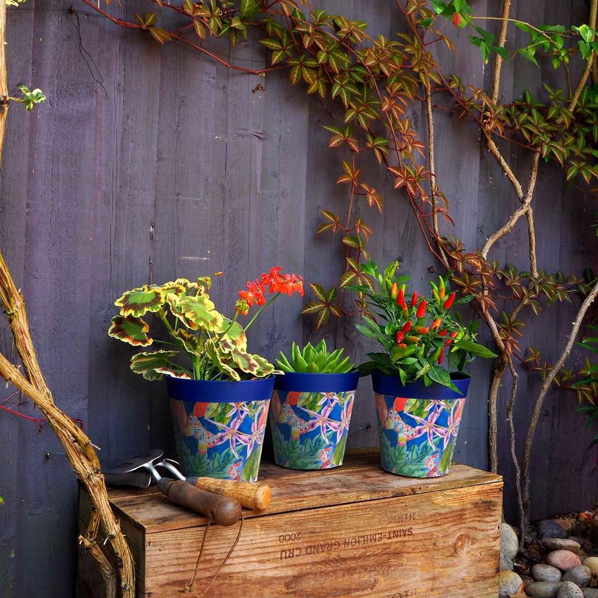 Set mit 3 Pflanztöpfen aus Kunststoff für drinnen und draussen, 15 cm, mit einem botanischen Muster mit blauen Blättern. Keine Ablauflöcher.