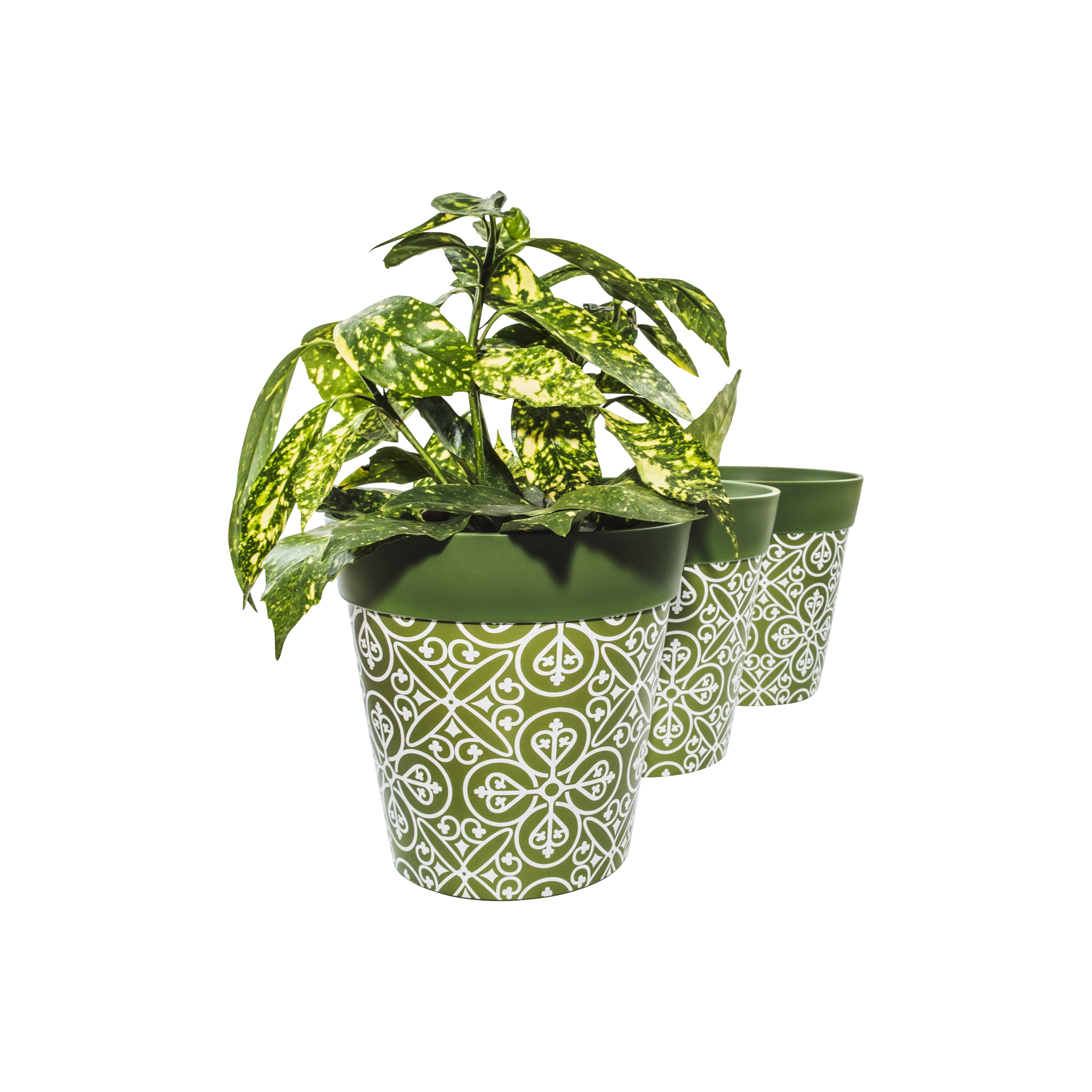 3er-Set Pflanzgefässe aus Kunststoff für den Innen- und Aussenbereich, 22 cm, marokkanisches grünes geometrisches Muster. Keine Abflusslöcher.