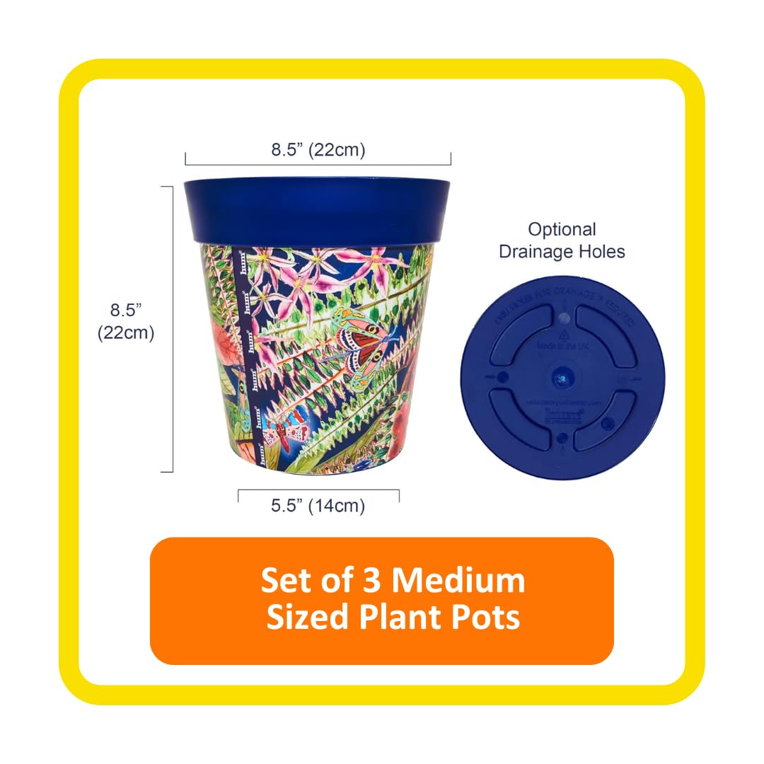 Aus farbbeständigem und frostbeständigem Kunststoff, dieses bunte Pflanzgefäss-Set mit 3 Blumentöpfen kann sowohl im Innen- als auch im Aussenbereich verwendet werden. Höhe 22 cm, Durchmesser 22 cm, mit einem Fassungsvermögen von 5 Litern. Diese wunderschönen Töpfe sind sehr praktisch, da sie langlebig, leicht zu reinigen und leicht sind. Sie werden Ihre Terrasse oder Ihren Balkon verschönern, egal ob als Pflanzenanbau, Übertöpfe oder als dekoratives Wohnaccessoire. Sie haben keine Abflusslöcher, sondern haben auf der Unterseite Abdrücke zum Durchstechen. Entworfen und hergestellt im Vereinigten Königreich. Die Blumentöpfe von Hum sind in verschiedenen Farben und Mustern sowie in verschiedenen Grössen erhältlich, um für kleine, mittelgrosse und grosse Pflanzen zu passen. Passende Untersetzer in Rosa, Blau und Grün sind ebenfalls im Sortiment erhältlich.