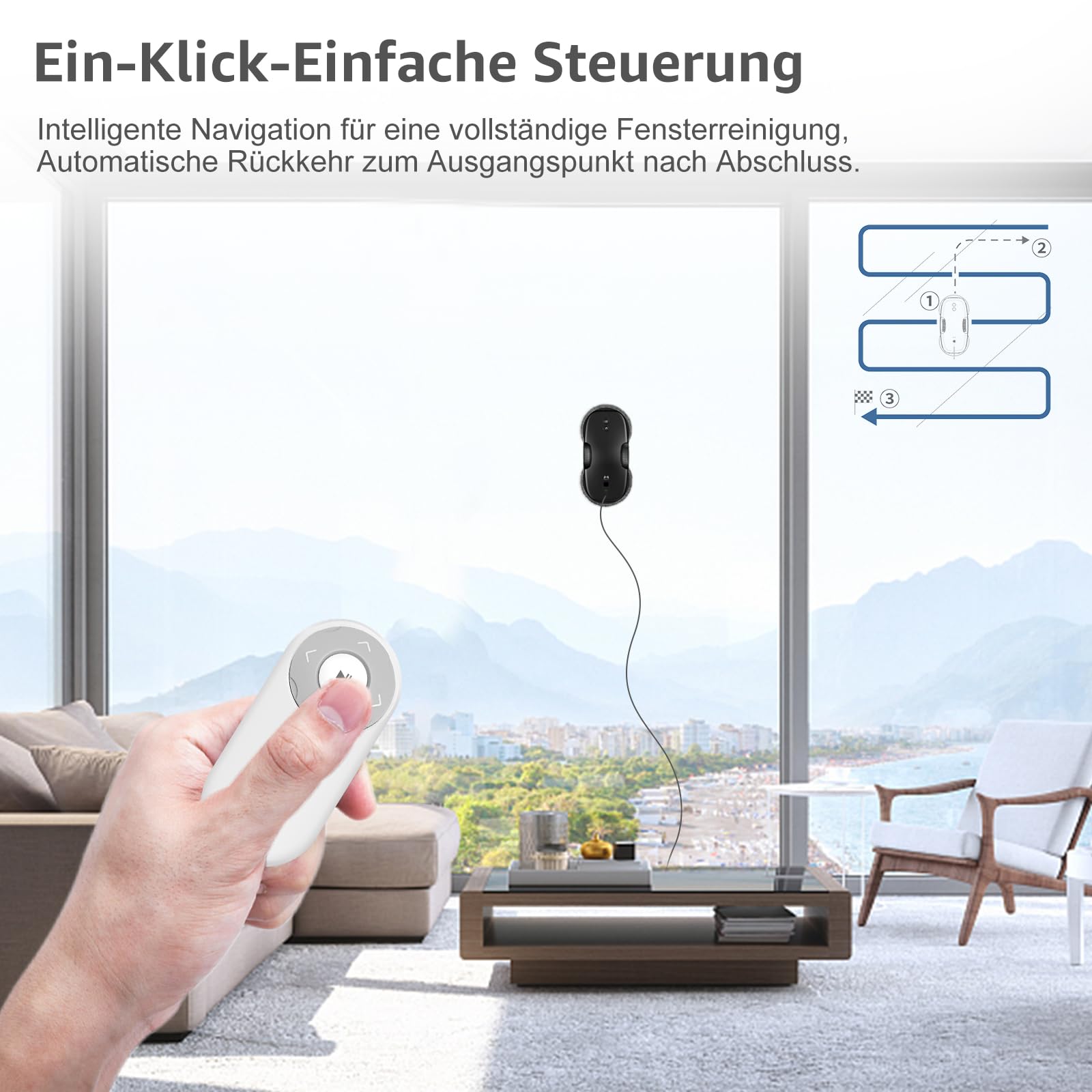 • 【Intelligente Routenplanung】 Sie können die Schriftarten N, Z, N-Z per Fernbedienung auswählen,Intelligente Planung von Reinigungsrouten. Gleichzeitig kann es die Grenze erkennen, auch wenn es sich um rahmenloses Glas handelt, kann es auch normal funktionieren.