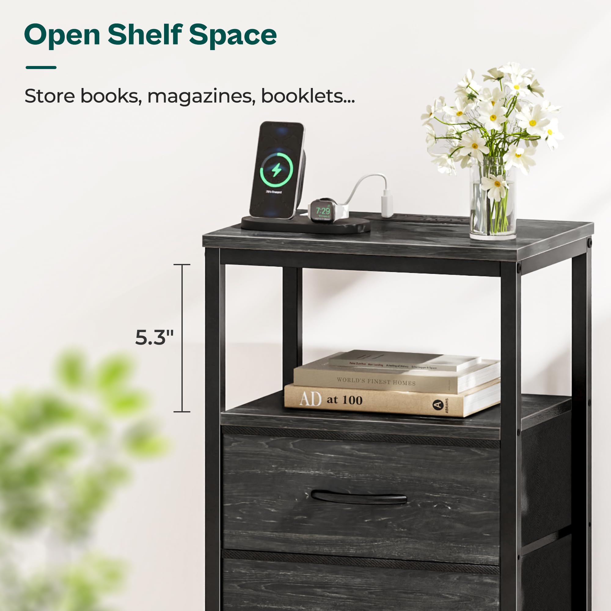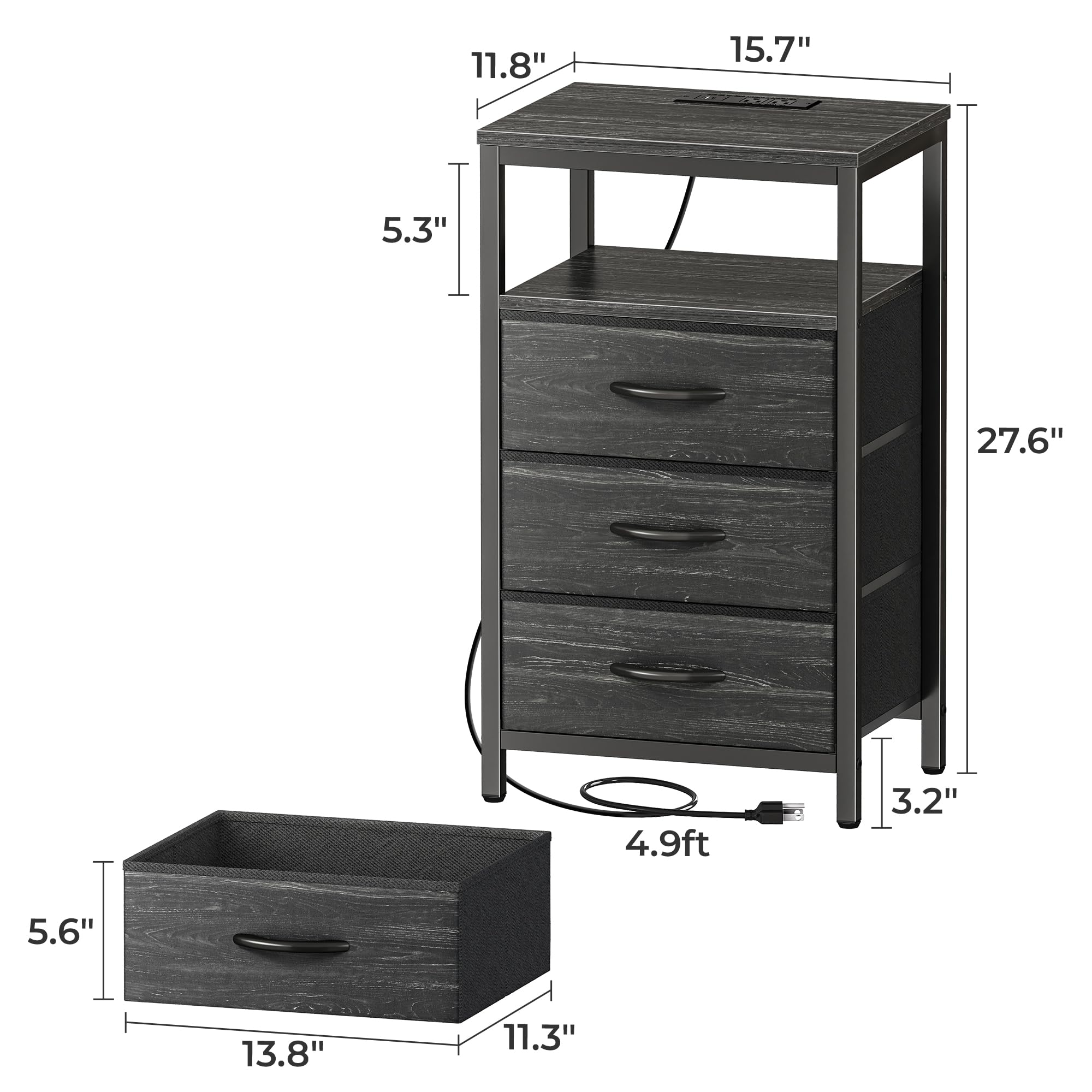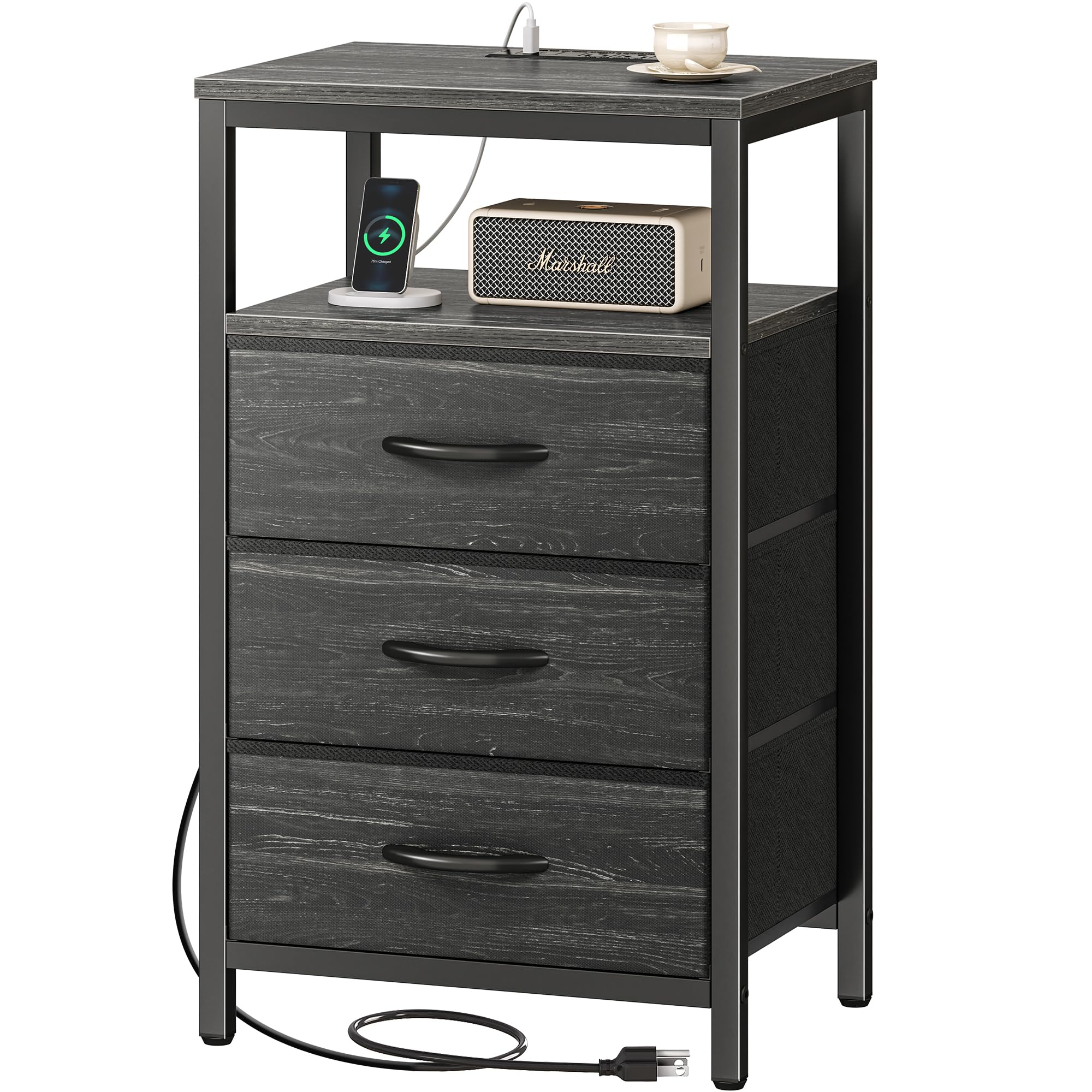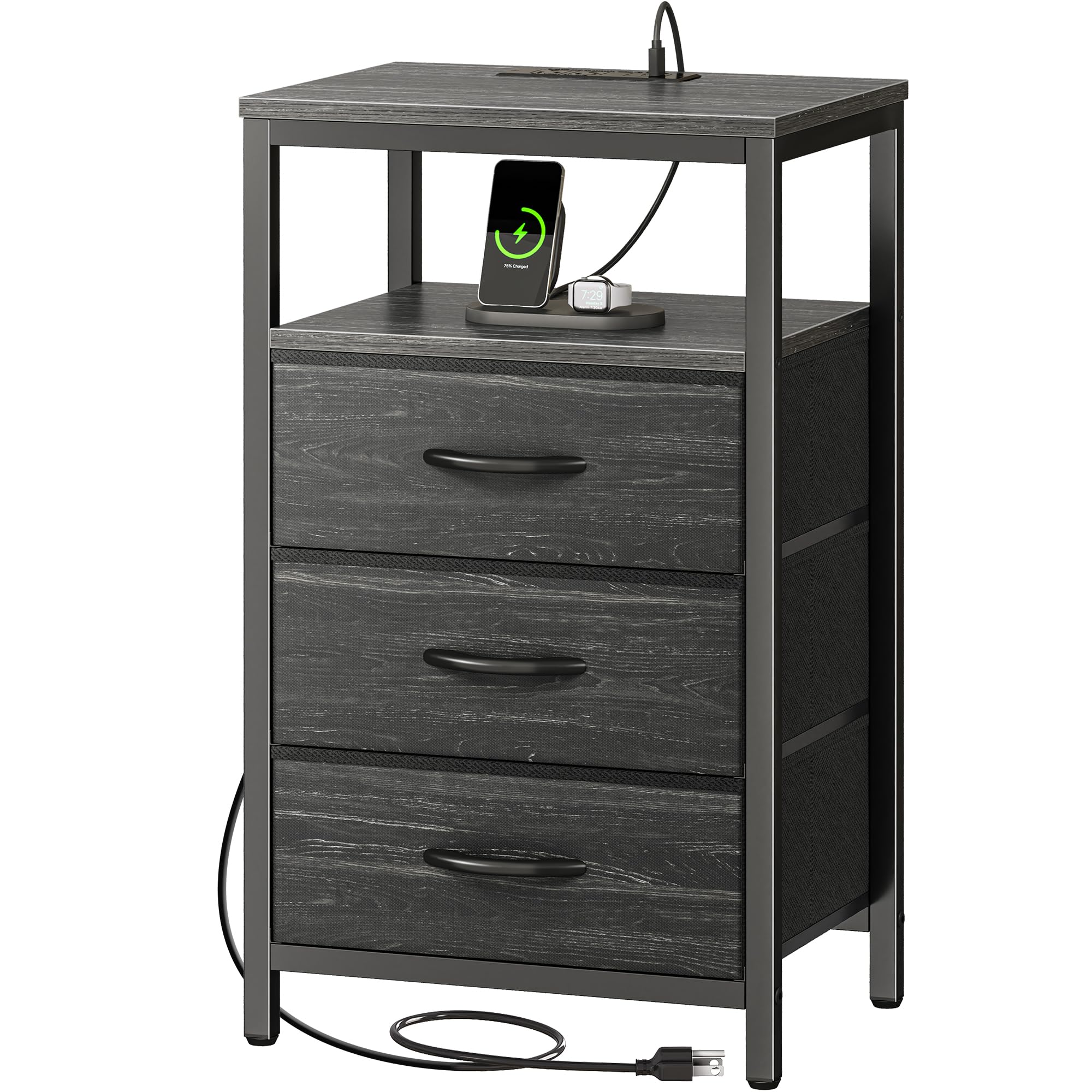 Huuger Nachttisch mit Ladestation, 27,6 Zoll Beistelltisch Nachttisch mit USB-Anschlüssen und Steckdosen, Nachttisch für Schlafzimmer, Stoffschubladen, Holzkohleschwarz Holzmaserung Druck
