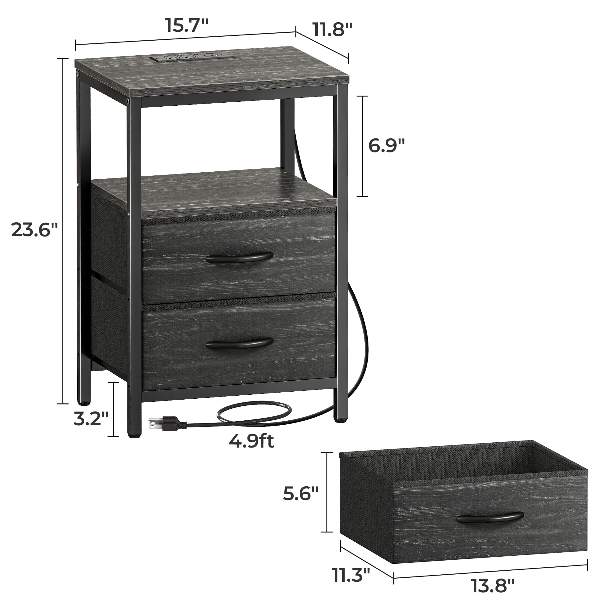 Huuger Nachttisch mit Ladestation, Stoffschubladen, Beistelltisch mit offenem Regal, Nachttisch mit USB-Anschlüssen und Steckdosen, Nachttisch für Schlafzimmer, Holzkohleschwarz Holzmaserung Druck